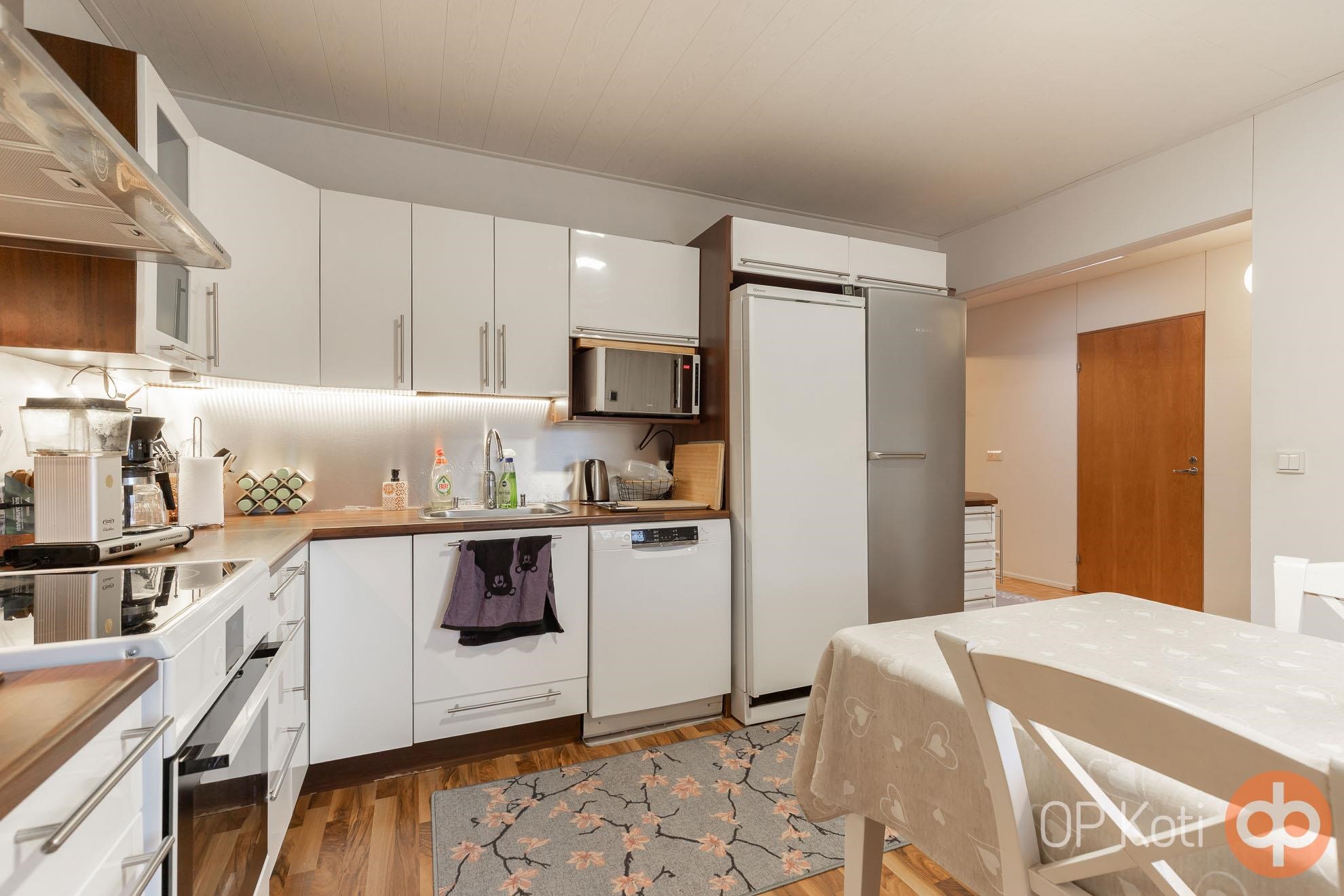 - Jääkaappi Gran, pakastekaappi Bosch, erillisuuni, liesitaso Induktio, liesituuletin, astianpesukone Bosch, kaapistot Keittiötukun kaapit, pöytätasojen materiaali Laminaatti. Keittiöremontti 2007, keittiötukun kaapisto, kodinkoneet luetelttuna varustelistauksessa.
