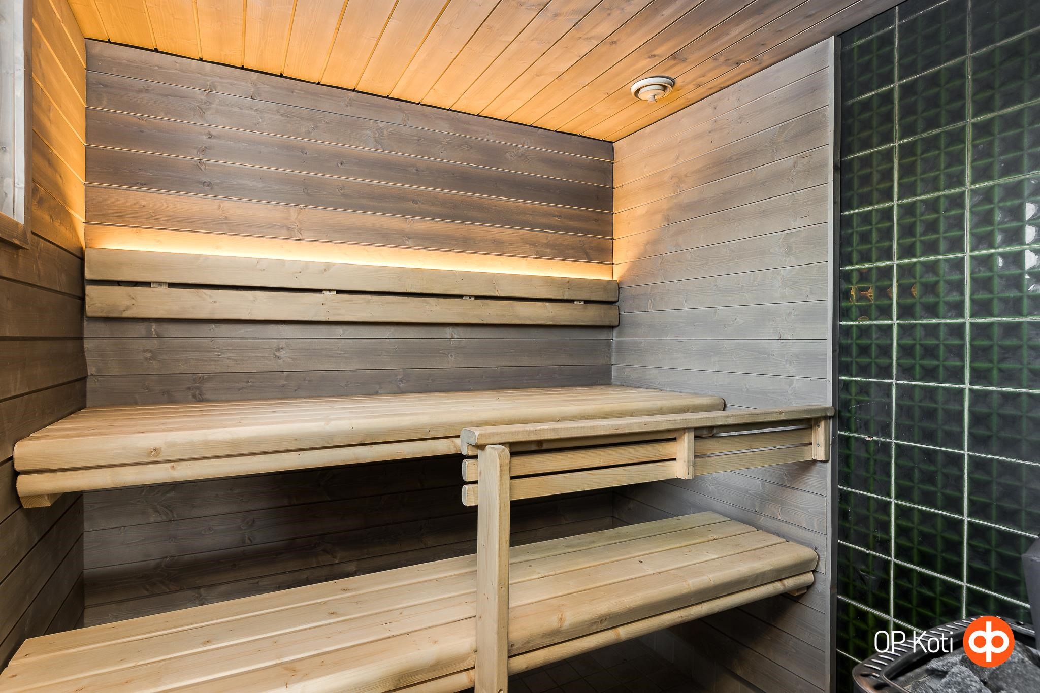 - Sauna, puukiuas, kylpyhuone, erillinen wc, suihku, peilit, kaapit, allaskaappi, pesukoneliitäntä, lattialämmitys pesuhuone, sauna ja khh, kiinteät valaisimet.