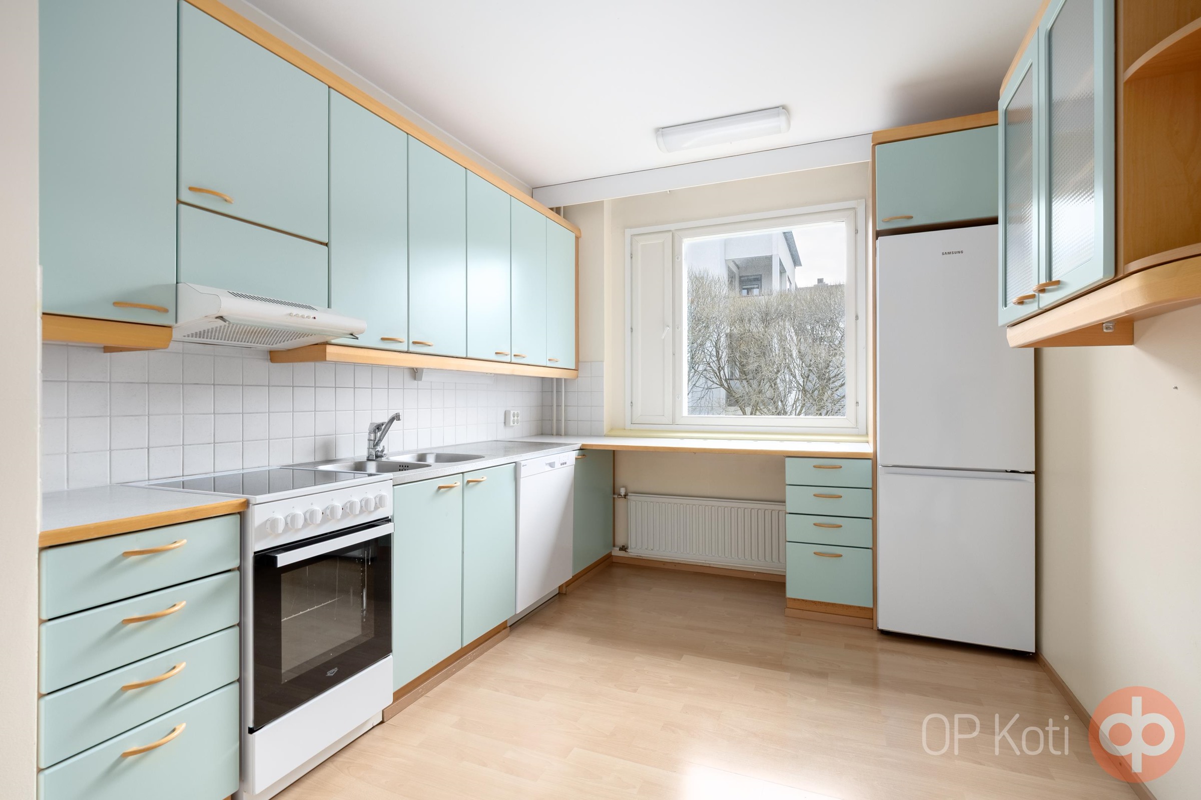 - Jääkaappipakastin, keraaminen liesi turvaliesi, liesituuletin, astianpesukone, kaapistot, kiinteät valaisimet.