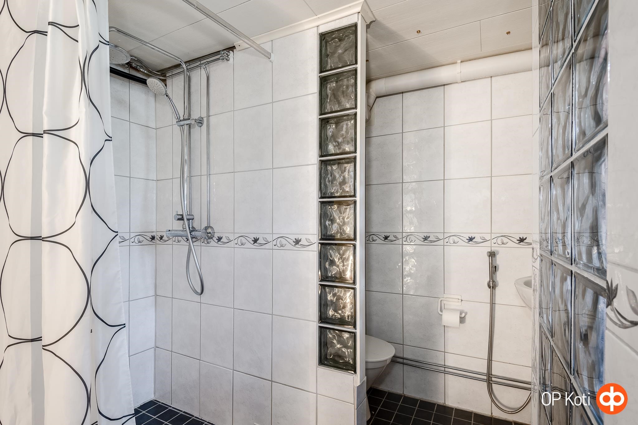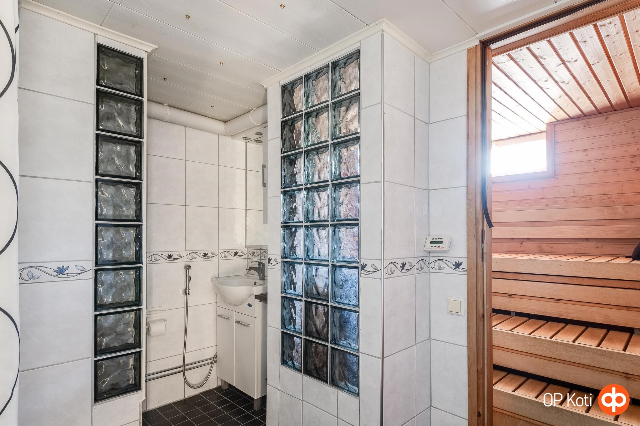 - Sauna, sähkökiuas, kylpyhuone 2 kpl, suihkuseinä yläkerran kph:ssa, peilit kellarissa, peilikaappi yläkerran kph:ssa, allaskaappi, pesukoneliitäntä yläkerran kph:ssa, lattialämmitys, kiinteät valaisimet. Yläkerran kylpyhuone remontoitu 2020. Kellaritilan pesu- ja saunatilat 2009.