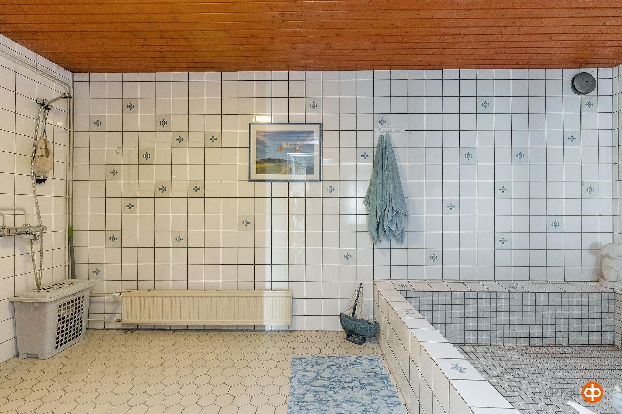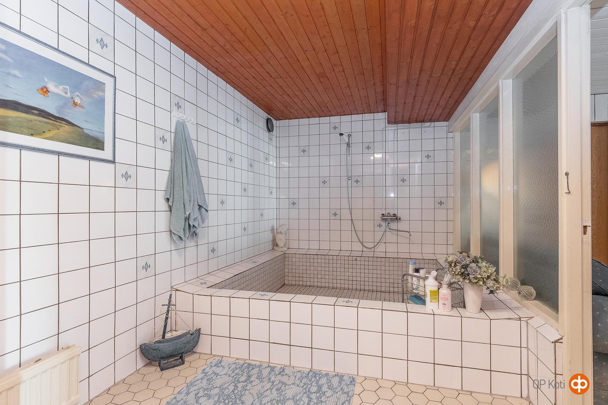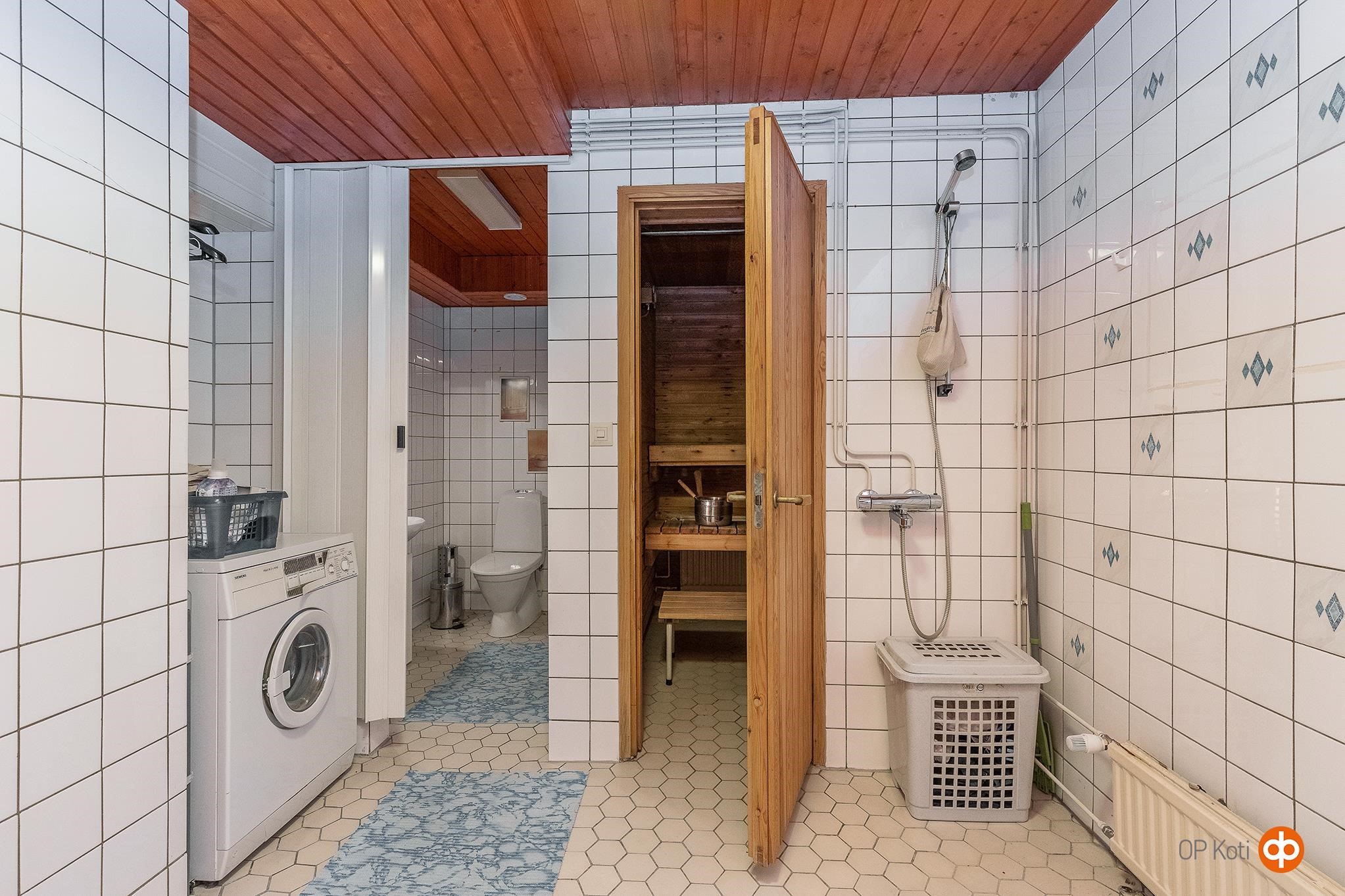 - Sauna, sähkökiuas, kylpyhuone, erillinen wc, suihku 2 kpl, peilikaappi, allaskaappi, pesukoneliitäntä, lattialämmitys, kiinteät valaisimet.