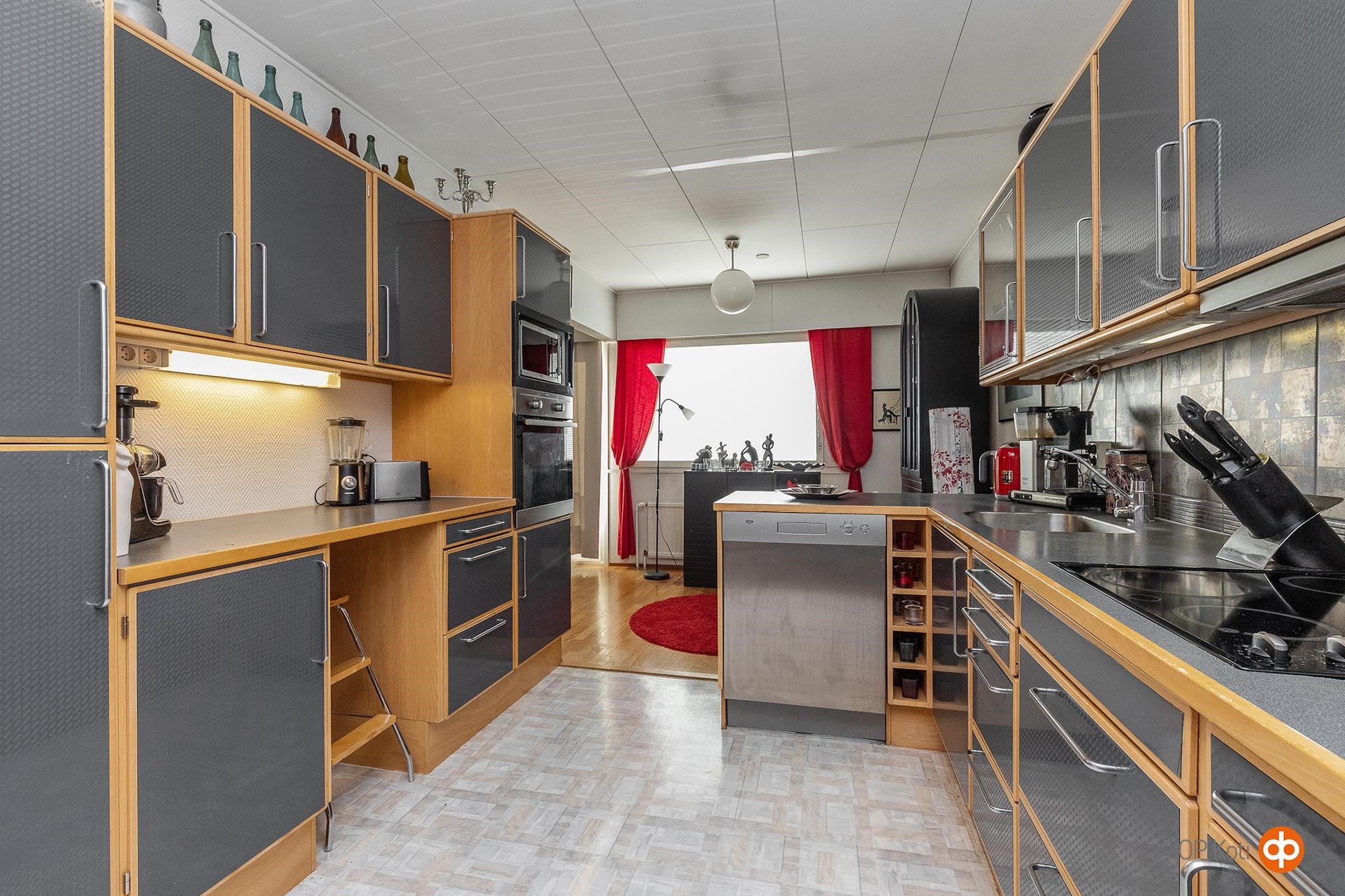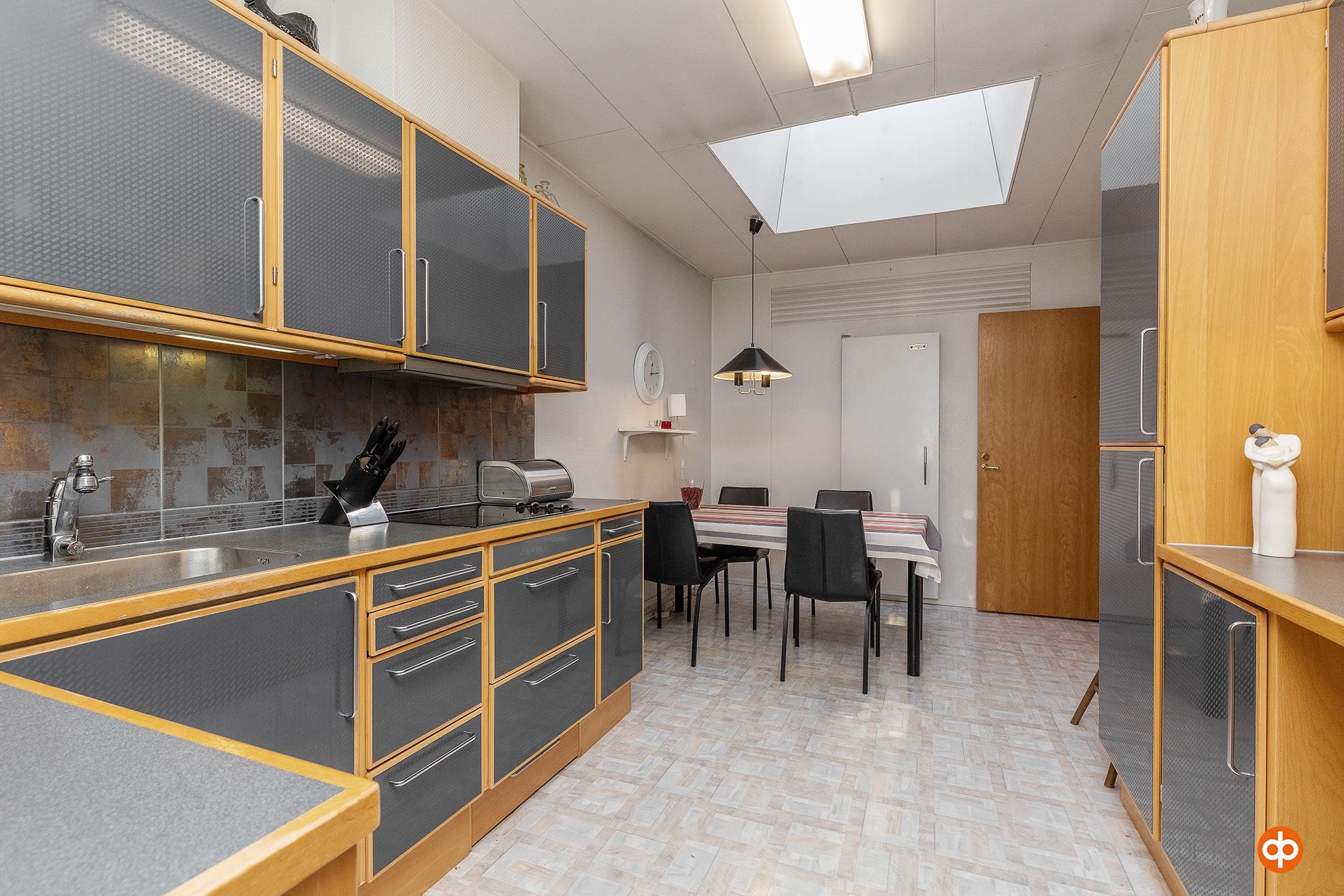 - Jääkaappipakastin Integroitu, kylmiö, erillisuuni, liesitaso, keraaminen liesi, liesituuletin, astianpesukone, kaapistot, kiinteät valaisimet, Keittiön tasot laminaattia.