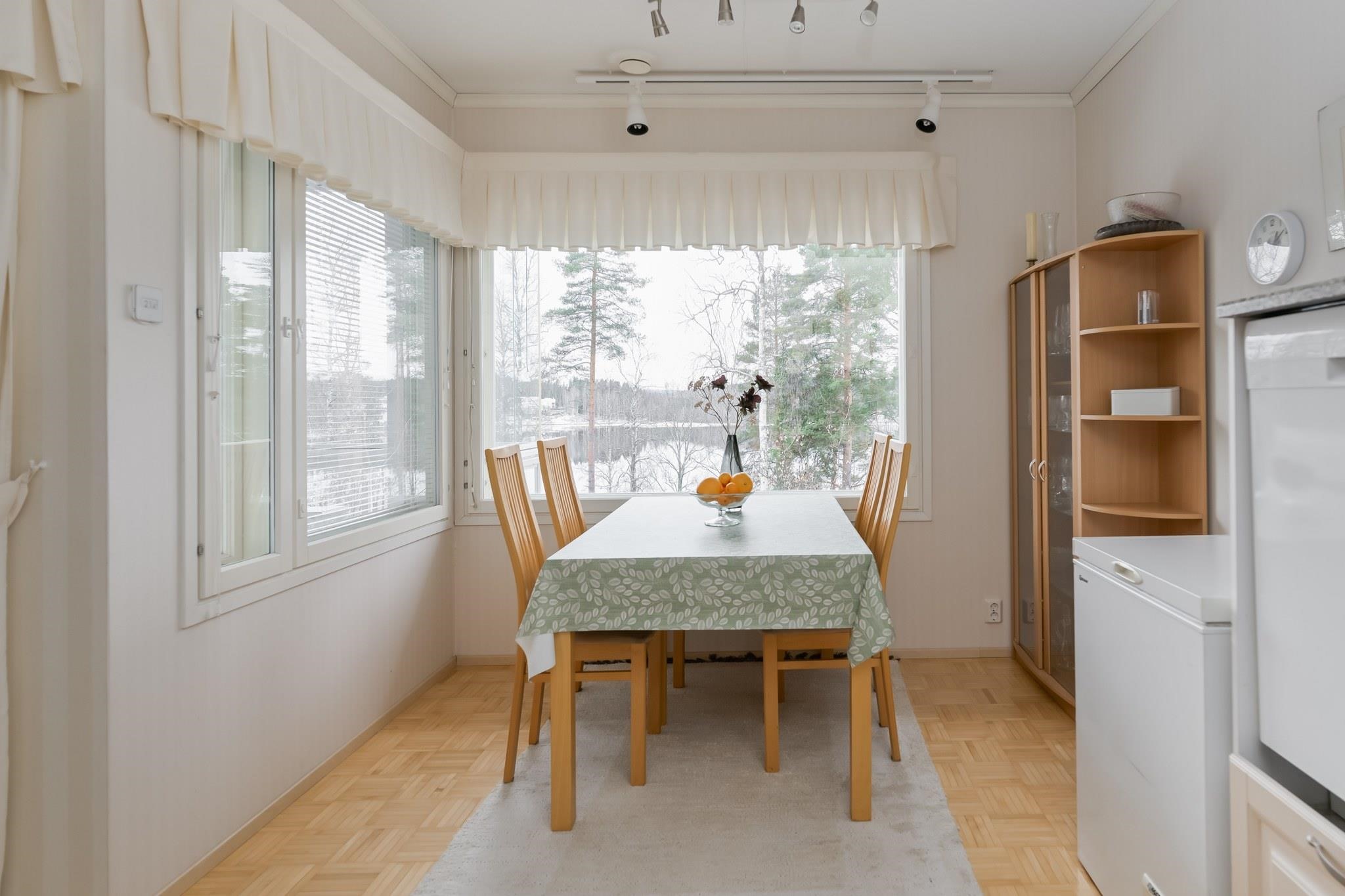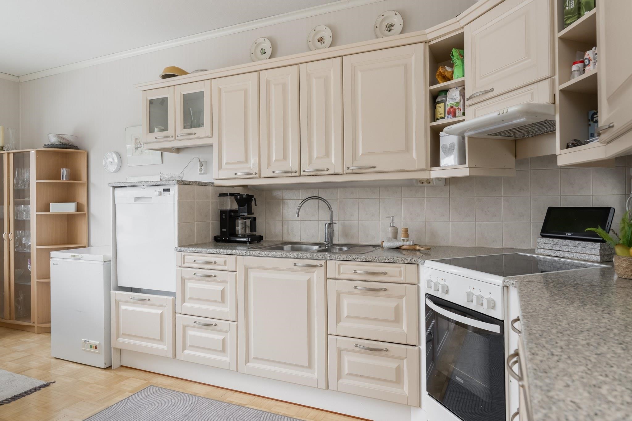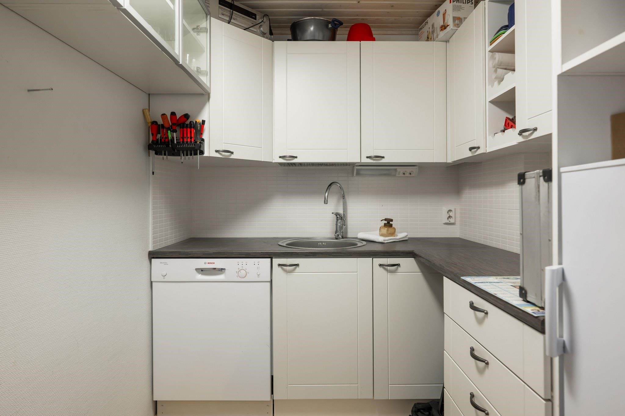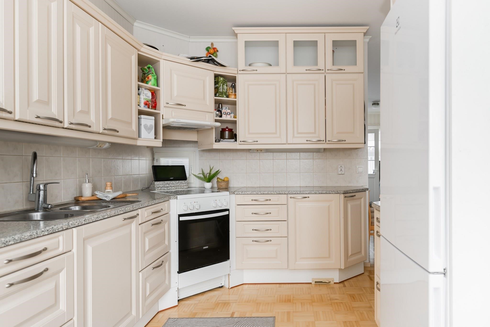 - Jääkaappi (alakerrassa), jääkaappipakastin (keittiössä), erillisuuni, keraaminen liesi, liesituuletin, astianpesukone (keittiössä ja alakerran apukeittiössä), kaapistot. Keittiön jääkaappipakastin uusittu keväällä 2025