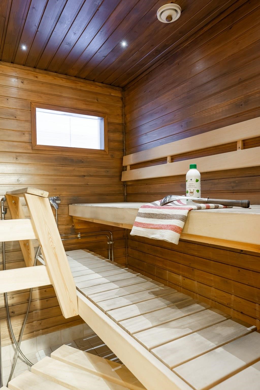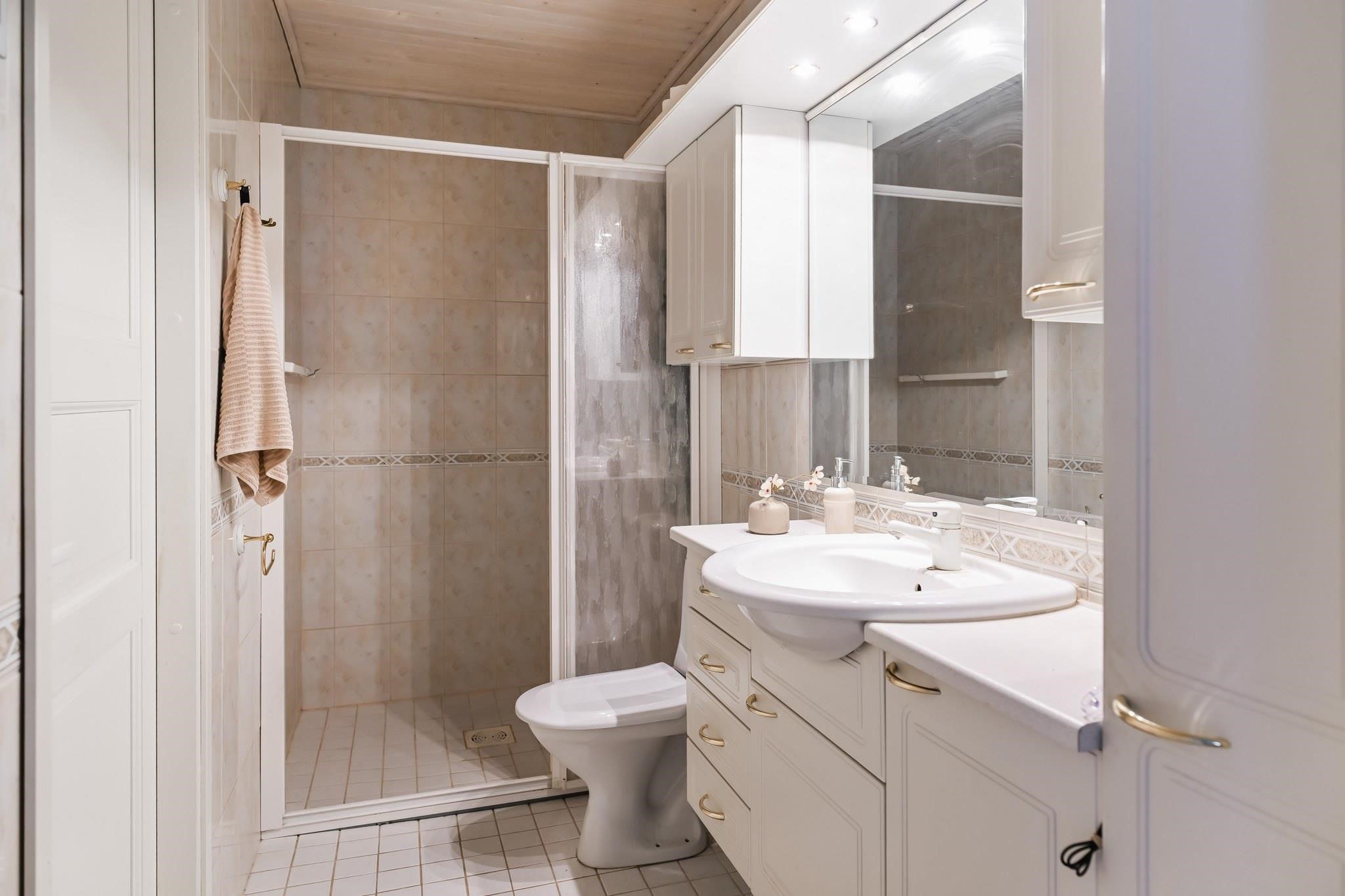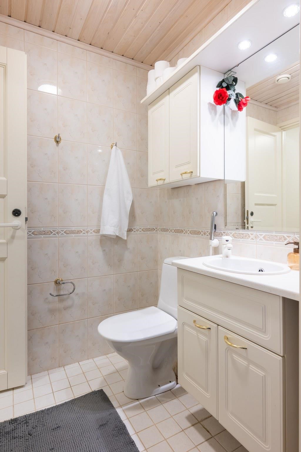 - Sauna, sähkökiuas (Ainavalmiskiuas uusittu noin 5v.sitten), kylpyhuone, erillinen wc (ylä- ja alakerrassa), suihku (alakerrassa kaksi kpl ja yläkerran wc:ssä), peilit (yläkerran wc:ssä), peilikaappi (alakerran wc:ssä), kaapit, allaskaappi (molemmissa wc:ssä), pesukoneliitäntä, lattialämmitys, kiinteät valaisimet.