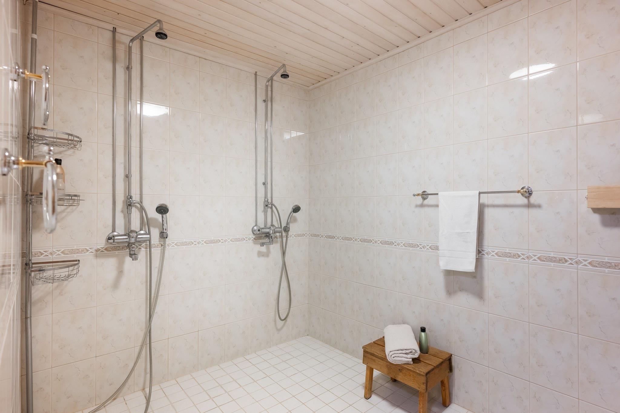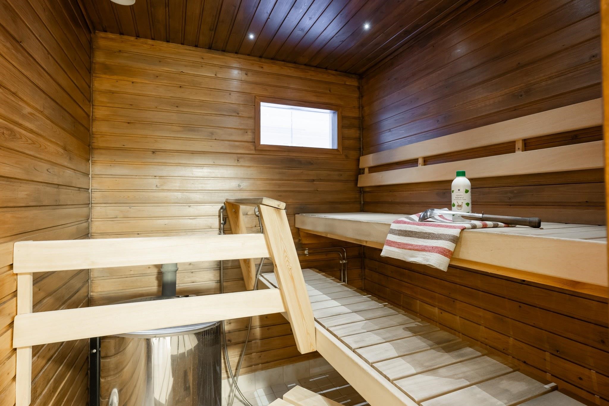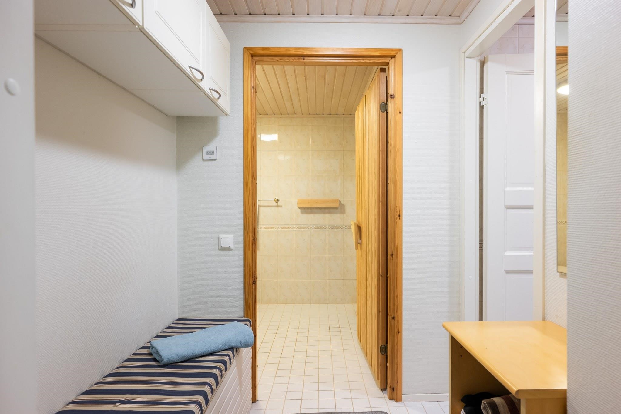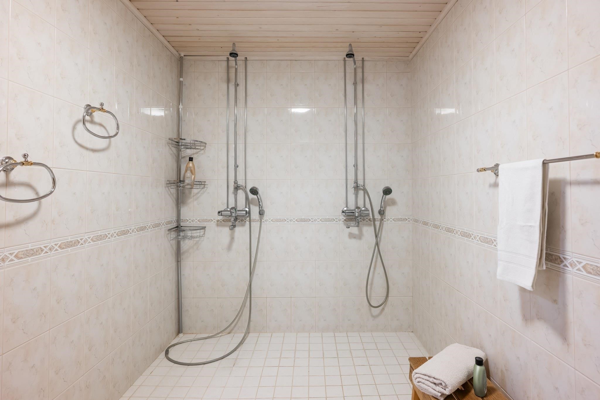 - Sauna, sähkökiuas (Ainavalmiskiuas uusittu noin 5v.sitten), kylpyhuone, erillinen wc (ylä- ja alakerrassa), suihku (alakerrassa kaksi kpl ja yläkerran wc:ssä), peilit (yläkerran wc:ssä), peilikaappi (alakerran wc:ssä), kaapit, allaskaappi (molemmissa wc:ssä), pesukoneliitäntä, lattialämmitys, kiinteät valaisimet.