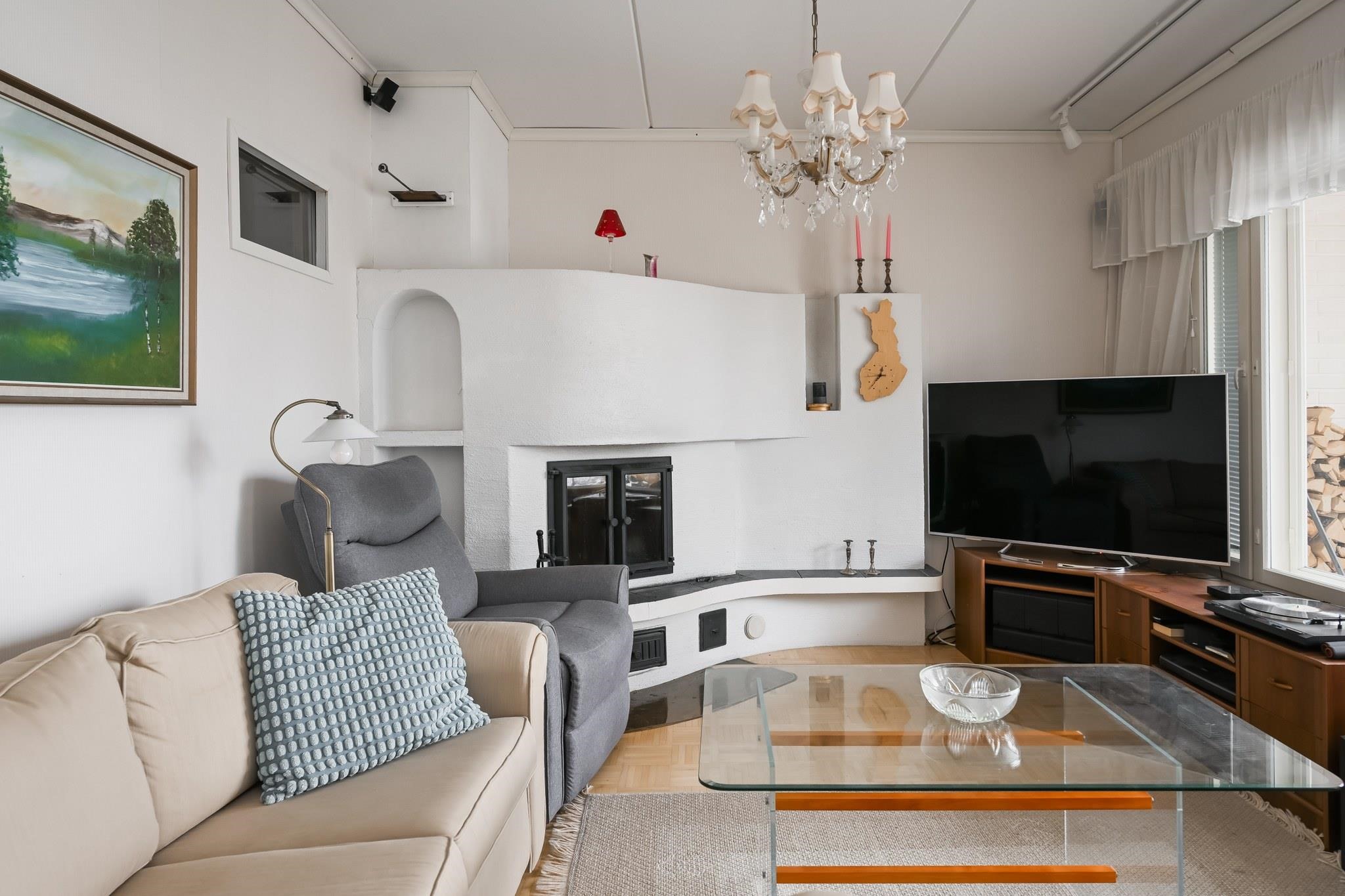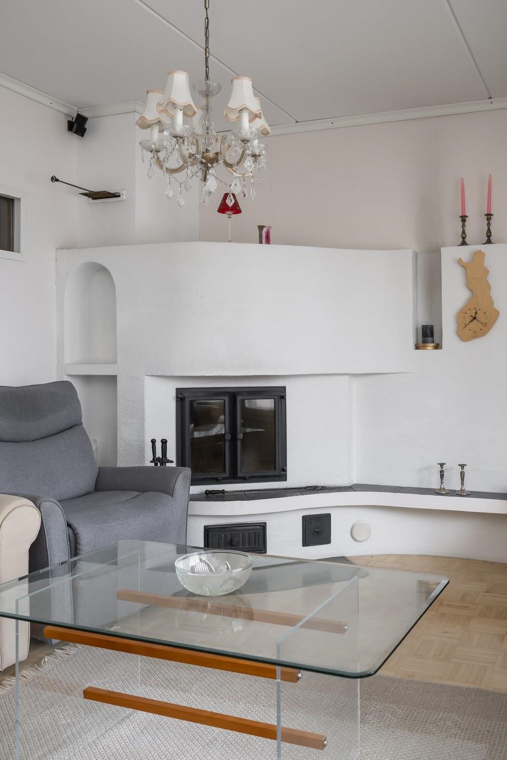 - Keittiö: Lattia parketti / seinät tapetti ja välitila laatta. Olohuone: Lattia parketti / seinät tapetti. Makuuhuone 1: Lattia parketti / seinät tapetti. Makuuhuone 2: Lattia parketti / seinät tapetti. Kodinhoitohuone: Lattia laatta / seinät maalattu lasikuitutapetti ja välitila laatta. Sauna: Lattia laatta / seinät puupaneeli. Kylpyhuone: Lattia laatta / seinät laatta. Eteinen: Lattia parketti / seinät tapetti. Wc: Lattia laatta / seinät laatta. Alakerran wc: Lattia laatta / seinät laatta. Apukeittiö: Lattia parketti / seinät tapetti. Takkahuone: Lattia parketti / seinät tapetti.
