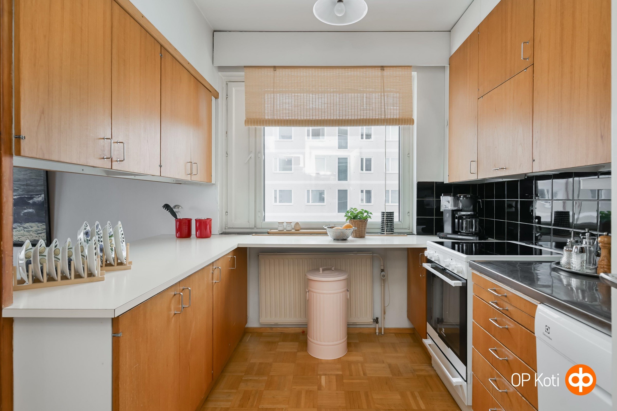 - Jääkaappipakastin, keraaminen liesi, liesikupu, astianpesukone, kaapistot, kiinteät valaisimet.