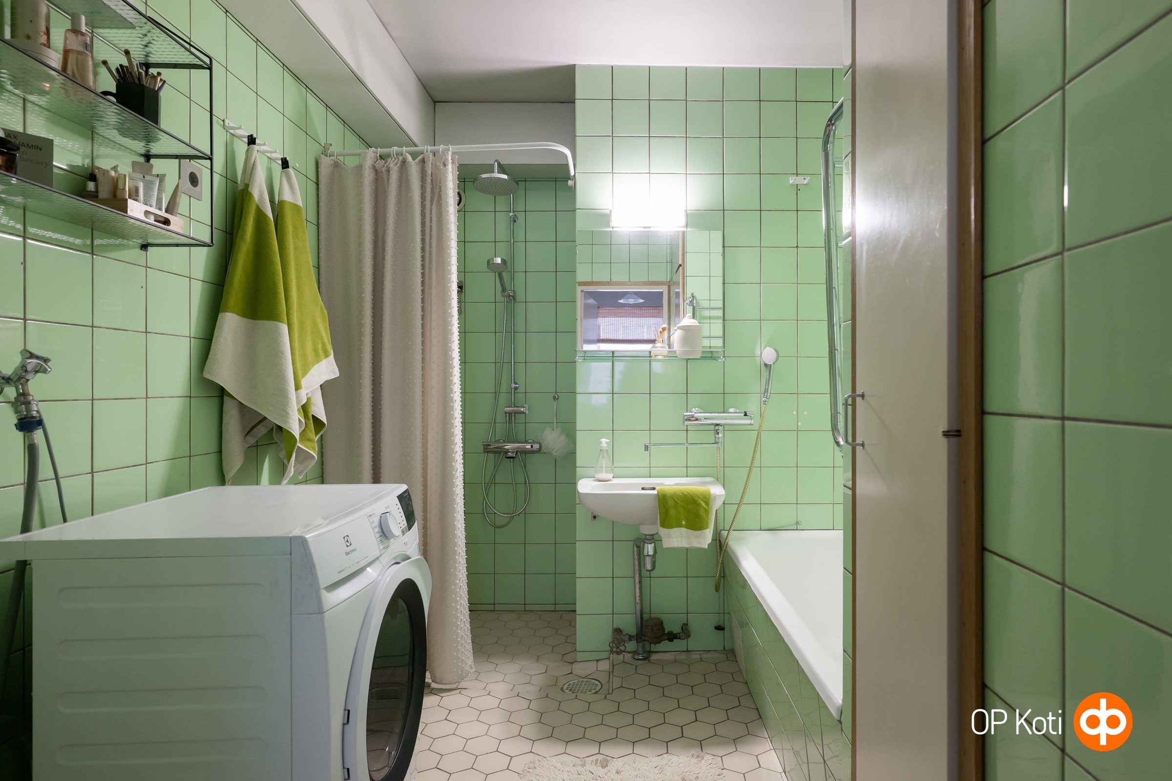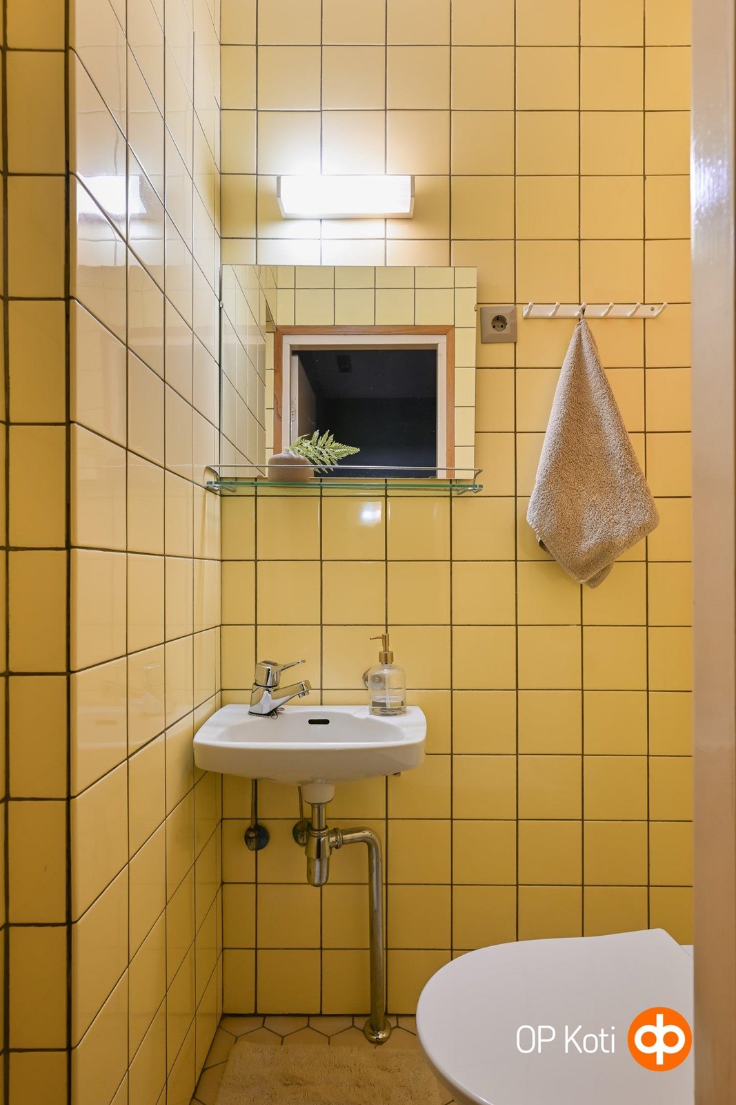 - Kylpyhuone (WC-istuin kylpyhuoneessa), erillinen wc, suihku (uusittu 2024), amme (kylpyhuoneessa), peilit (kylpyhuoneessa ja WC:ssä), kaapit (kylpyhuoneessa), pesukoneliitäntä (kylpyhuoneessa), kiinteät valaisimet (kylpyhuoneessa ja WC:ssä).