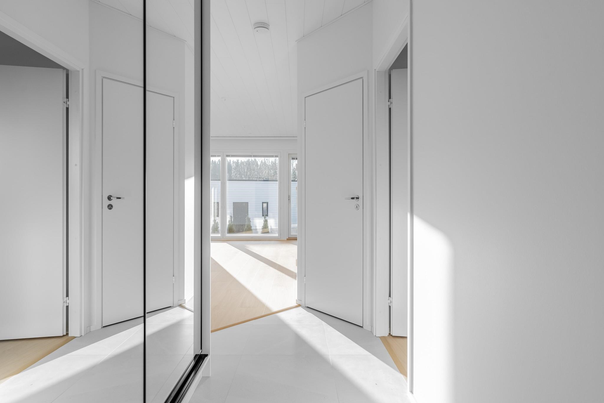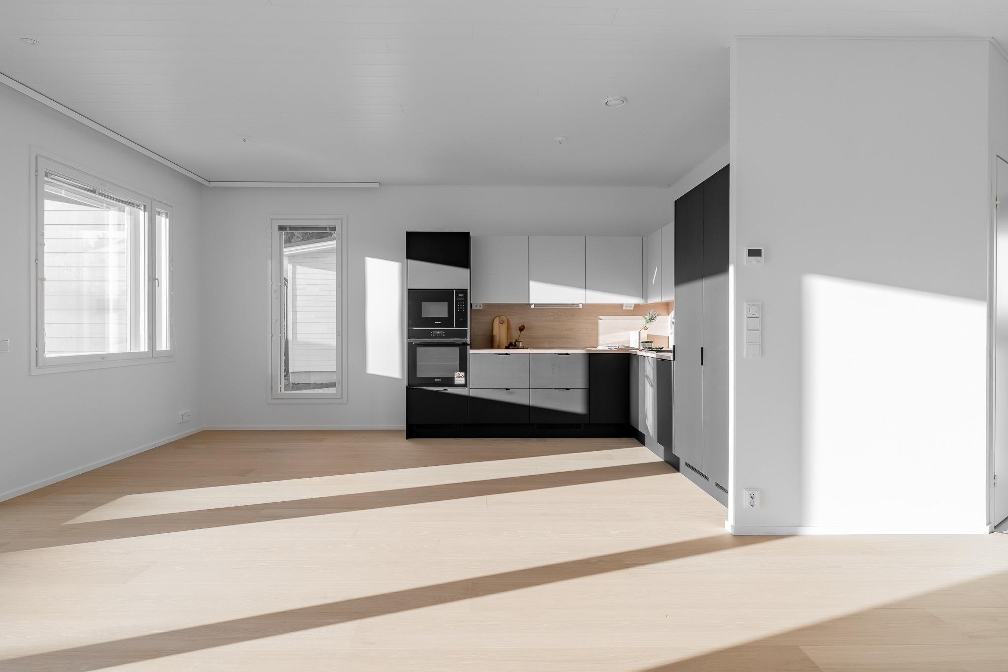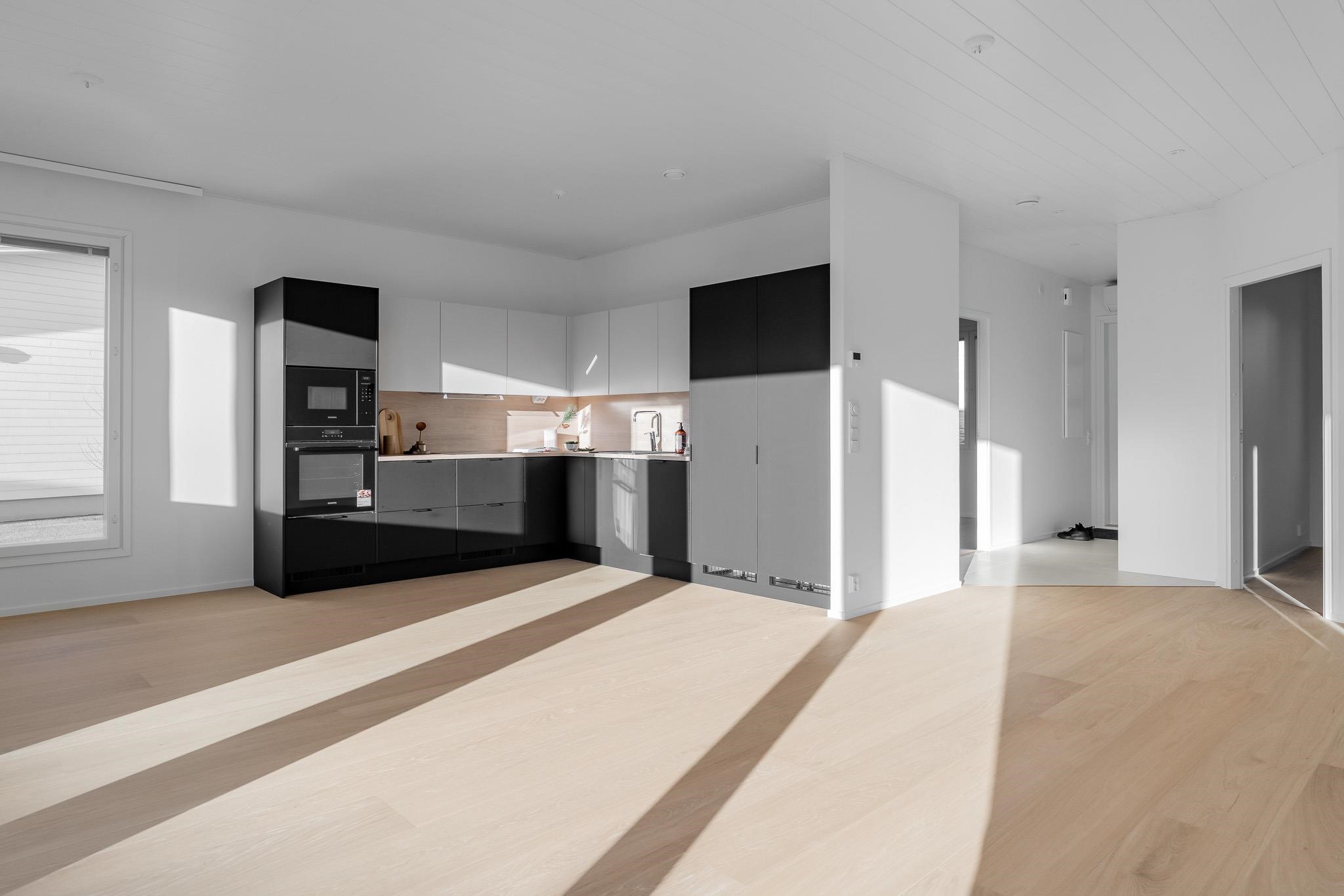 Kodista löydät valoisan ja avaran olohuoneen, joka yhdistyy tyylikkääseen avokeittiöön. Luonnonvalo on erityisen kauniisti läsnä, koska ikkunat avautuvat kahteen suuntaan. Makuuhuoneet sijoittuvat omaan rauhaansa, kukin omalle puolelleen asuntoa. Erillinen WC ja käytännölliset säilytysratkaisut auttavat arjen sujumisessa. Etelän puoleinen terassi on mahdollista lasittaa.