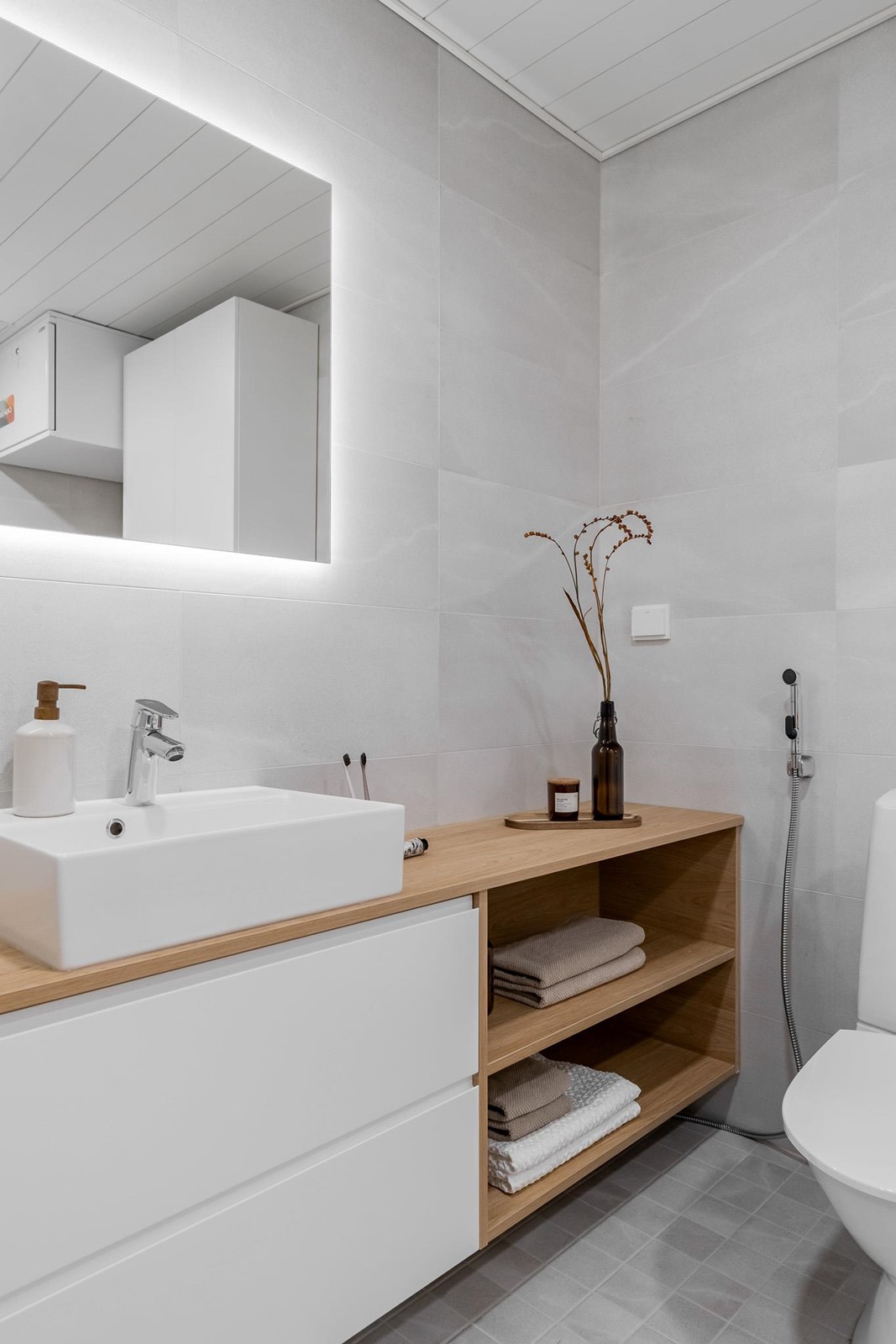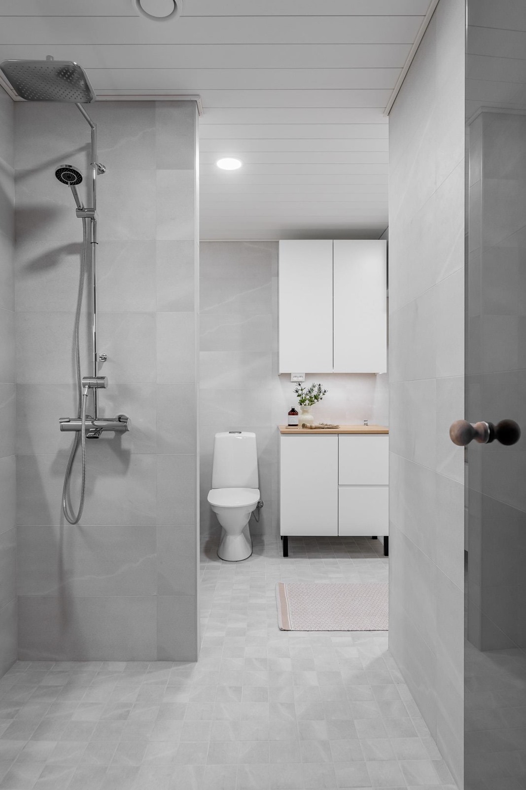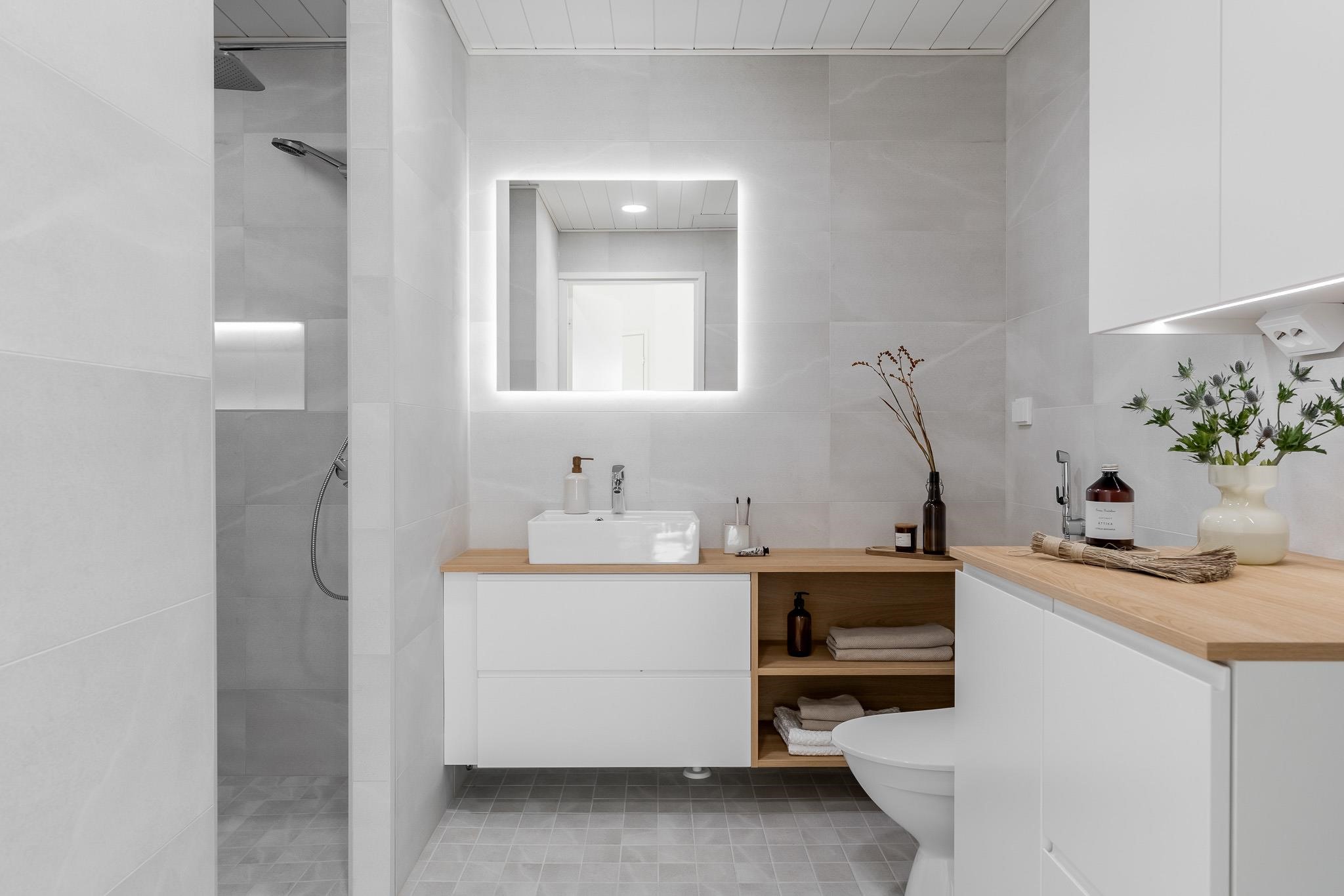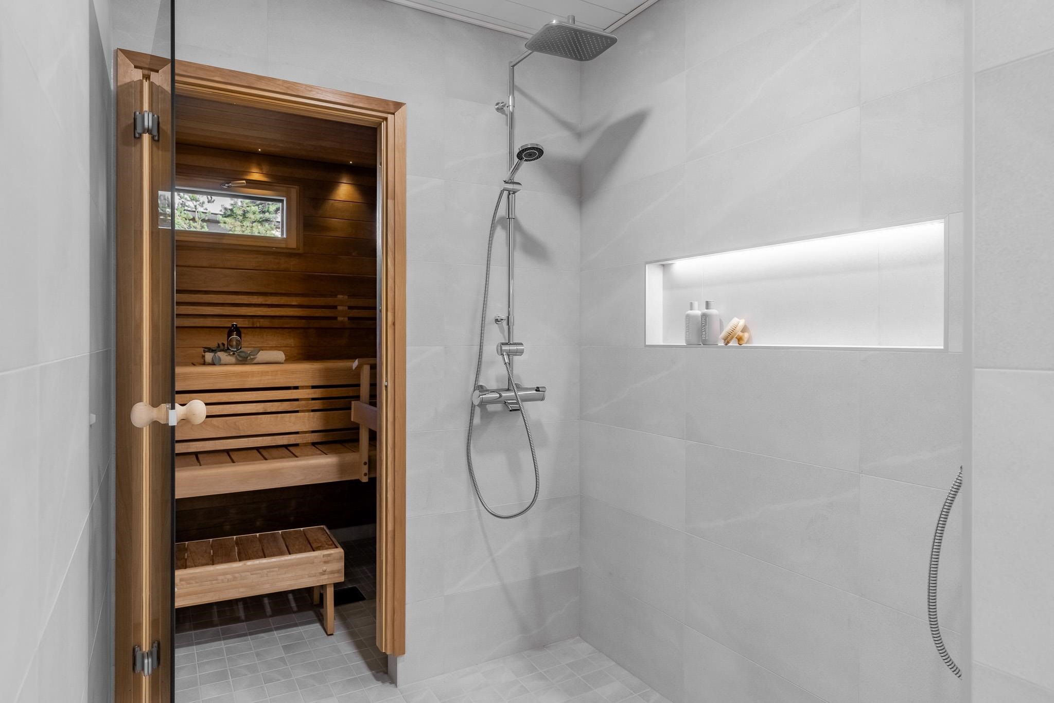 - Sauna, sähkökiuas Harvia, kylpyhuone, erillinen wc, suihku, suihkuseinä on lasia ja taittuva, peilit, peilikaappi, kaapit, allaskaappi, pesukoneliitäntä, lattialämmitys, kiinteät valaisimet. Kylpyhuoneessa on myös sähkötoiminen lattialämmitys. Koko huoneistossa on vesikiertoinen lattialämmitys, kylpyhuoneessa on mahdollisuus käyttää myös sähköistä lämmitystä.