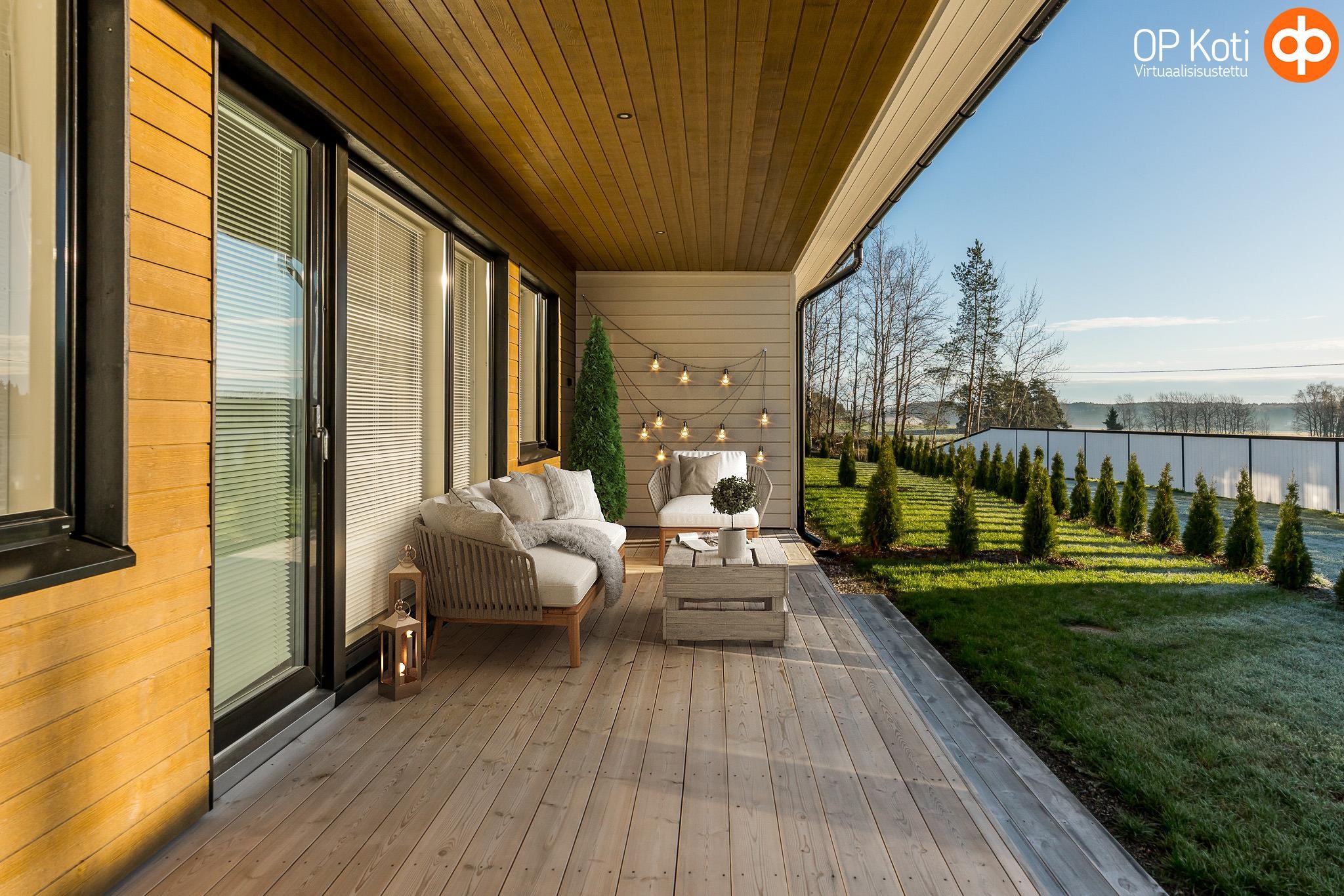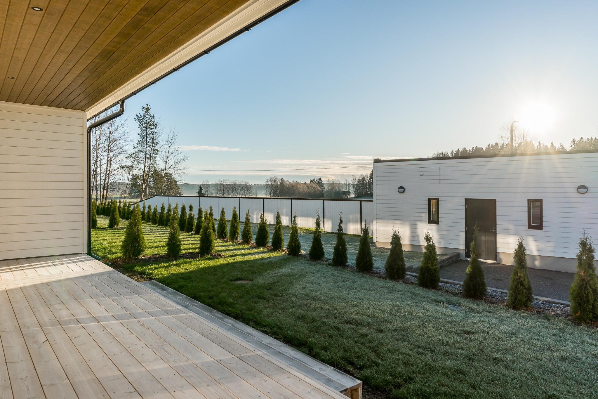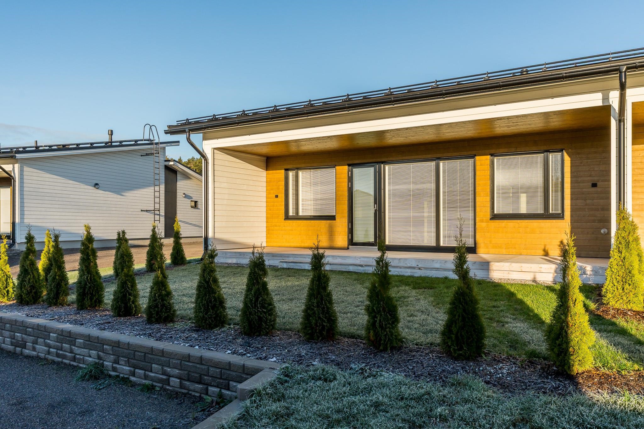 - Päätyasunnosta on näkymät kolmeen suuntaan. Terassi ja oleskelupiha ovat etelässä. Näkymässä mm. nurmea ja tuija-aita, etäällä pilkottaa meri. Sisääntulo on pohjoisessa, näkymässä piha-aluetta.