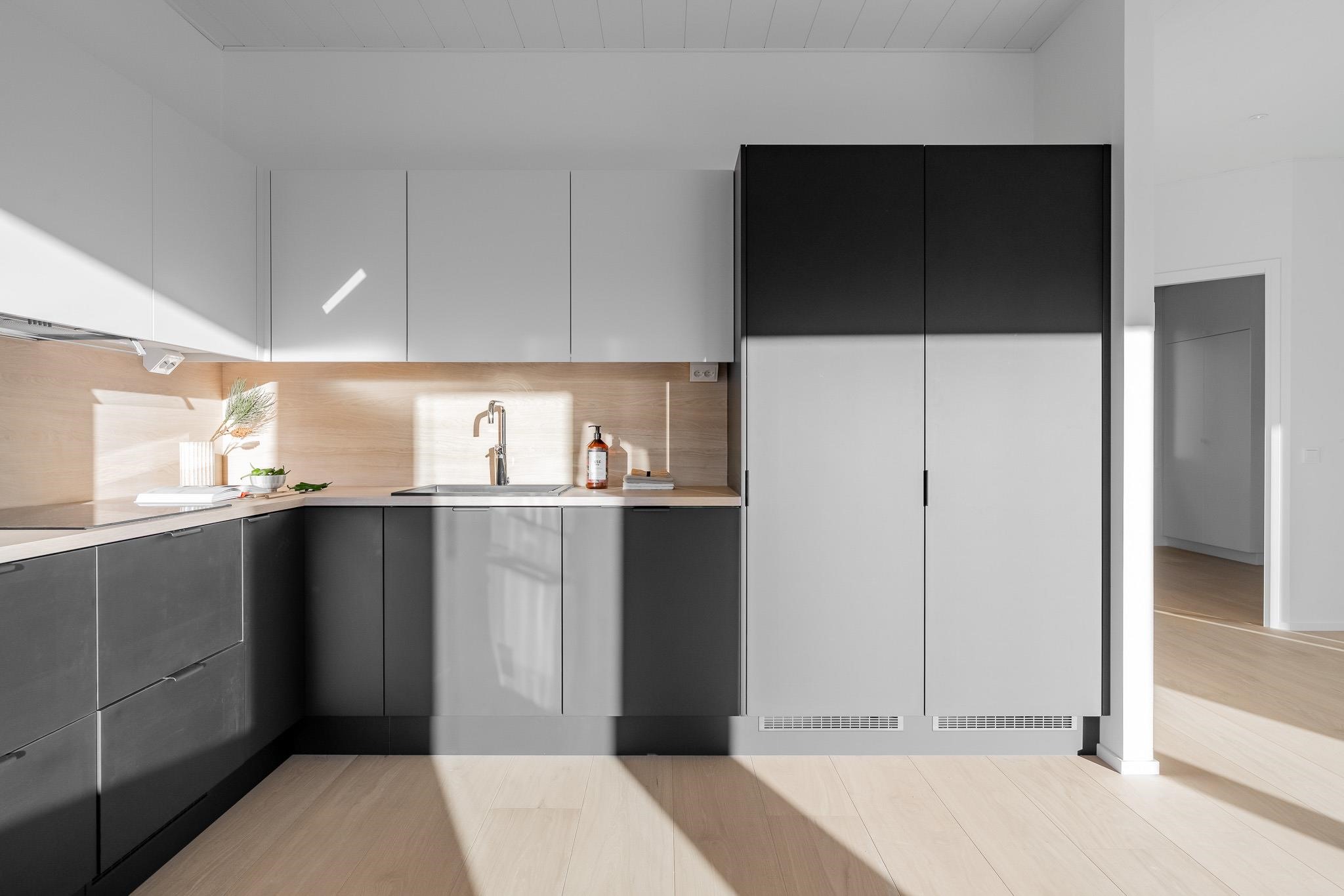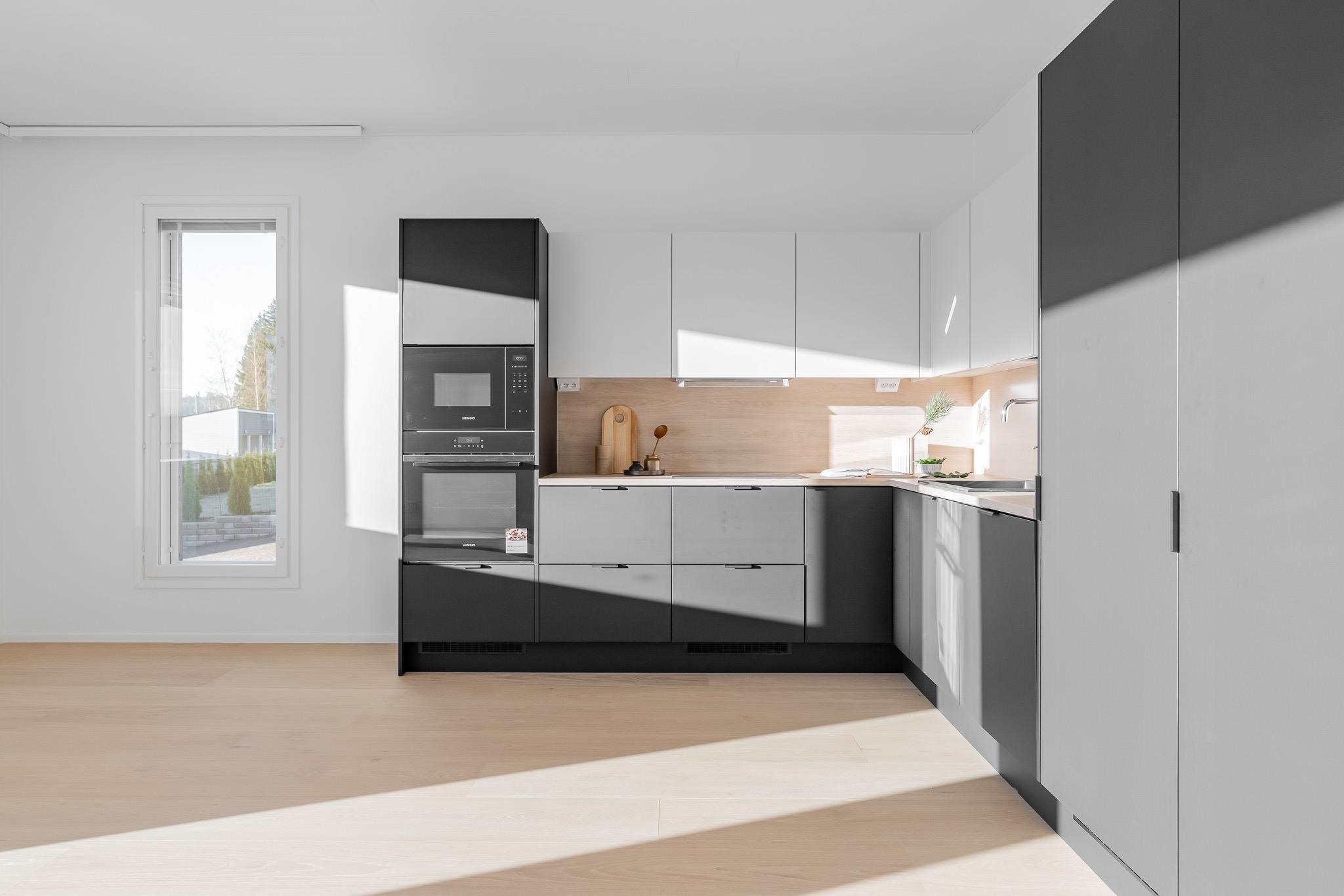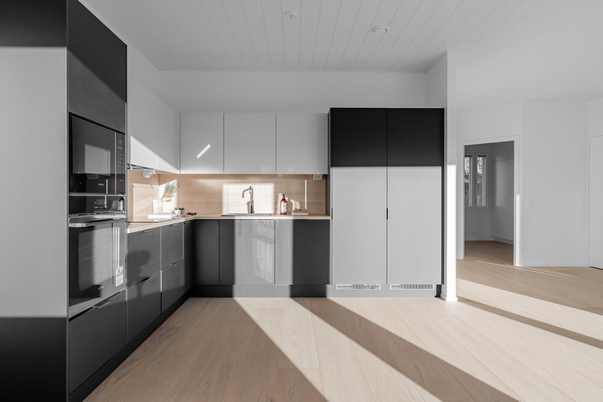 - Jääkaappipakastin, erillisuuni on sijoitettu kalusteeseen, induktioliesi, liesituuletin, mikroaaltouuni on integroitu, astianpesukone, kaapistot, kiinteät valaisimet. Kaikki kodinkoneet ovat Electroluxin ja tässä kodissa niiden väri on musta niiltä osin, kuin ne eivät ole kalustepeitteisiä. Keittiön kiintokalusteet tulevat Puuvaja Oy:ltä, eli melkein naapurista Kaarinan Krossista.