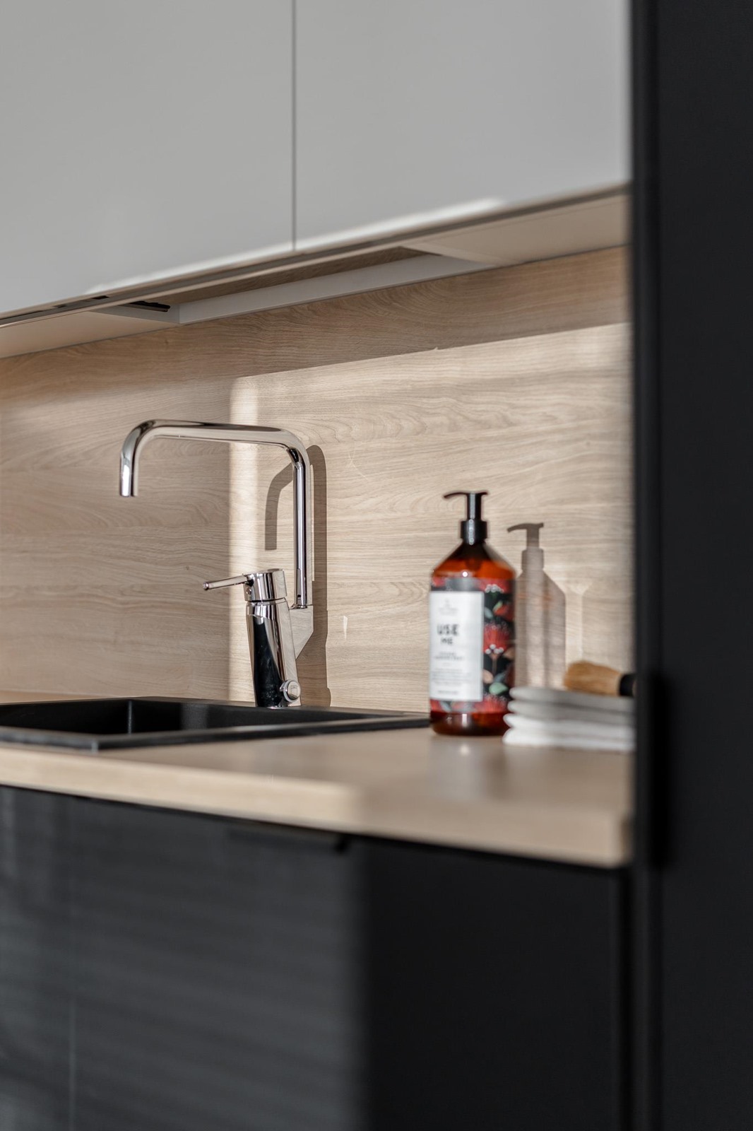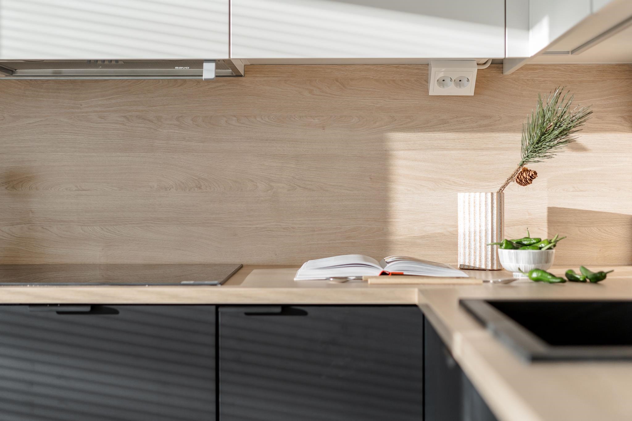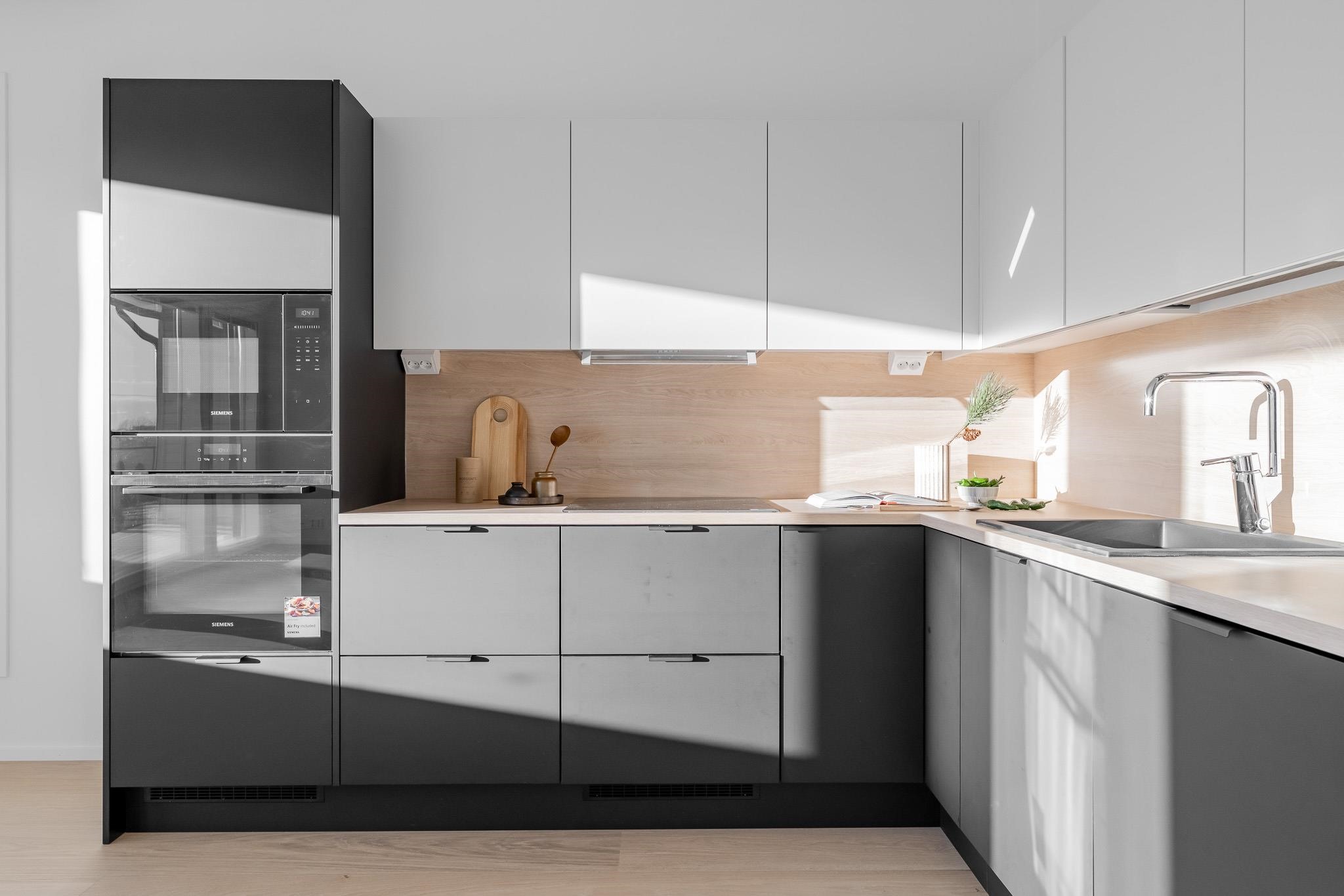 - Jääkaappipakastin, erillisuuni on sijoitettu kalusteeseen, induktioliesi, liesituuletin, mikroaaltouuni on integroitu, astianpesukone, kaapistot, kiinteät valaisimet. Kaikki kodinkoneet ovat Electroluxin ja tässä kodissa niiden väri on musta niiltä osin, kuin ne eivät ole kalustepeitteisiä. Keittiön kiintokalusteet tulevat Puuvaja Oy:ltä, eli melkein naapurista Kaarinan Krossista.