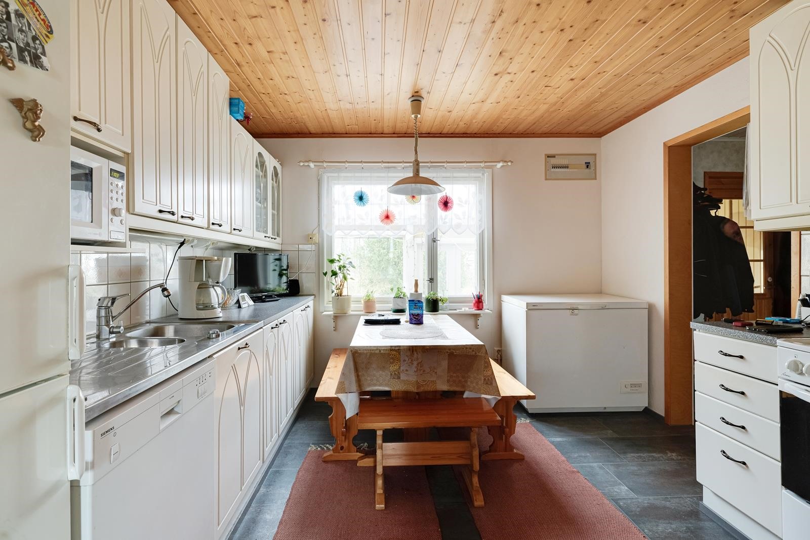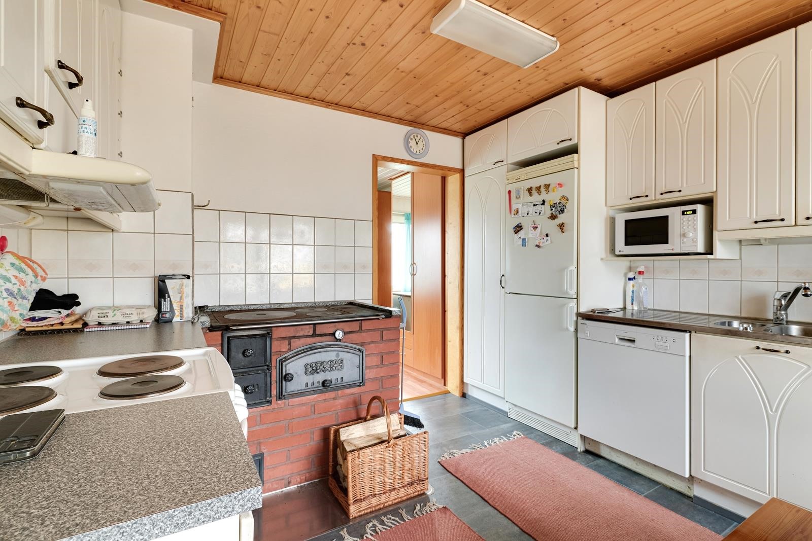 - Jääkaappipakastin, arkkupakastin, sähköliesi, liesituuletin, astianpesukone. Kaapistot uusittu 90-luvun puolessa välissä, kiinteät valaisimet. Puuhella v. 1994.
