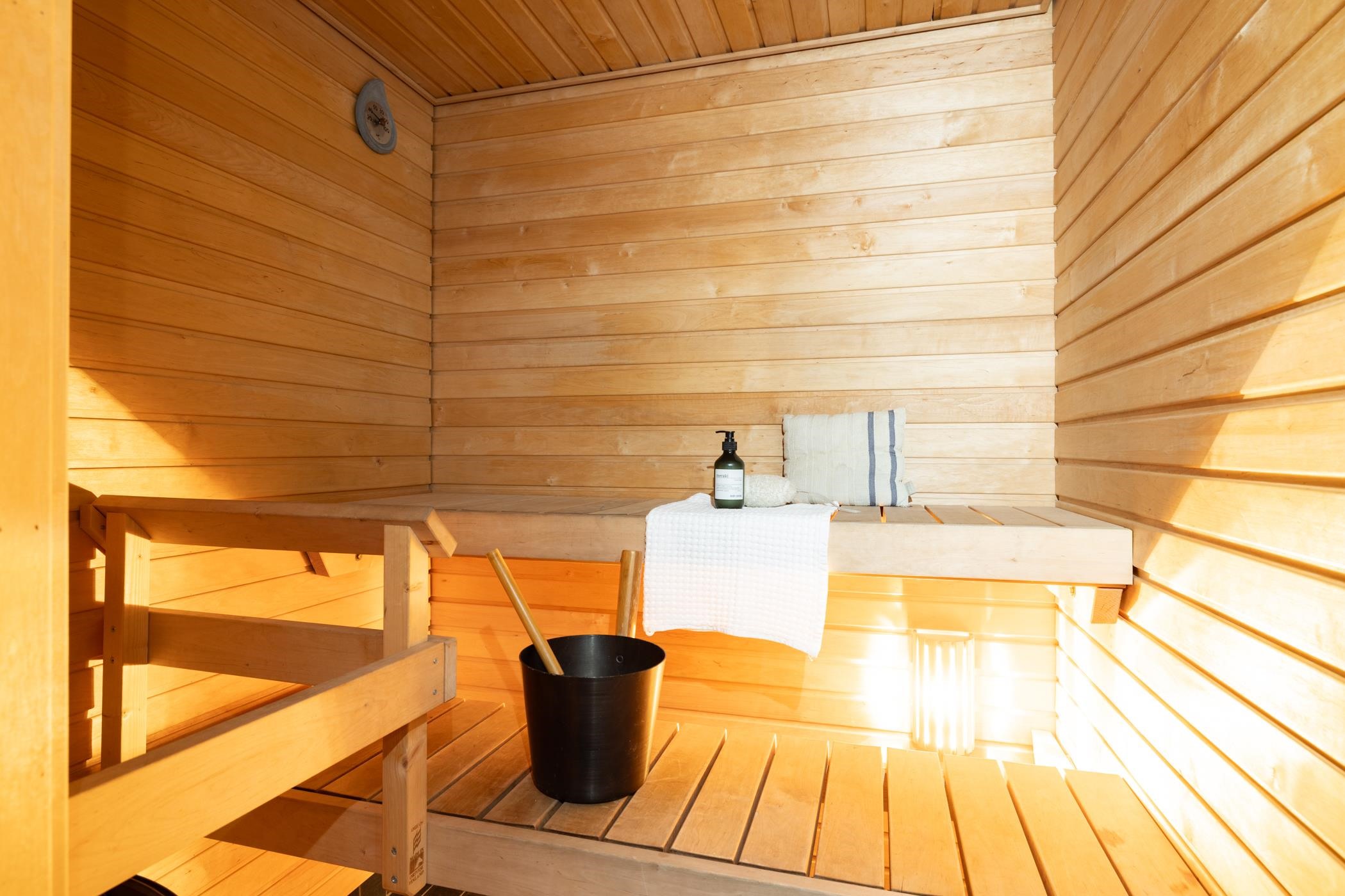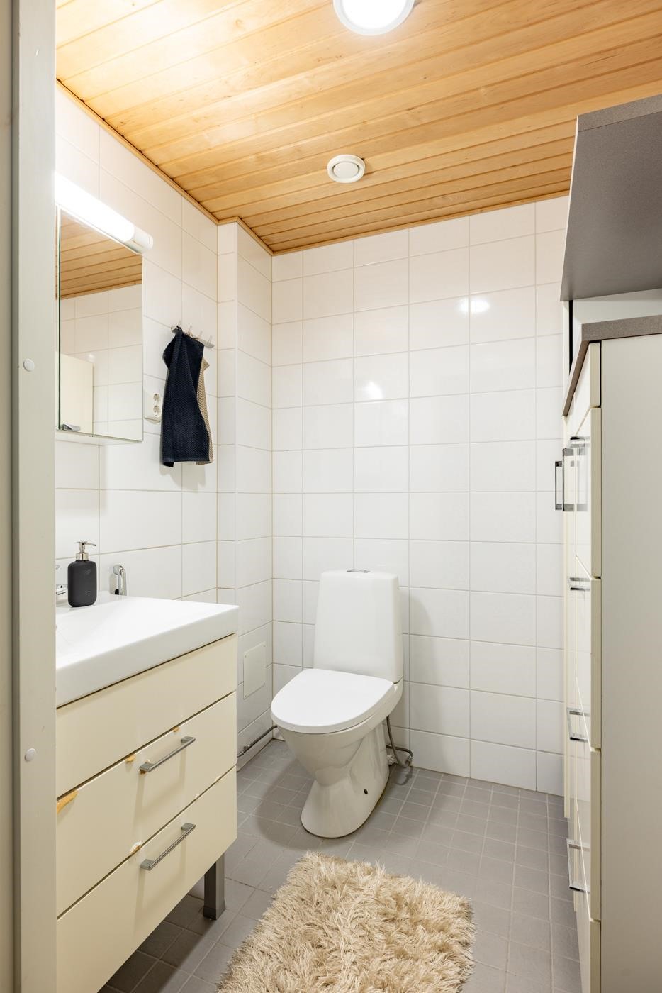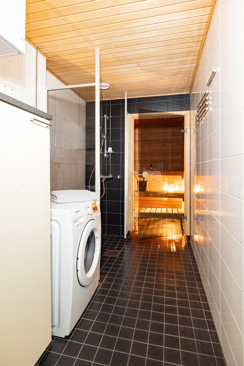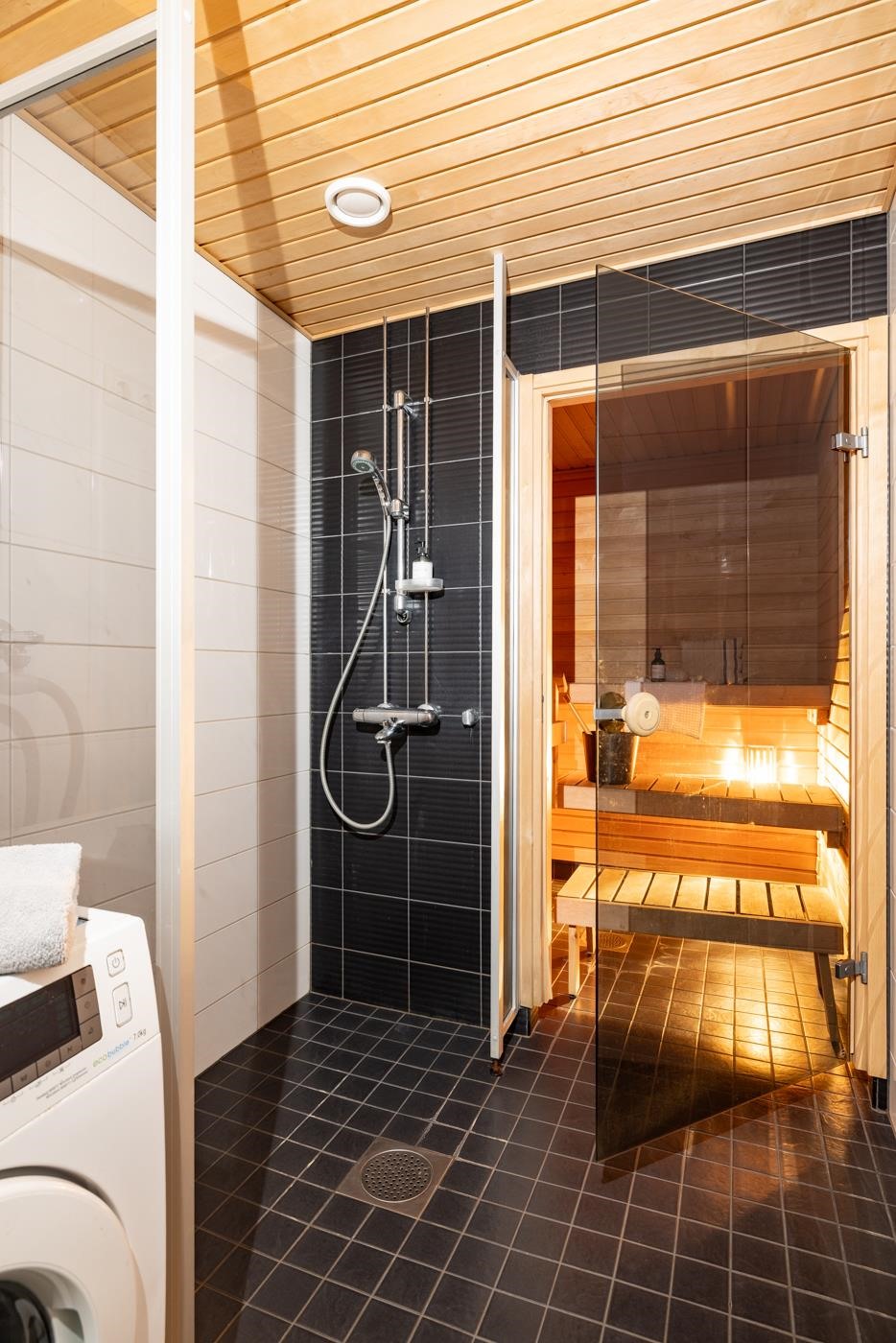 - Saunassa sähkökiuas. Kylpyhuoneessa suihku, suihkuseinä, kaapit, pesukoneliitäntä, lattialämmitys. Erillinen wc: hylly peilikaappi, kaapistot