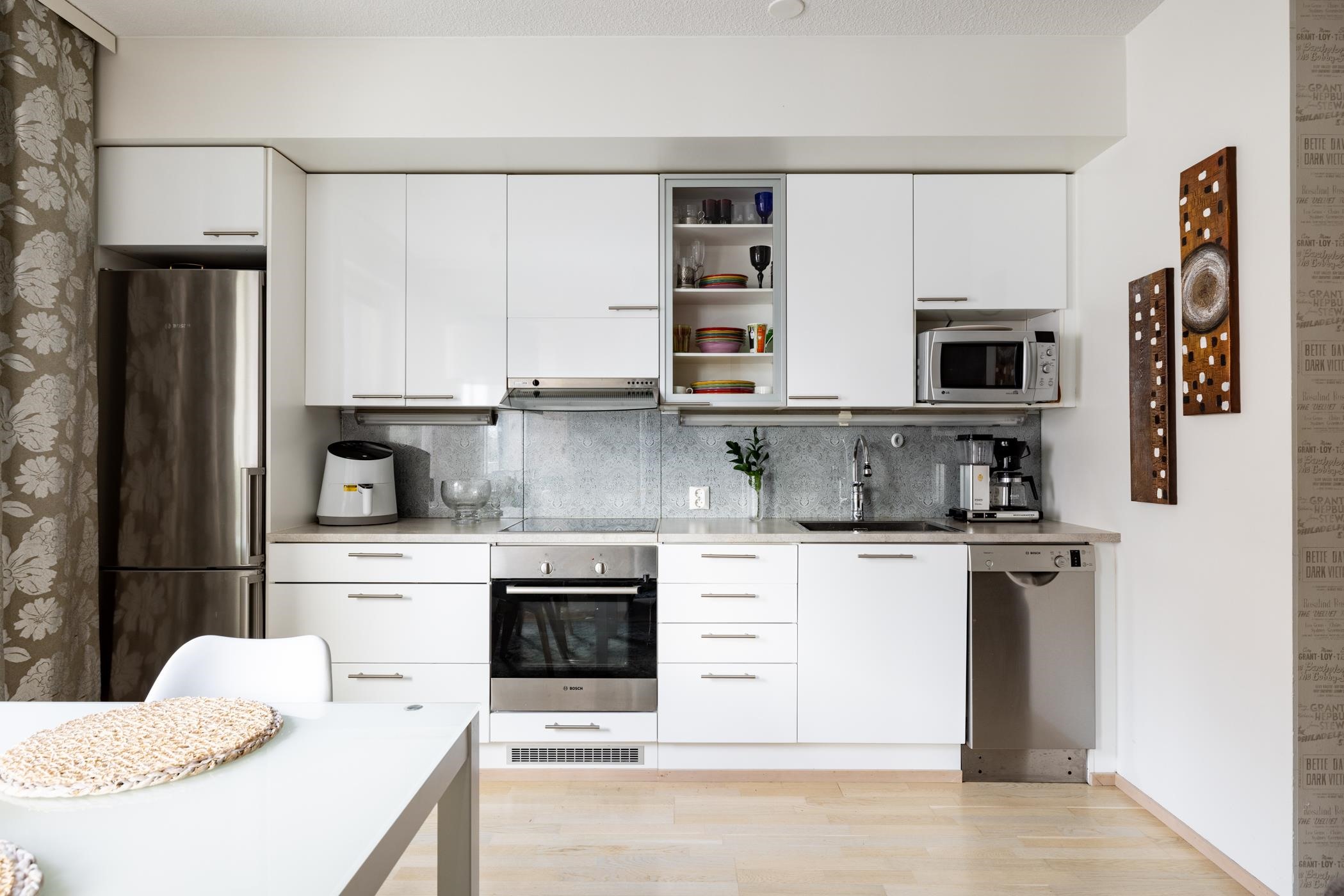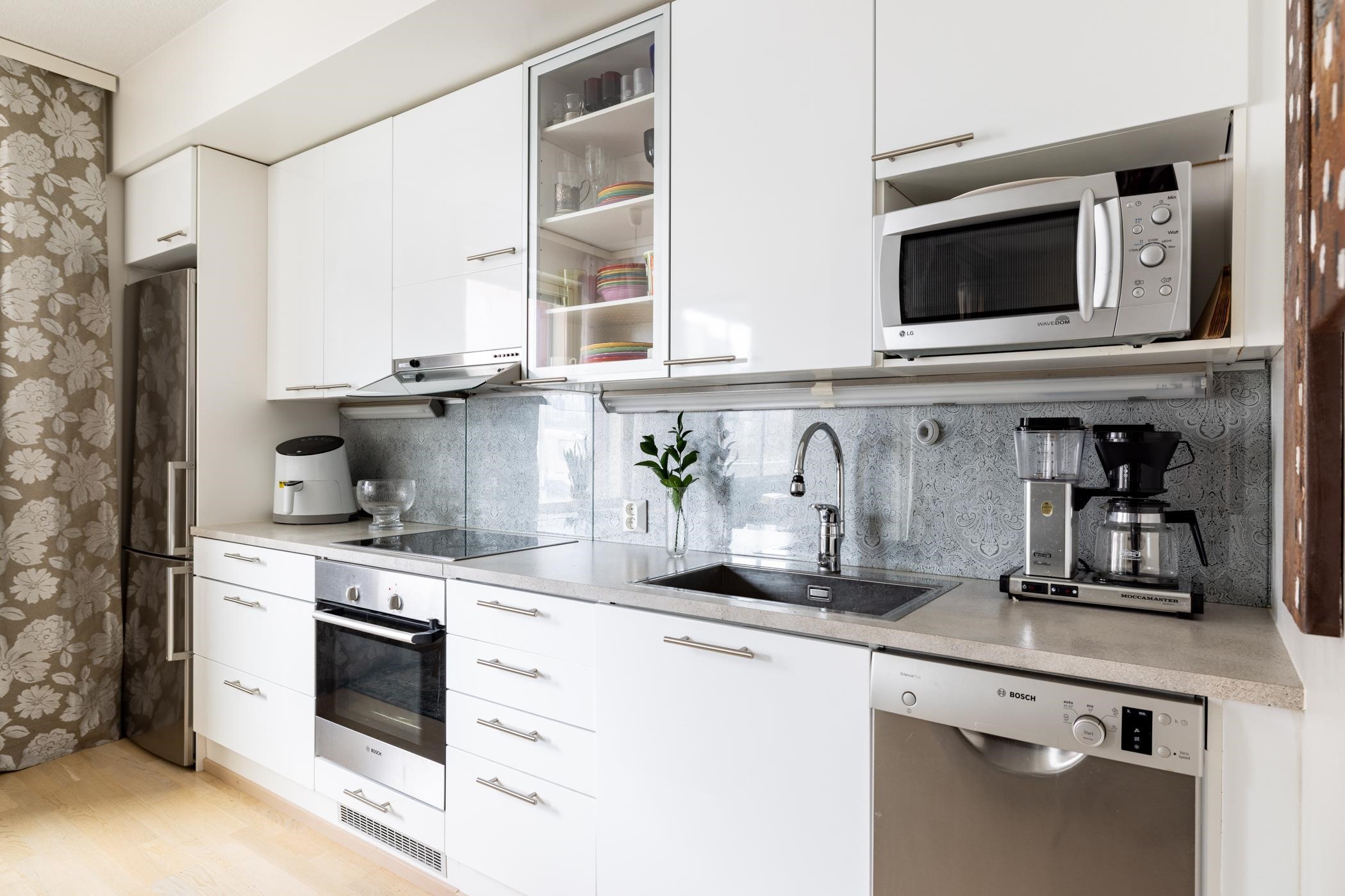 - Jääkaappipakastin, erillisuuni kiertoilma, induktioliesitaso, liesikupu, astianpesukone, kaapistot, kiinteät valaisimet. Kodinkoneet alkuperäisiä.
