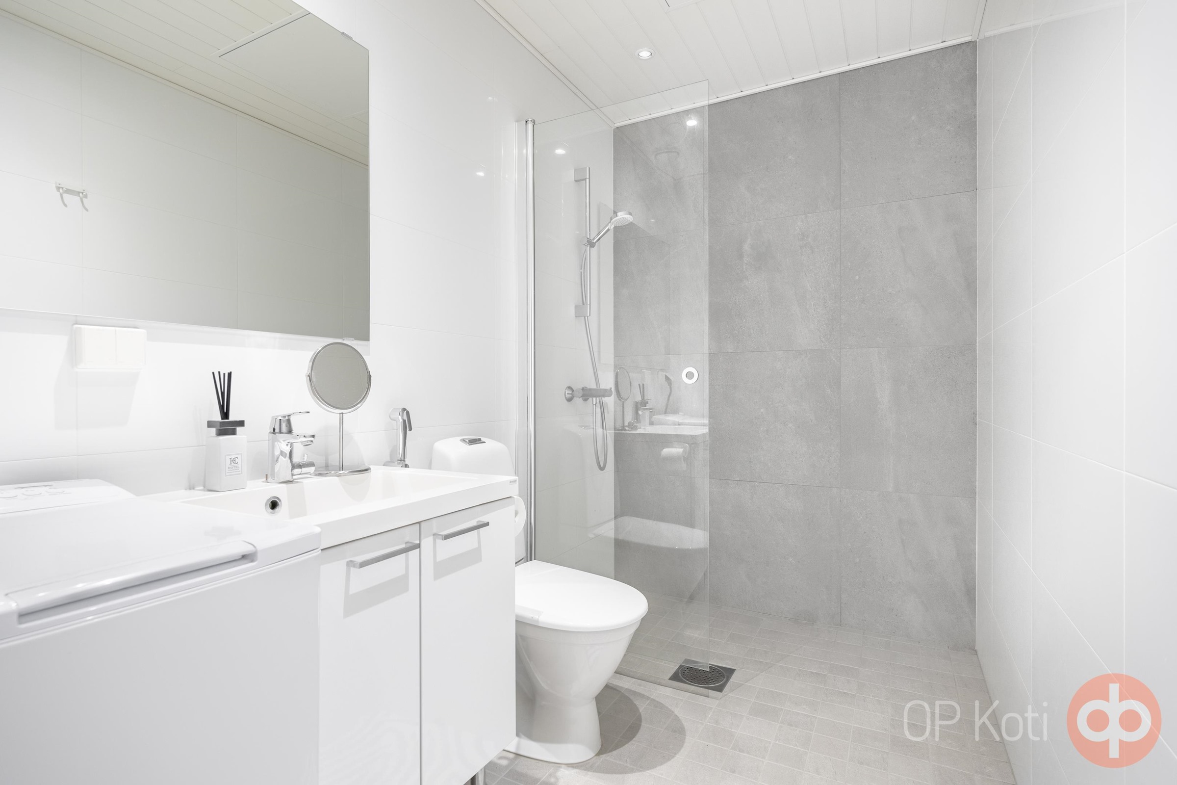 - Kylpyhuone, suihku, suihkuseinä, peilit, allaskaappi, pesukoneliitäntä, lattialämmitys, kiinteät valaisimet.