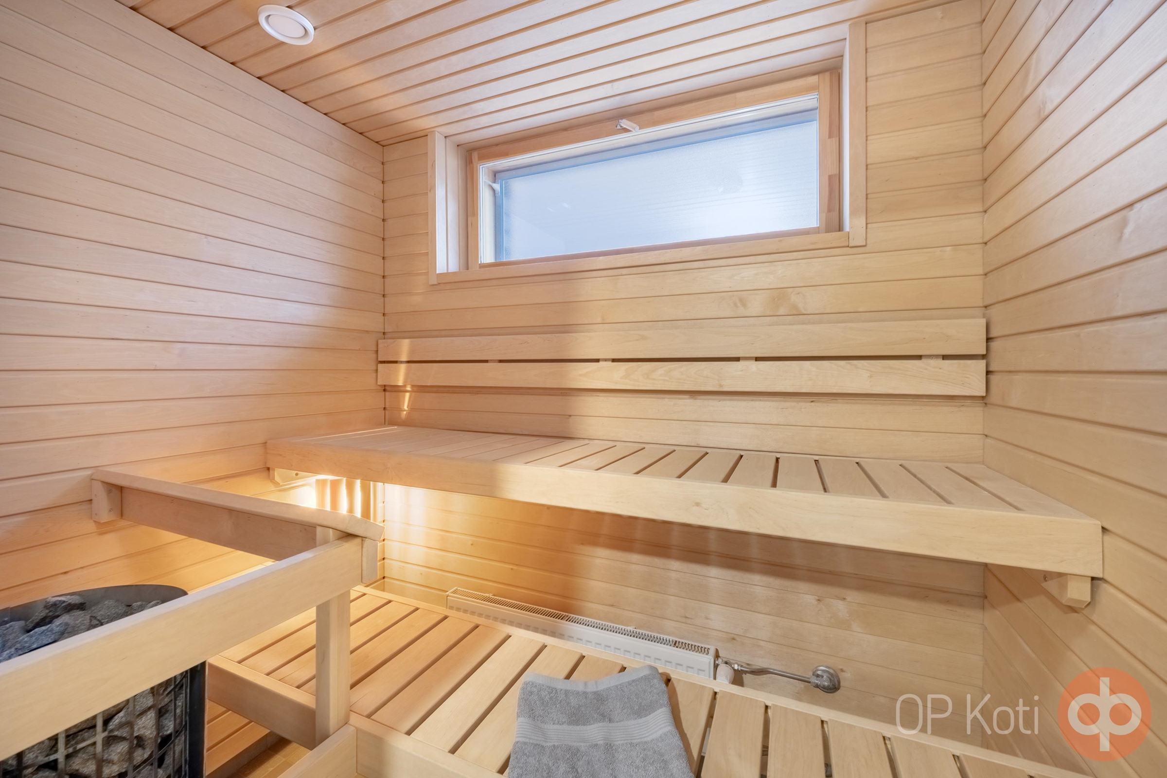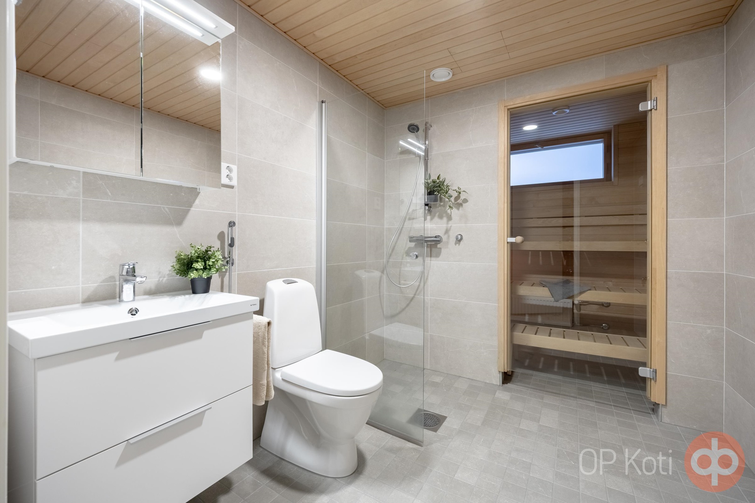 - Sauna, sähkökiuas, kylpyhuone, suihku, peilikaappi, kaapit, allaskaappi, pesukoneliitäntä, lattialämmitys, kiinteät valaisimet.