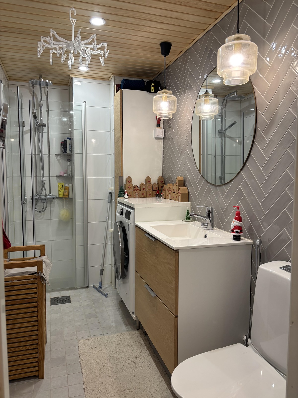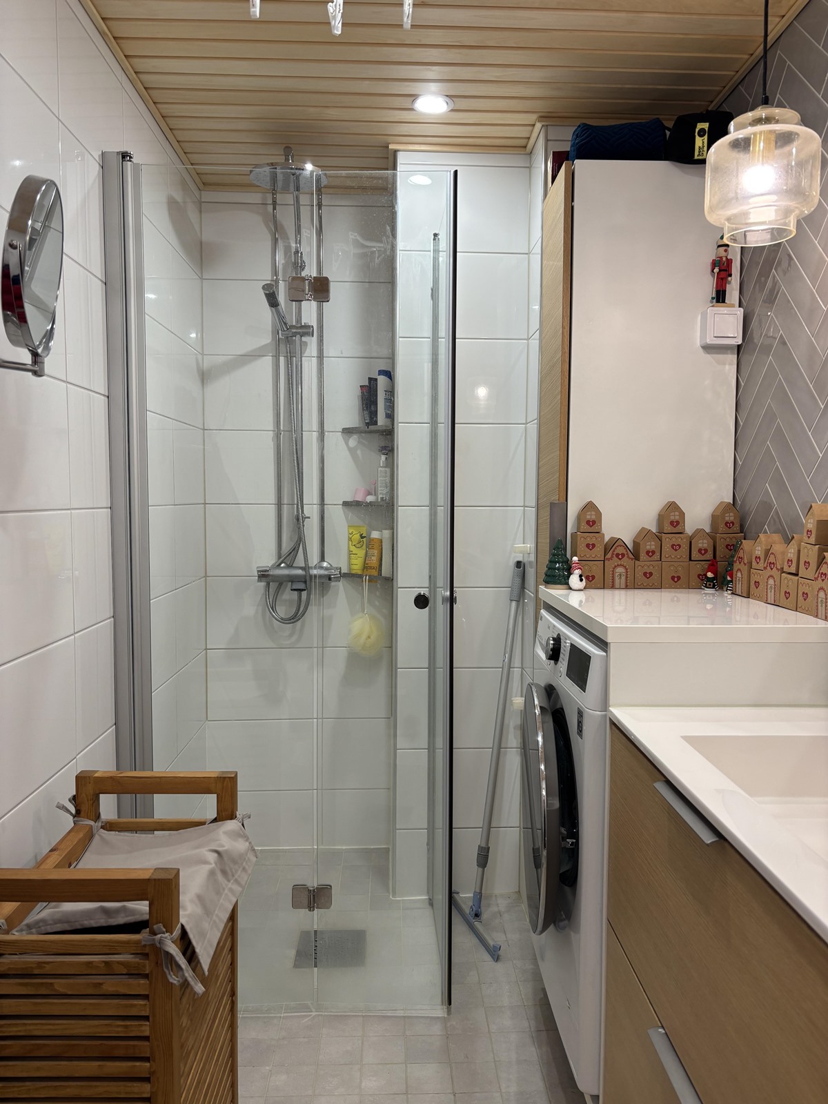 - Kylpyhuone, suihku, suihkuseinä, kaapit, allaskaappi, pesukoneliitäntä, lattialämmitys kaukolämmössä, kiinteät valaisimet, Kuivaava pyykinpesukone. Kylpyhuone remontoitu 2021