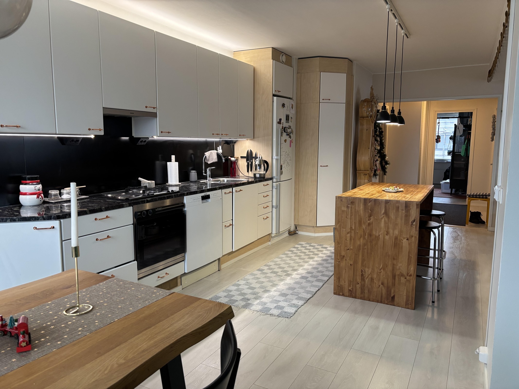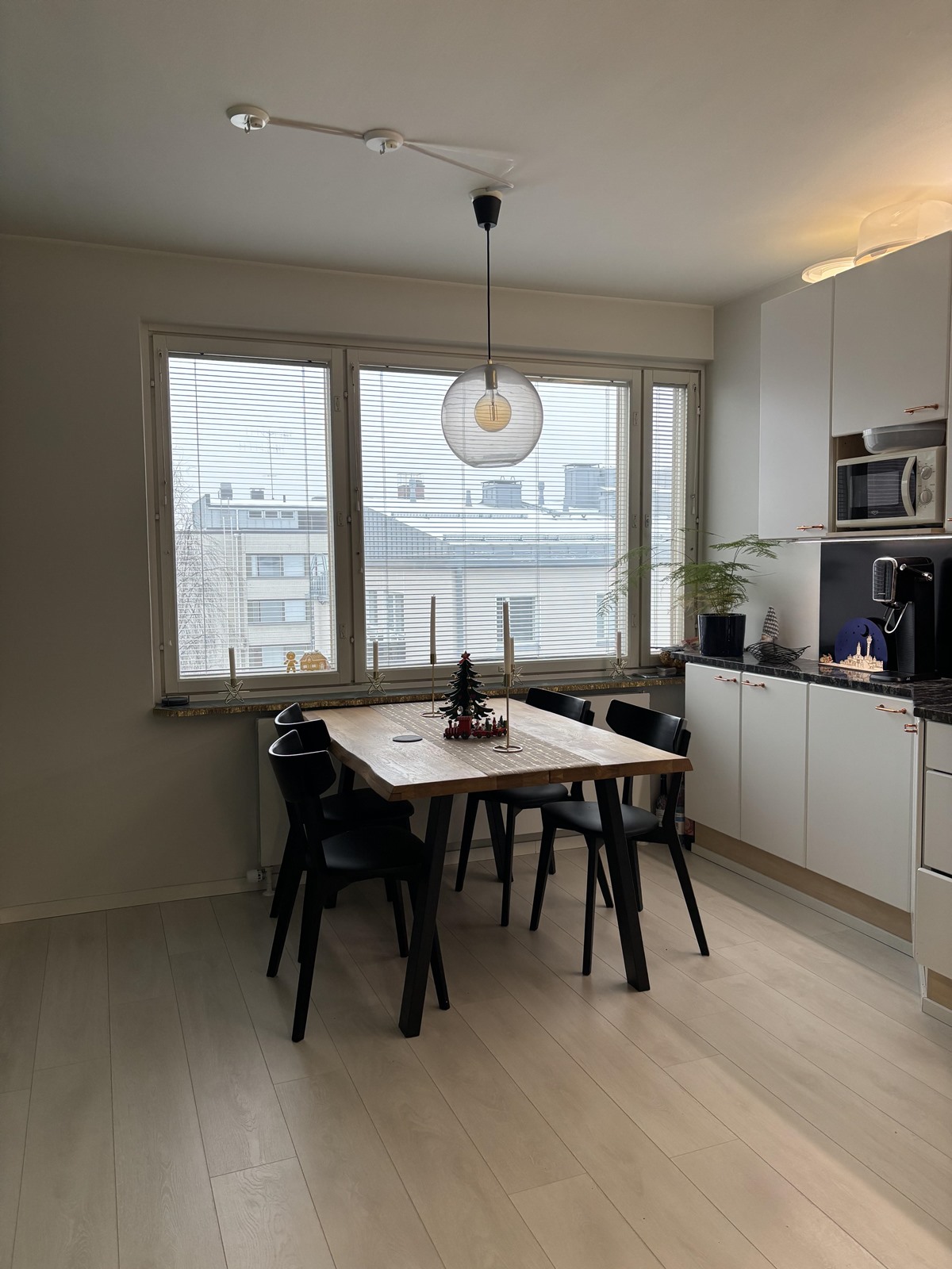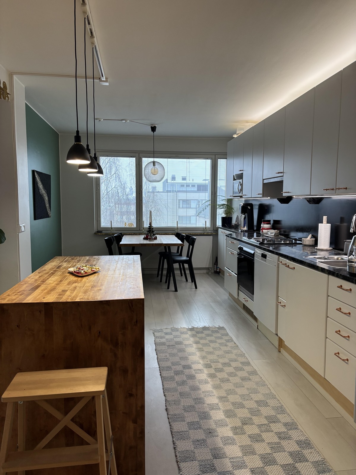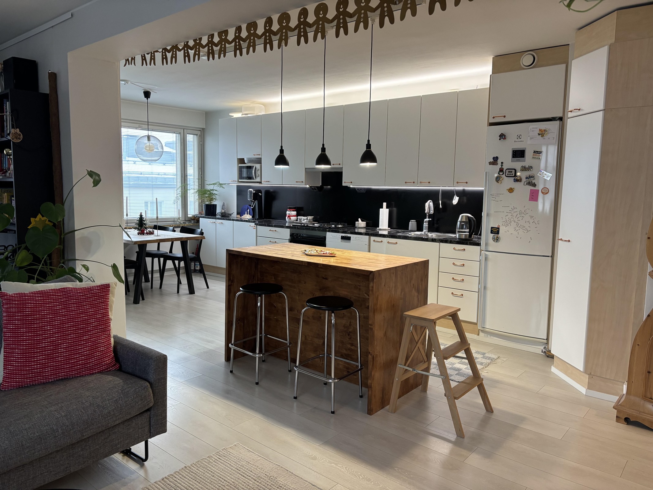 Asunnon sydän on upeasti remontoitu keittiö, jossa on ihana puinen saareke. Keittiö on hyvin varusteltu, sieltä löytyy jopa kokkaamisesta innostuneille kaasuliesi. Olohuone ja keittiö on yhtenäistä ja valoisaa tilaa. Lisäksi olohuoneesta on kulku lasitetulle parvekkeelle.