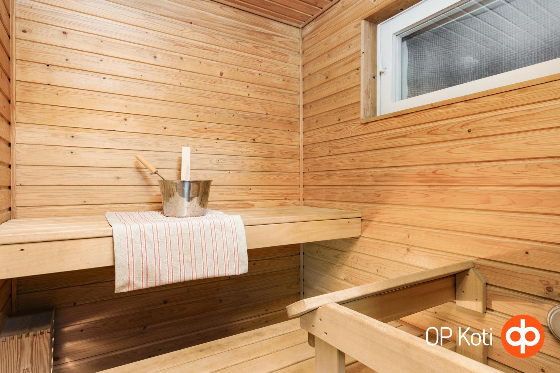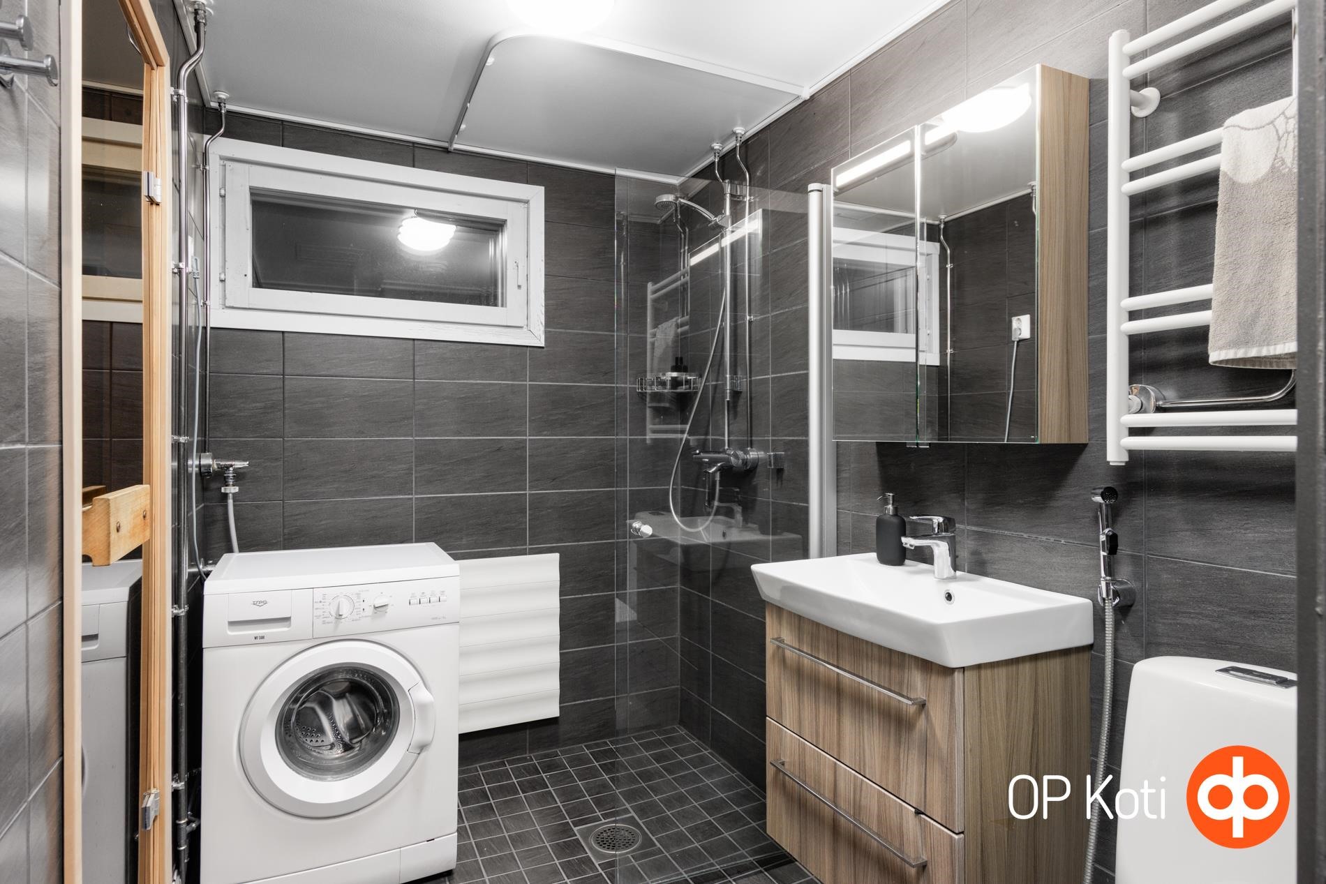 - Sauna, sähkökiuas, kylpyhuone, suihku, suihkuseinä, peilikaappi, allaskaappi, pesukoneliitäntä, kiinteät valaisimet.