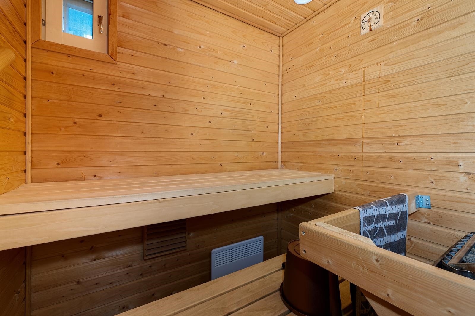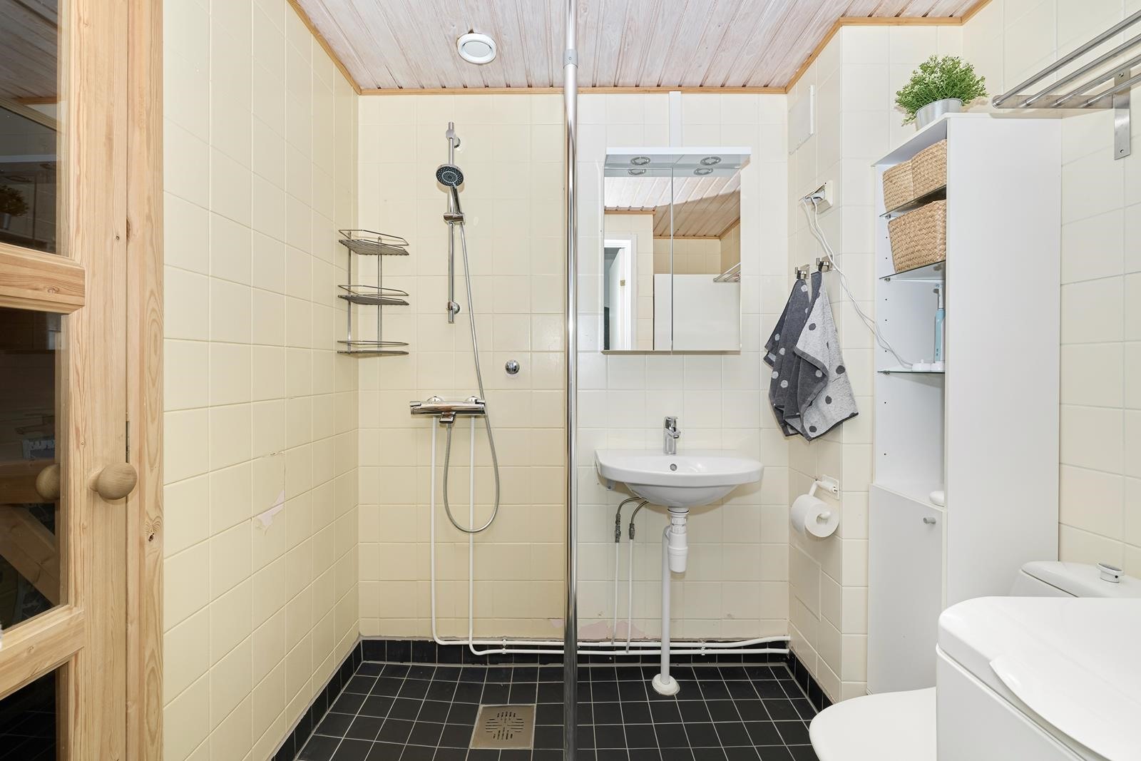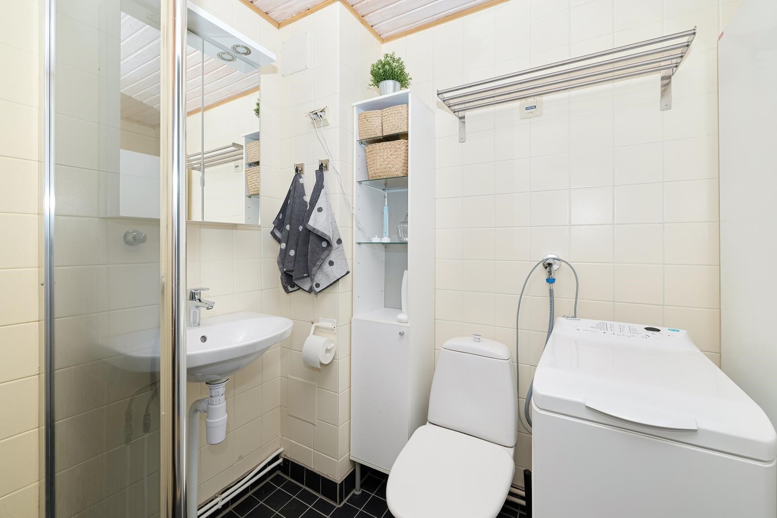 - Sauna, sähkökiuas, kylpyhuone, suihku, suihkuseinä, peilikaappi, pesukoneliitäntä.