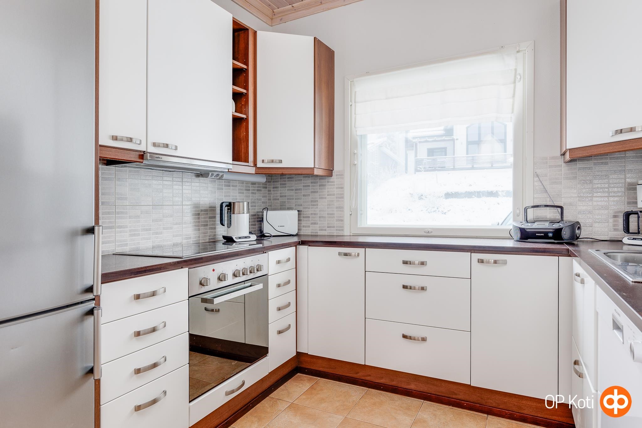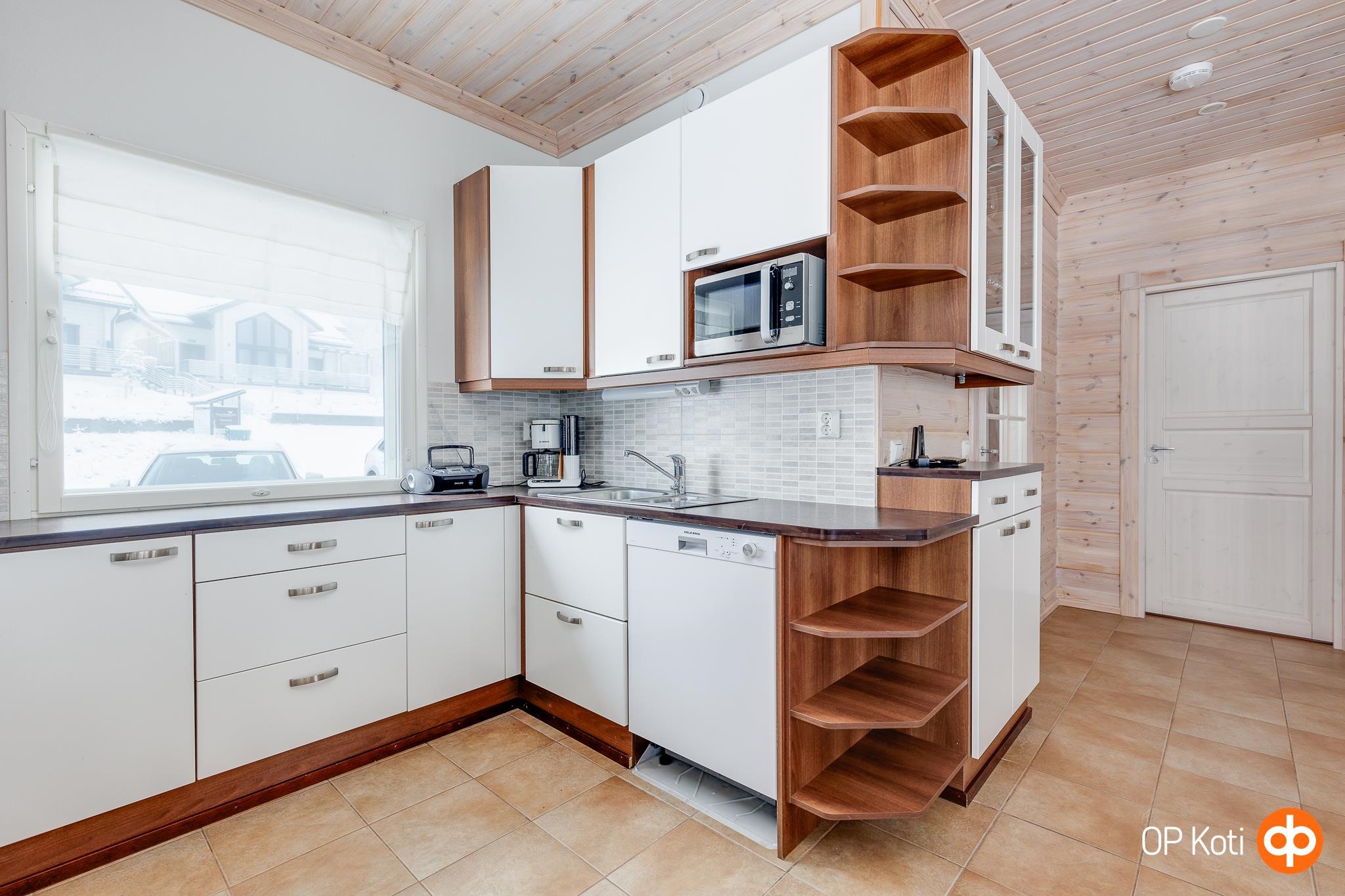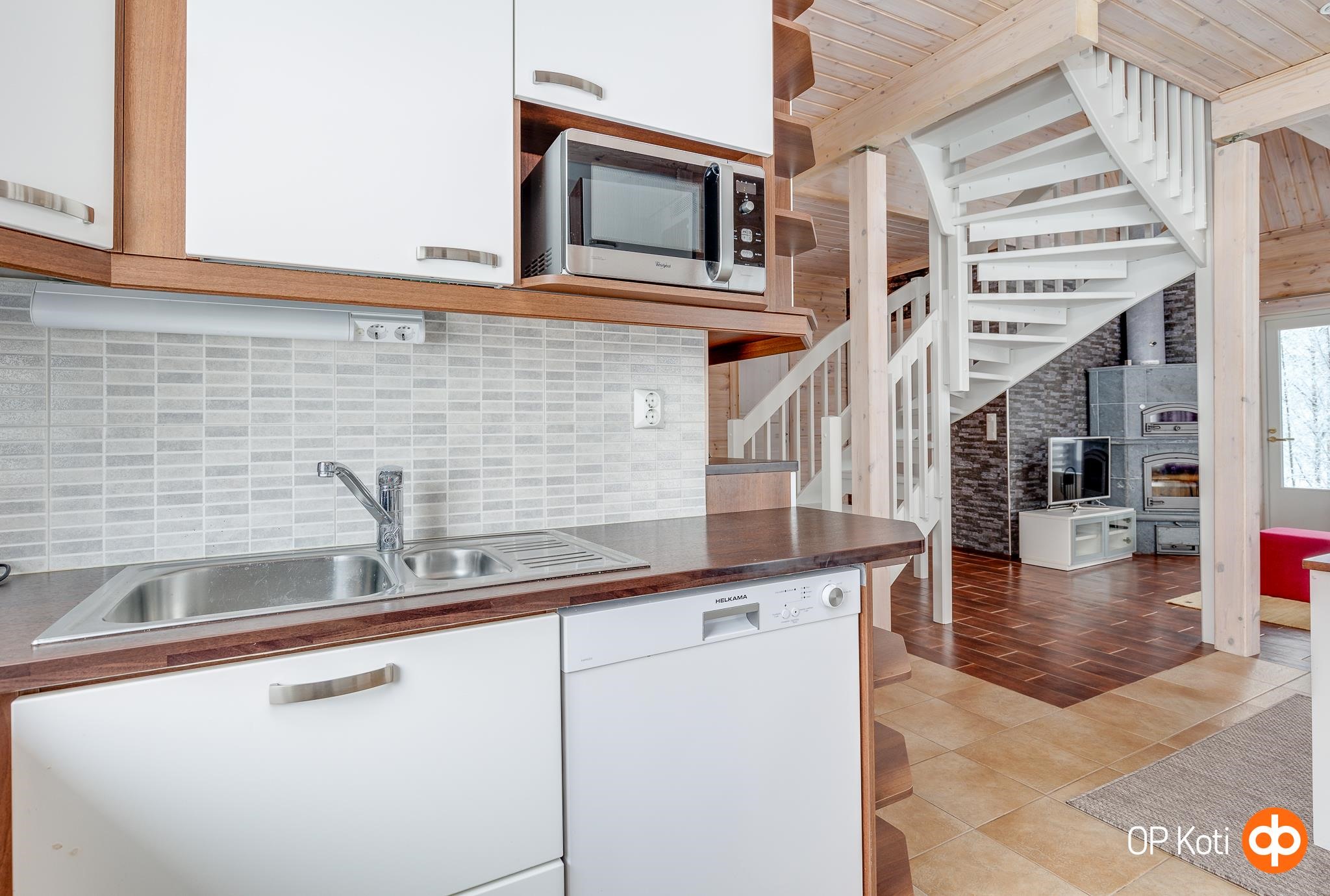 - Jääkaappipakastin, erillisuuni, keraaminen liesi, induktioliesi, liesituuletin, leivinuuni, mikroaaltouuni, astianpesukone, kaapistot, kiinteät valaisimet. Kauppan kuuluu irtaimisto, astiat ja huonekalut.