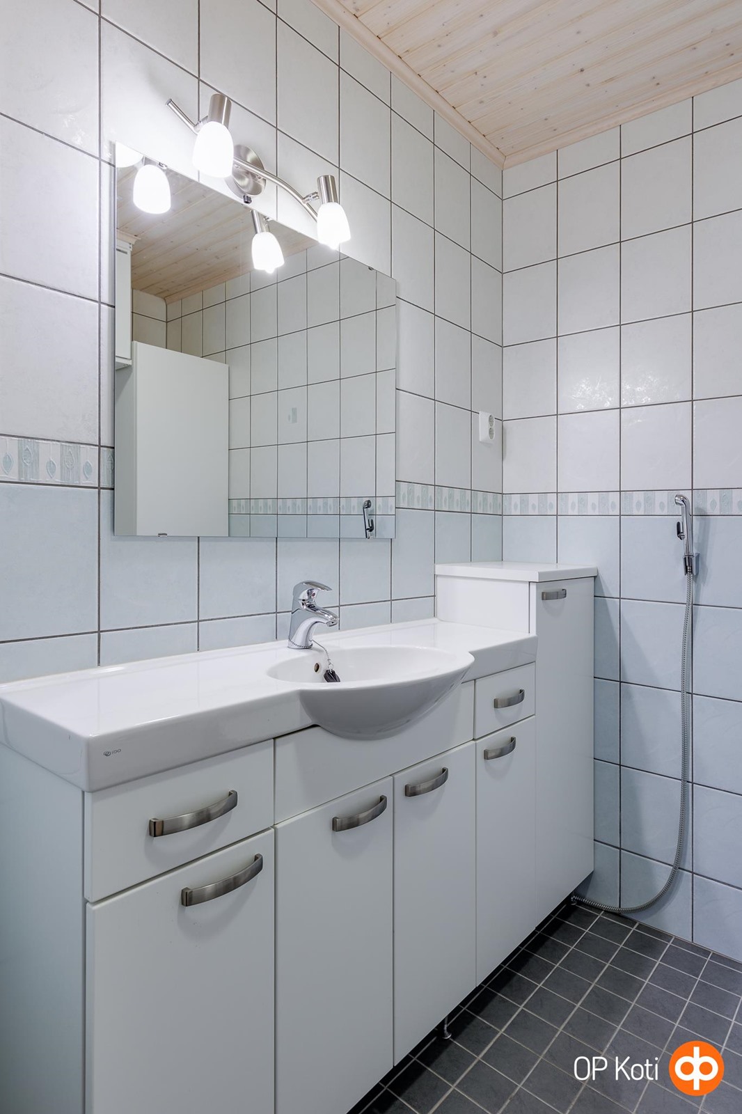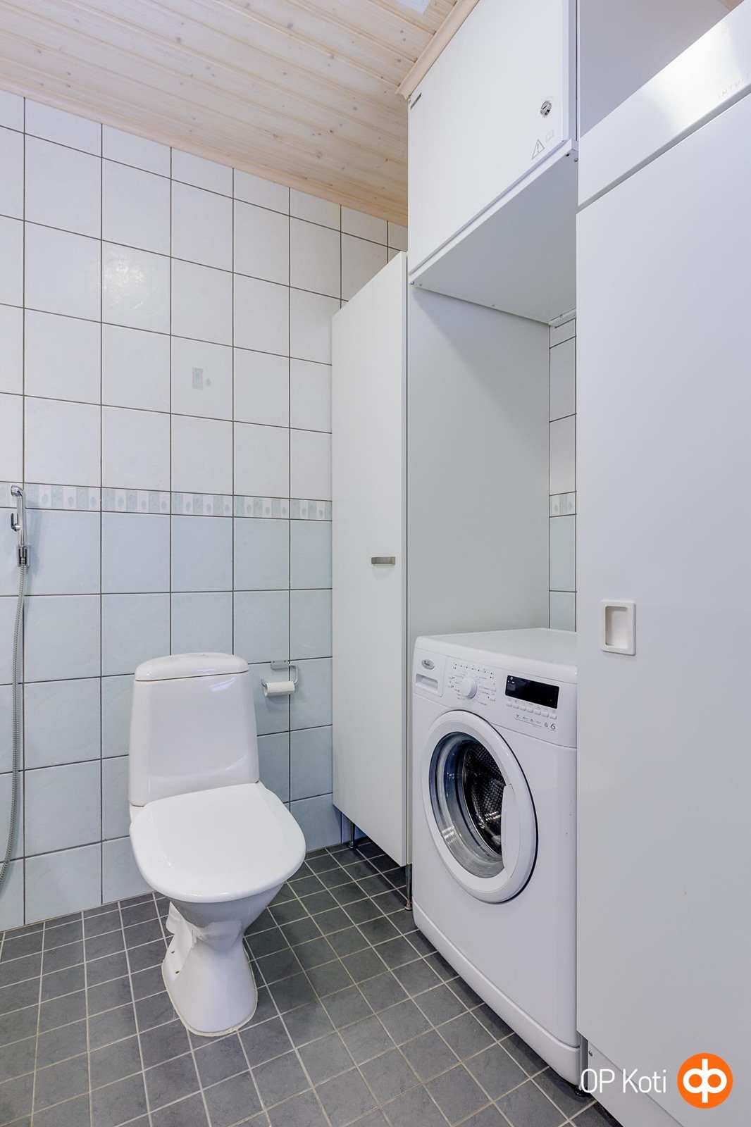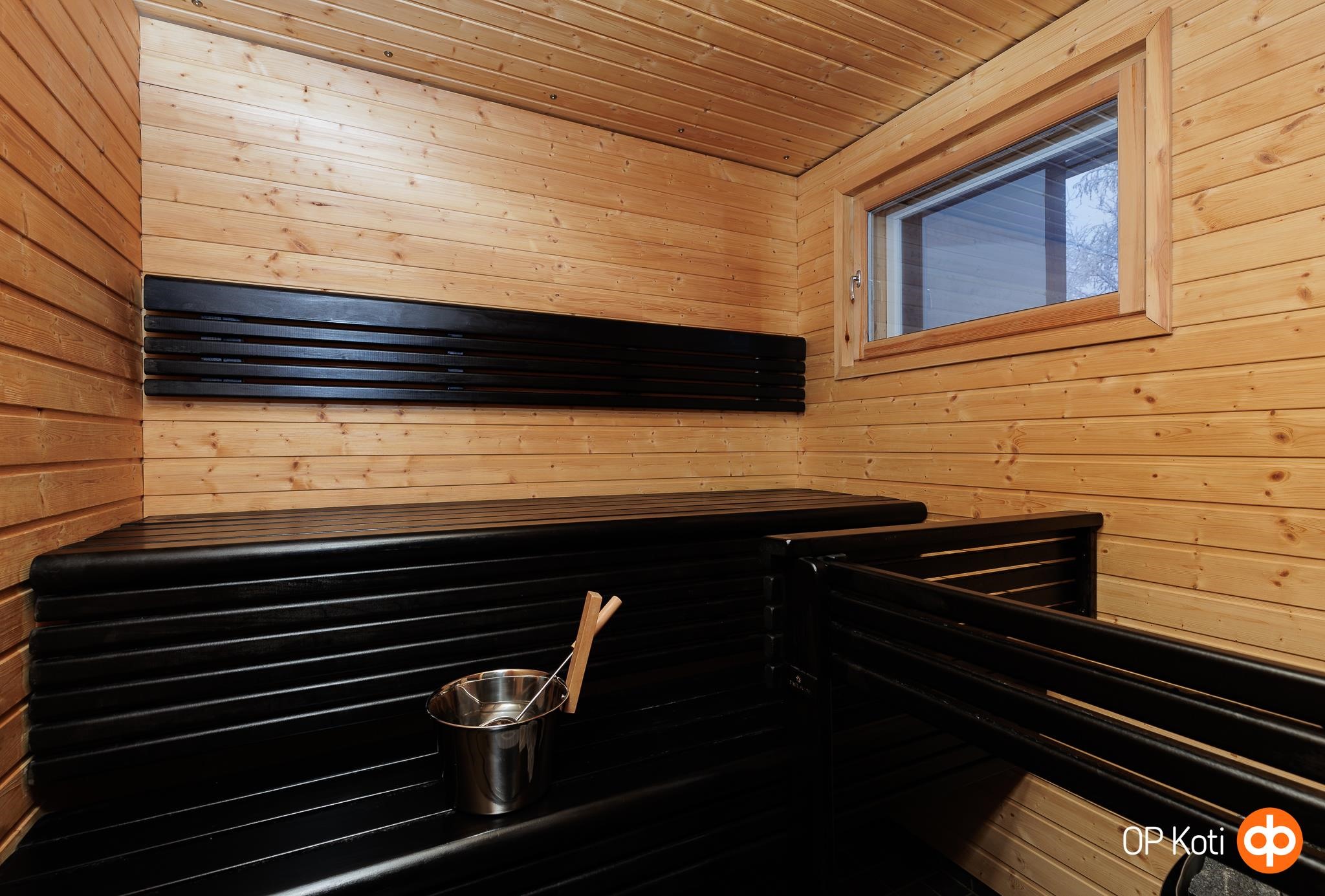 - Sauna, sähkökiuas, kylpyhuone, erillinen wc 3 wc, suihku 2 kpl, peilit, kaapit, allaskaappi, pesukoneliitäntä, lattialämmitys, kiinteät valaisimet.