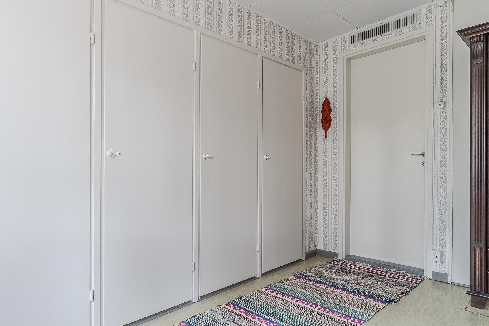- Keittiö: Lattia muovimatto, seinät lasikuitutapetti, muovilevy. Olohuone: Lattia muovimatto, seinät tapetti. Makuuhuone 1: alakerta: lattia muovimatto, seinät tapetti. Makuuhuone 2: yläkerta: lattia muovimatto, seinät tapetti. Makuuhuone 3: yläkerta: lattia laminaatti, seinät tapetti rem. 2000-luvulla. Kodinhoitohuone: Lattia muovimatto, seinät tapetti, maalattu. Sauna: Lattia laatta, seinät kaakeli ja paneli. Kylpyhuone: Lattia laatta, lattialämmitys, seinät kaakeli. Eteinen: Lattia muovimatto, seinät tapetti. Wc: Lattia muovi, seinät muovi.