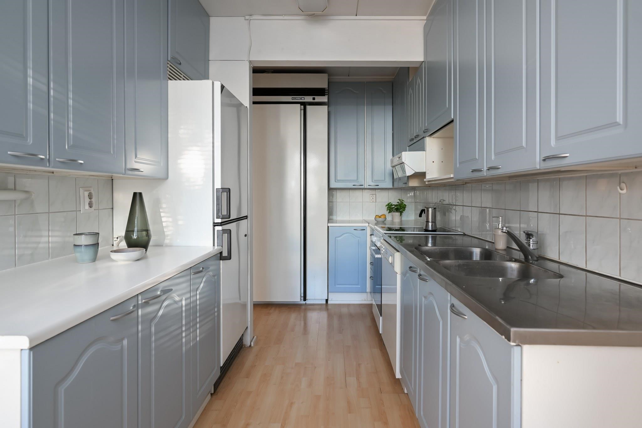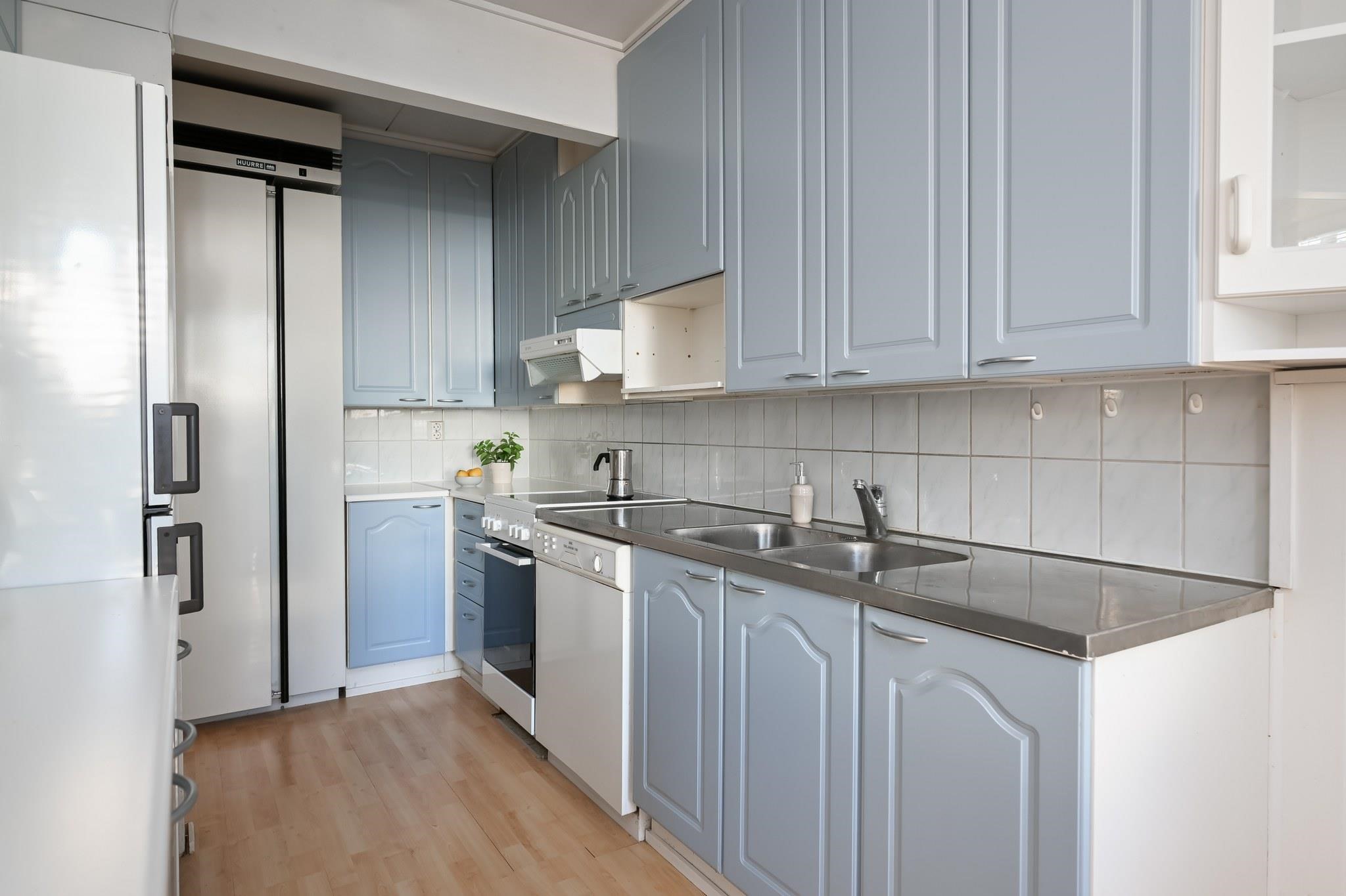 - Jääkaappipakastin, kylmiö käyttämätön, lattialiesi, keraaminen liesi, liesituuletin, astianpesukone lähes käyttämätön, kaapistot, kiinteät valaisimet.