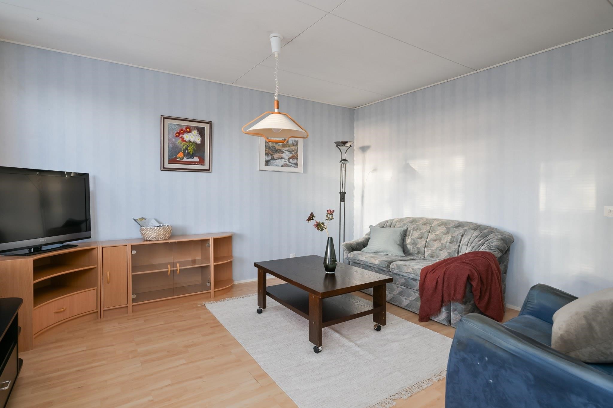 Keittiö: lattia laminaattia, seinät puolipaneli, maali / välitilalaatta. Olohuone: lattia laminaattia, seinät tapettia. Makuuhuone 1: lattia laminaattia, seinät maali. Sauna: lattia laattaa, seinät paneloitu. Kylpyhuone: lattia ja seinät laattaa. Eteinen: lattia laminaattia, seinät maali. Wc: lattia laattaa, seinät tapettia / pienesti laatta. Vaatehuone: lattia muovimattoa, seinät maali.
