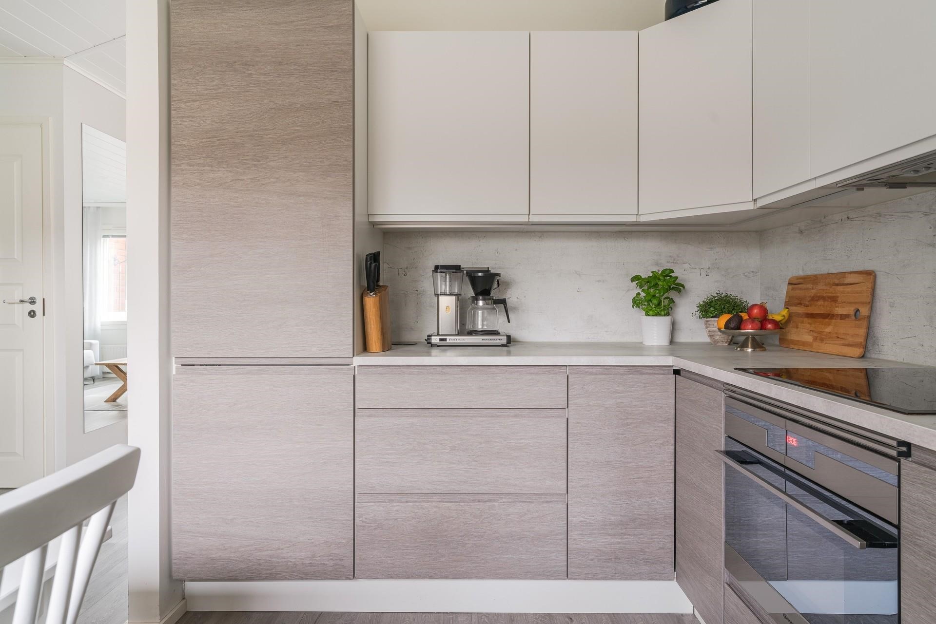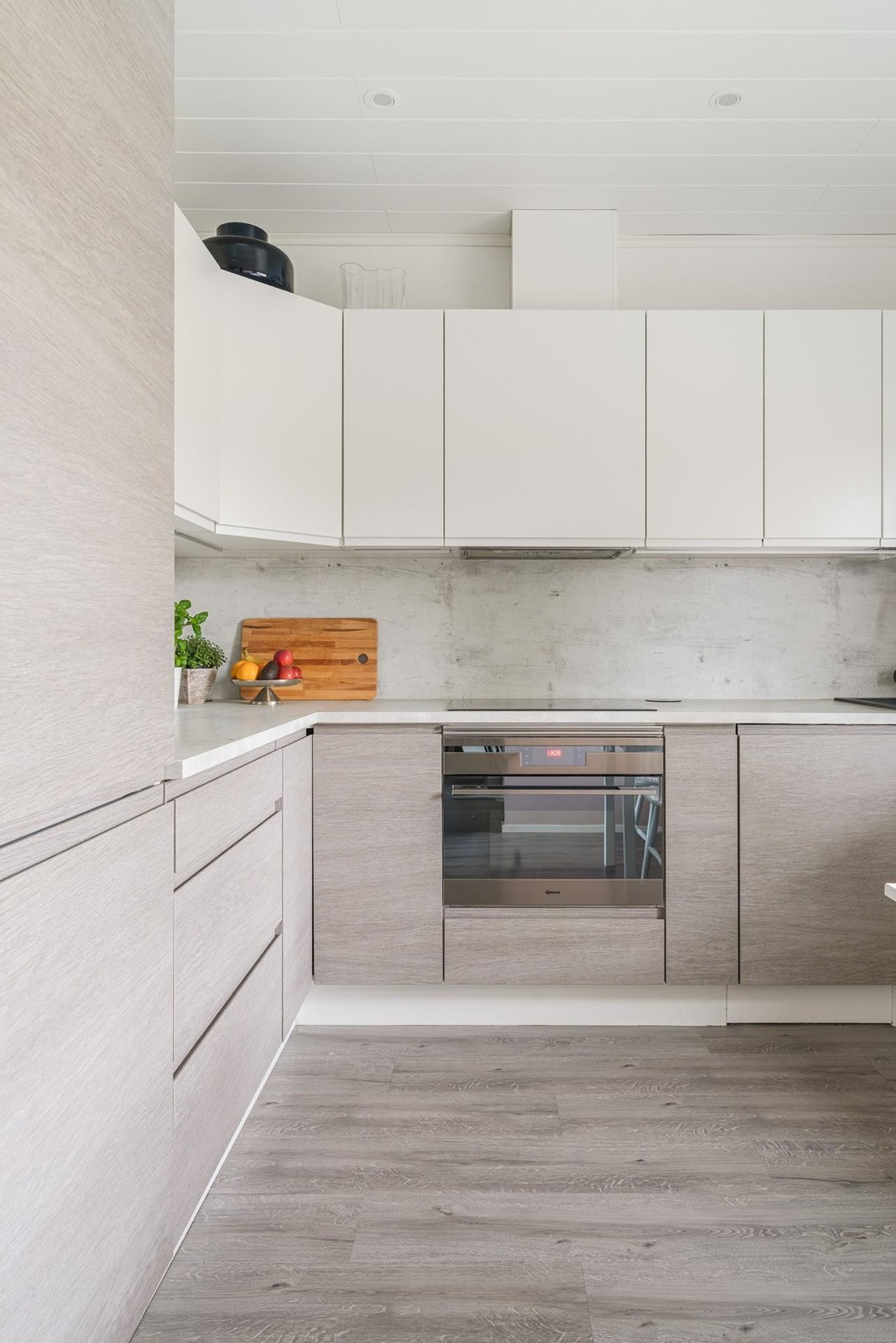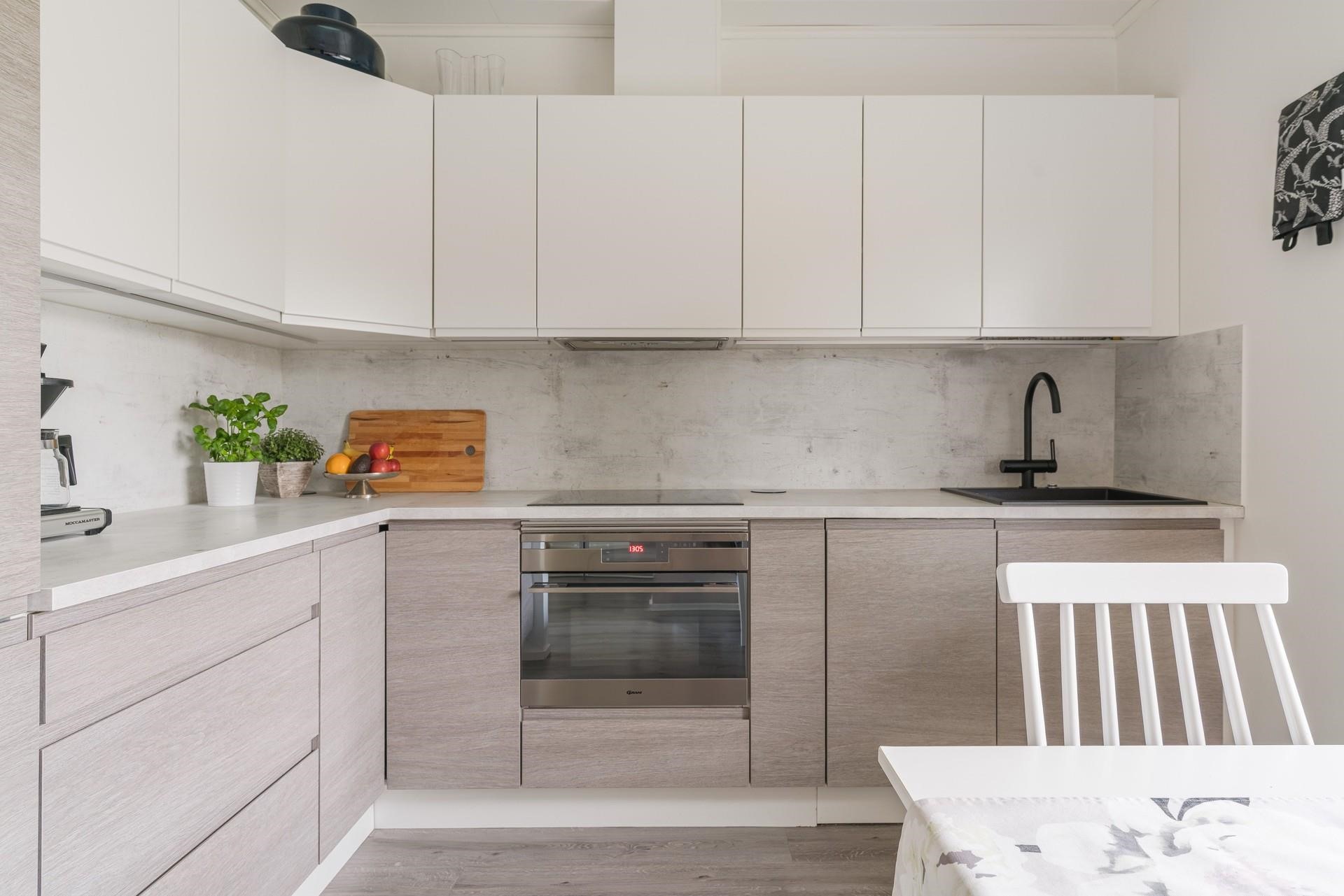 - Jääkaappipakastin, erillisuuni sisältää mikroaaltouunin, induktioliesi, liesituuletin, astianpesukone, kaapistot, kiinteät valaisimet.