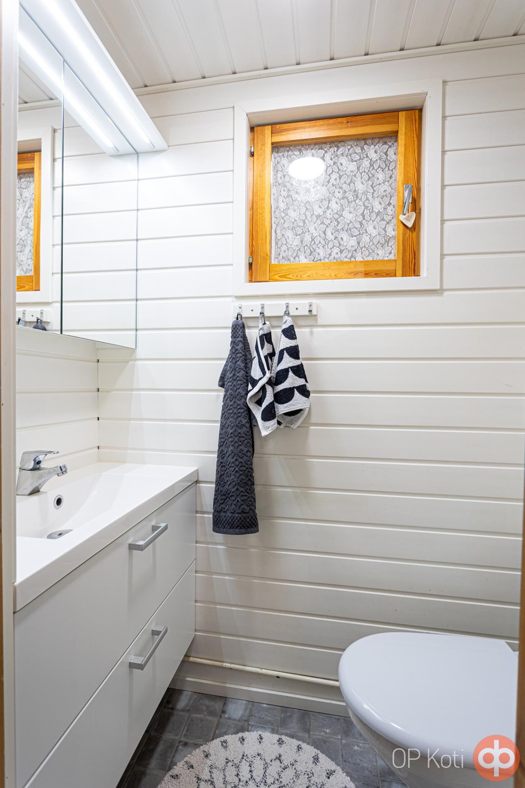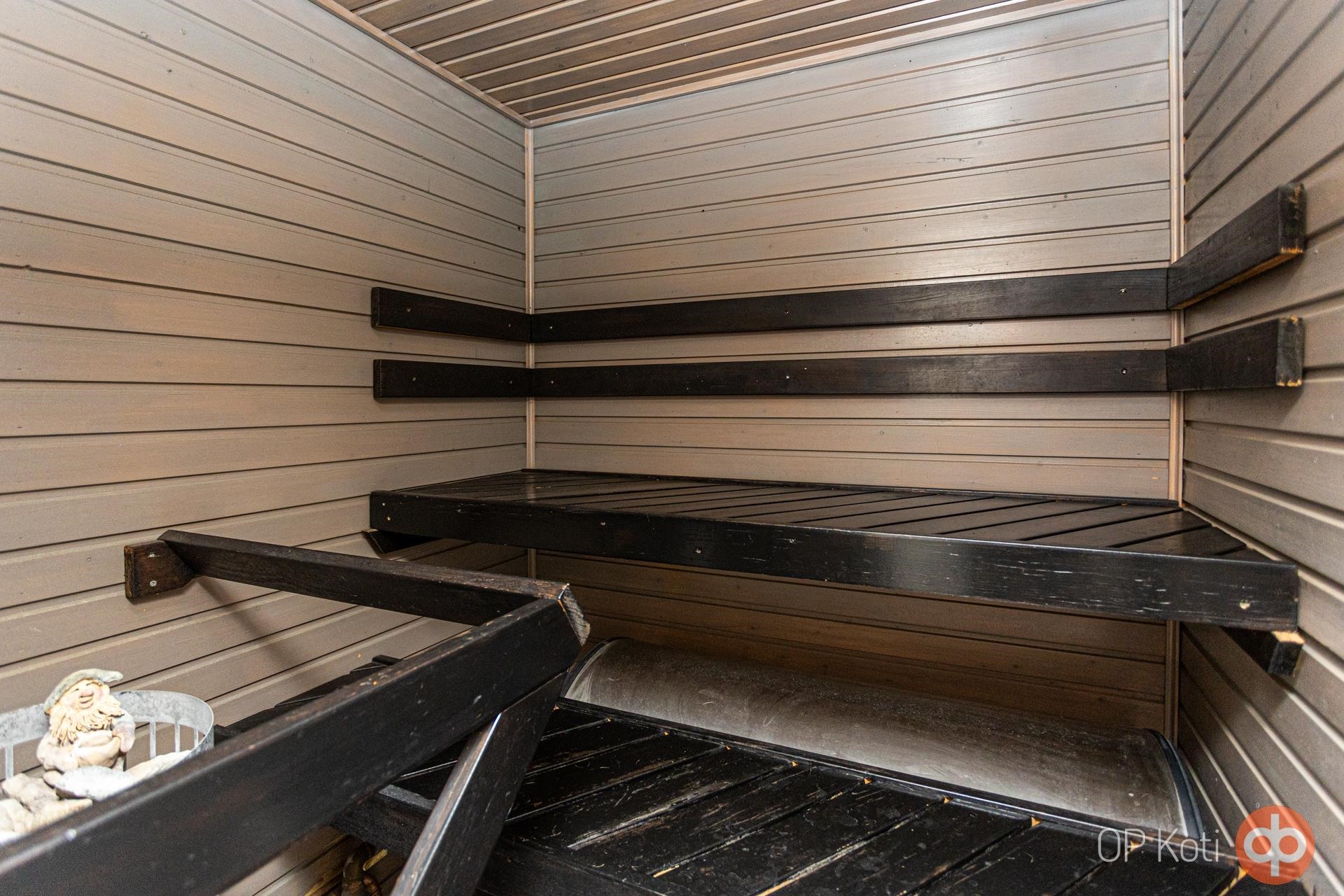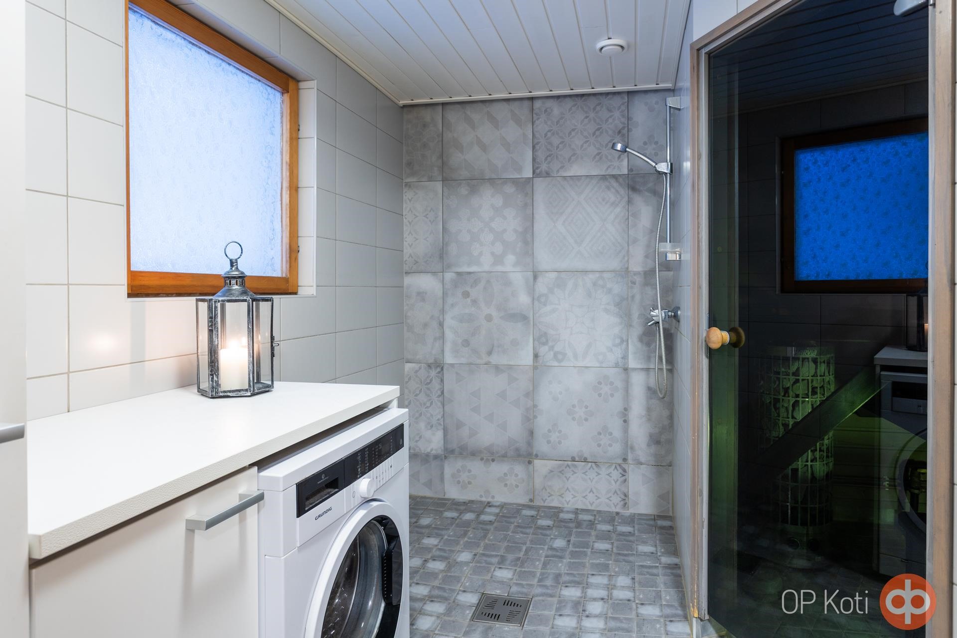 - Sauna, sähkökiuas, kylpyhuone, erillinen wc, suihku, peilikaappi, allaskaappi, pesukoneliitäntä, lattialämmitys eteinen, wc, kylpyhuone, kiinteät valaisimet. kylpyhuone ja saunaa uusittu 2016