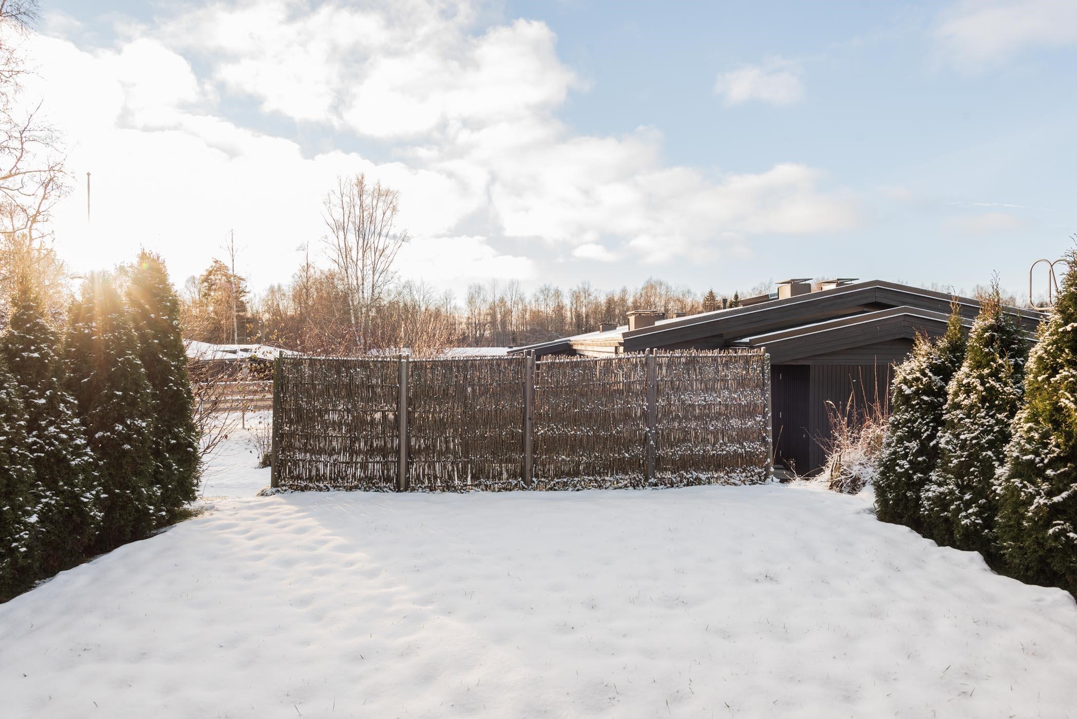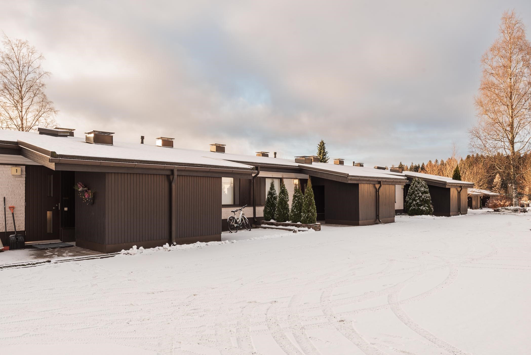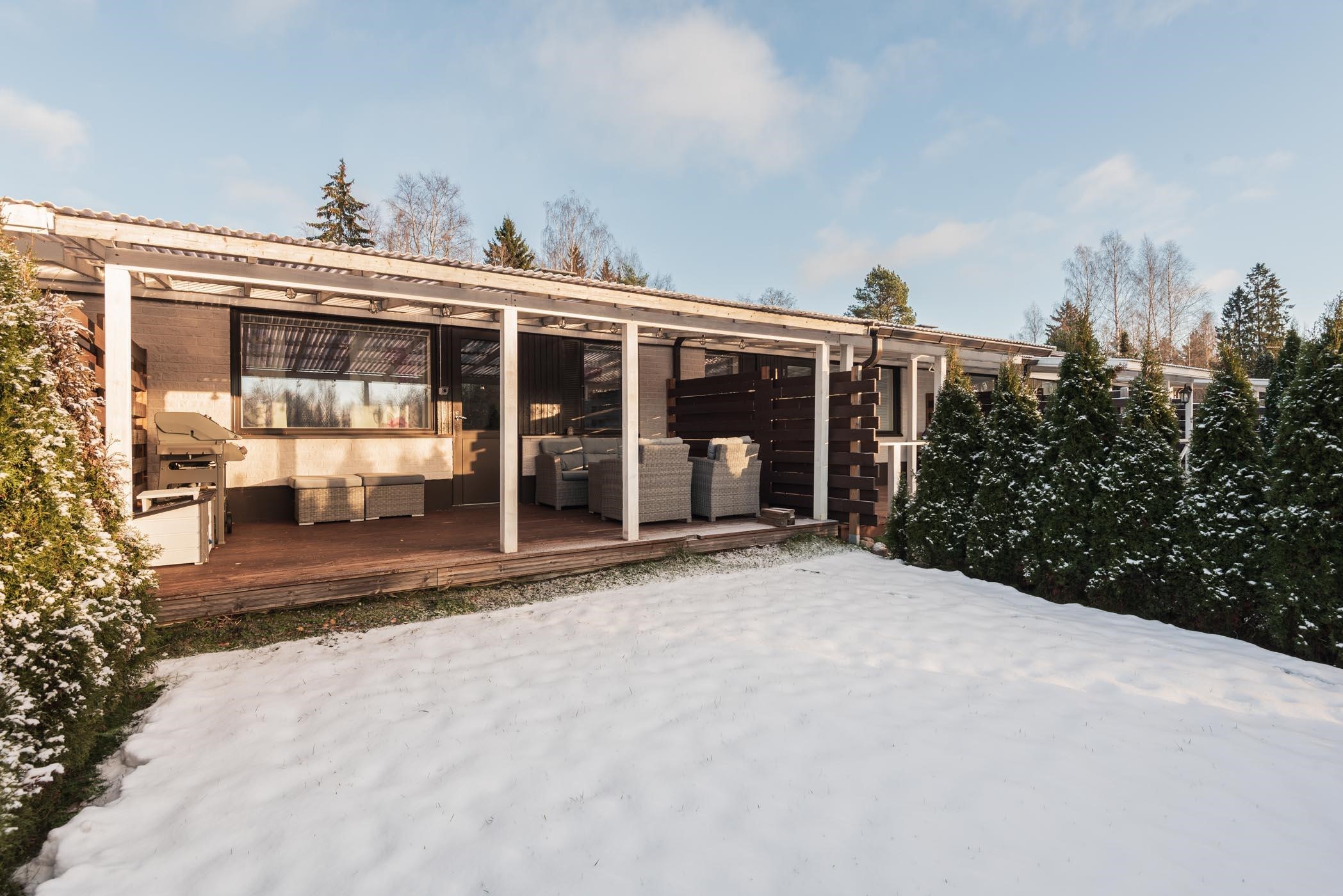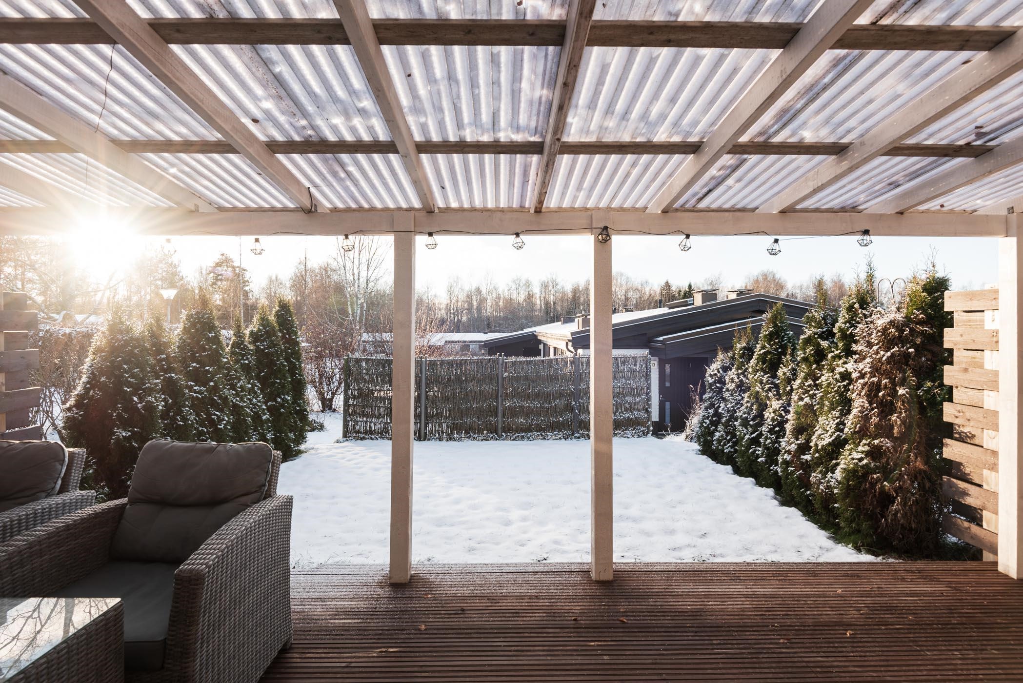 - Olohuone, keittiö ja takapiha lounaaseen, valokatettu terassi. Makuuhuone koilliseen.