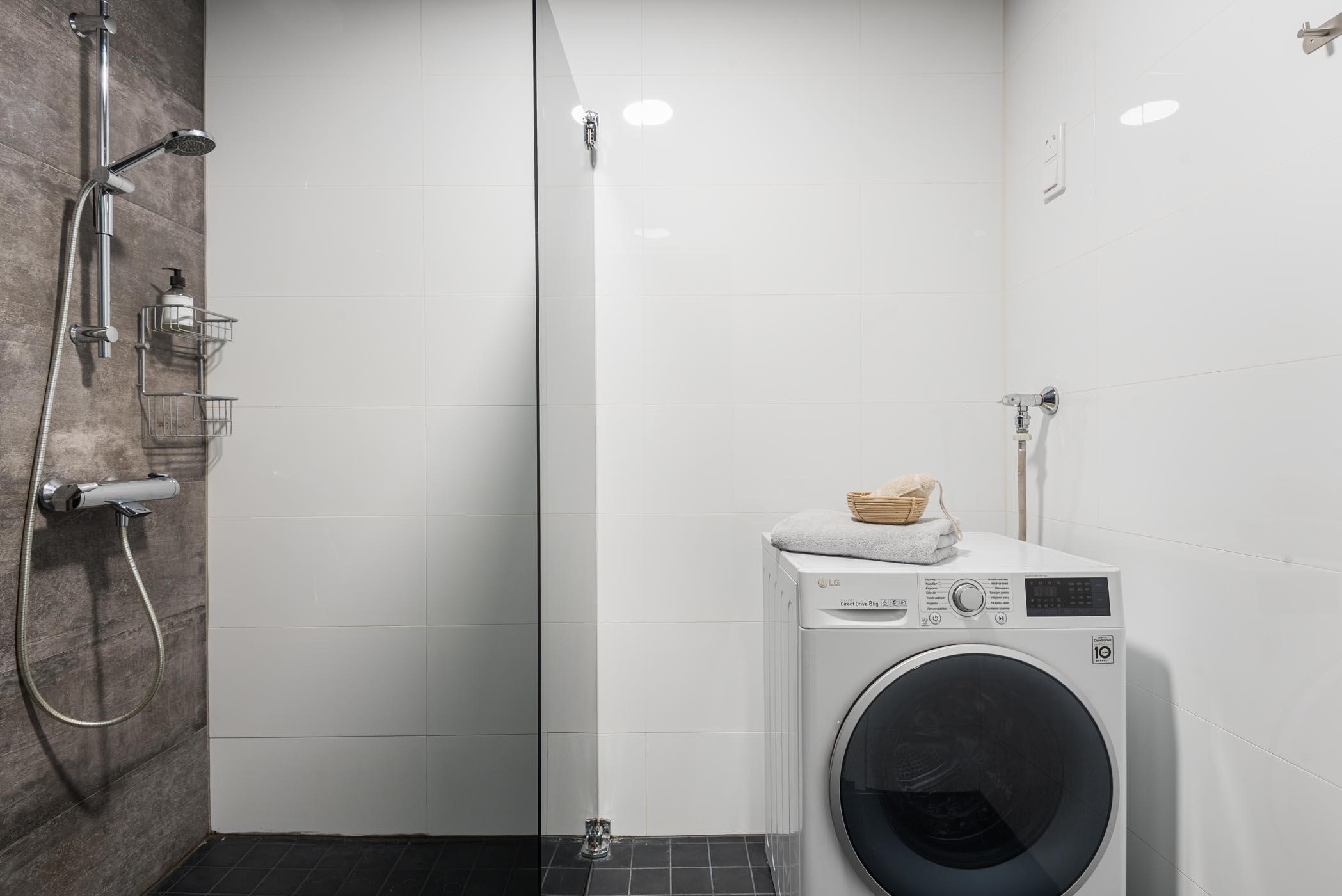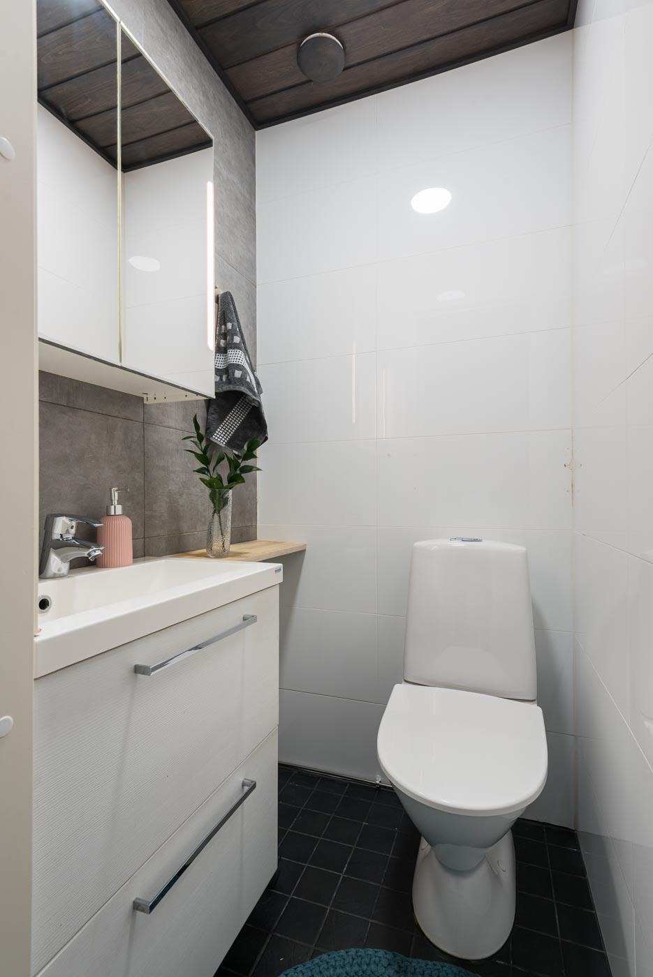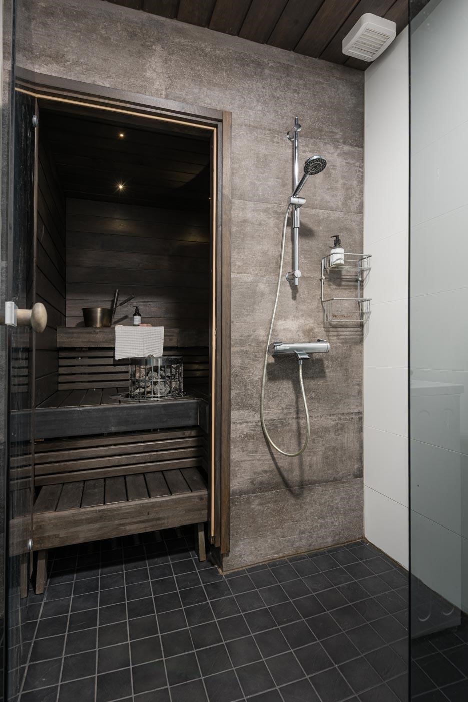 - Vuonna 2015 remontoitu saunaosasto ja erilliswc. Saunassa on etäohjattava Harvian Cilindro-sähkökiuas. kylpyhuoneessa on suihku, suihkuseinä, pesukoneliitäntä, lattialämmitys ja kiinteät valaisimet. Erillisessä wc:ssä on peilikaappi, allaskaappi, pieni laskutaso ja bidee.