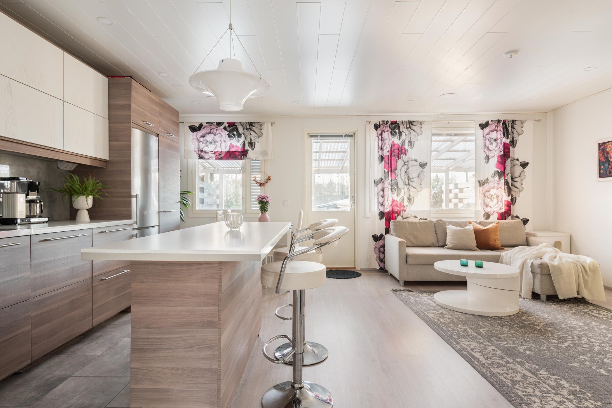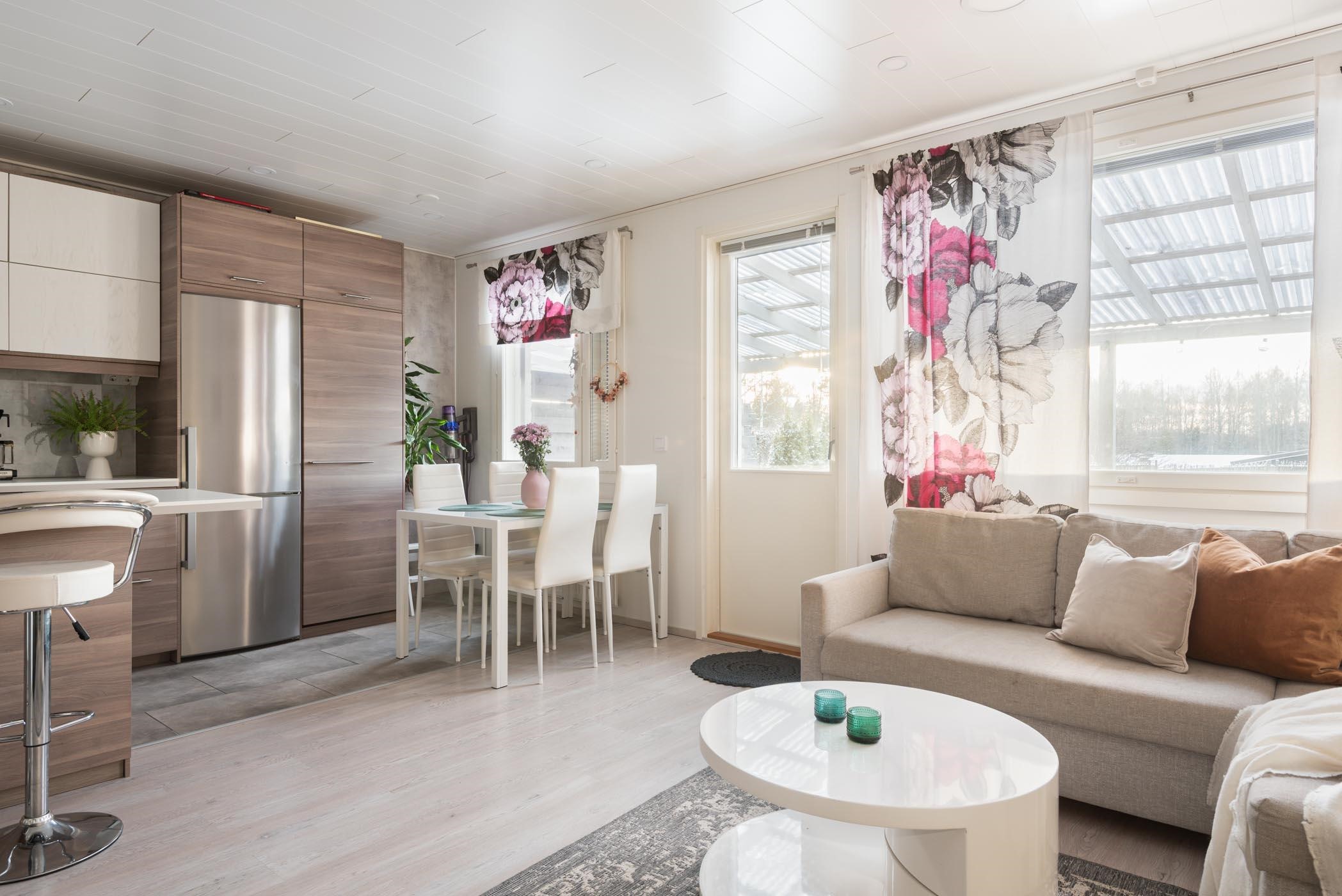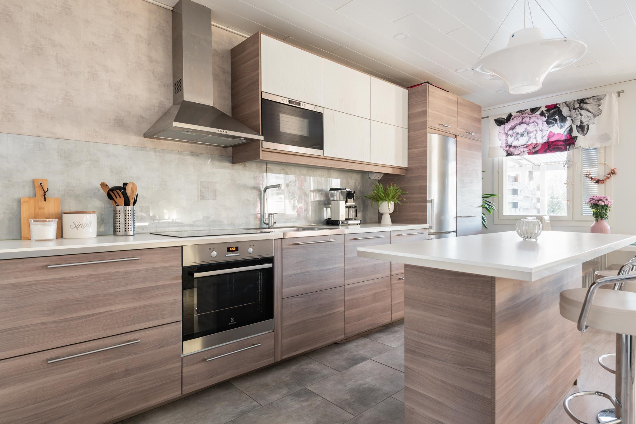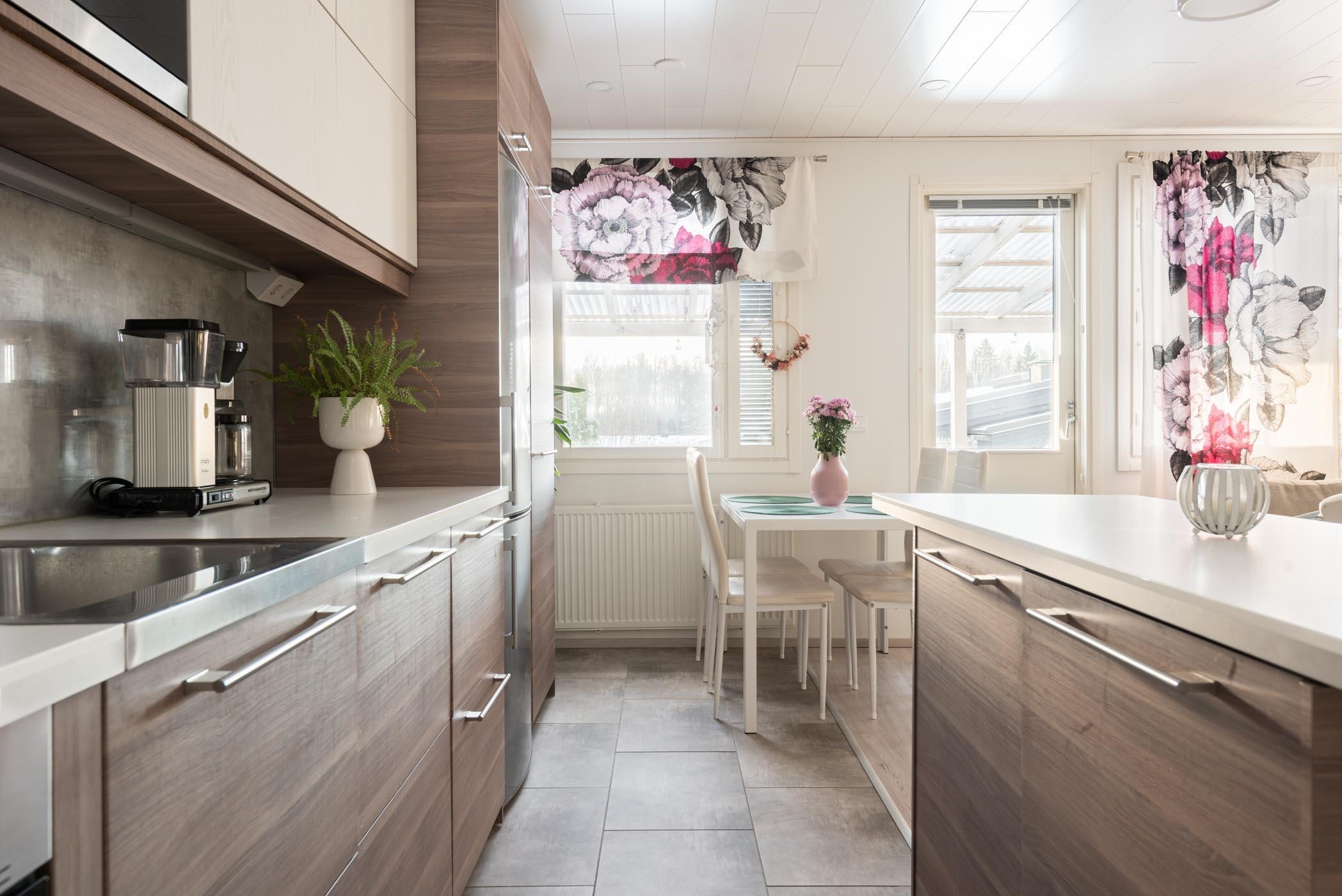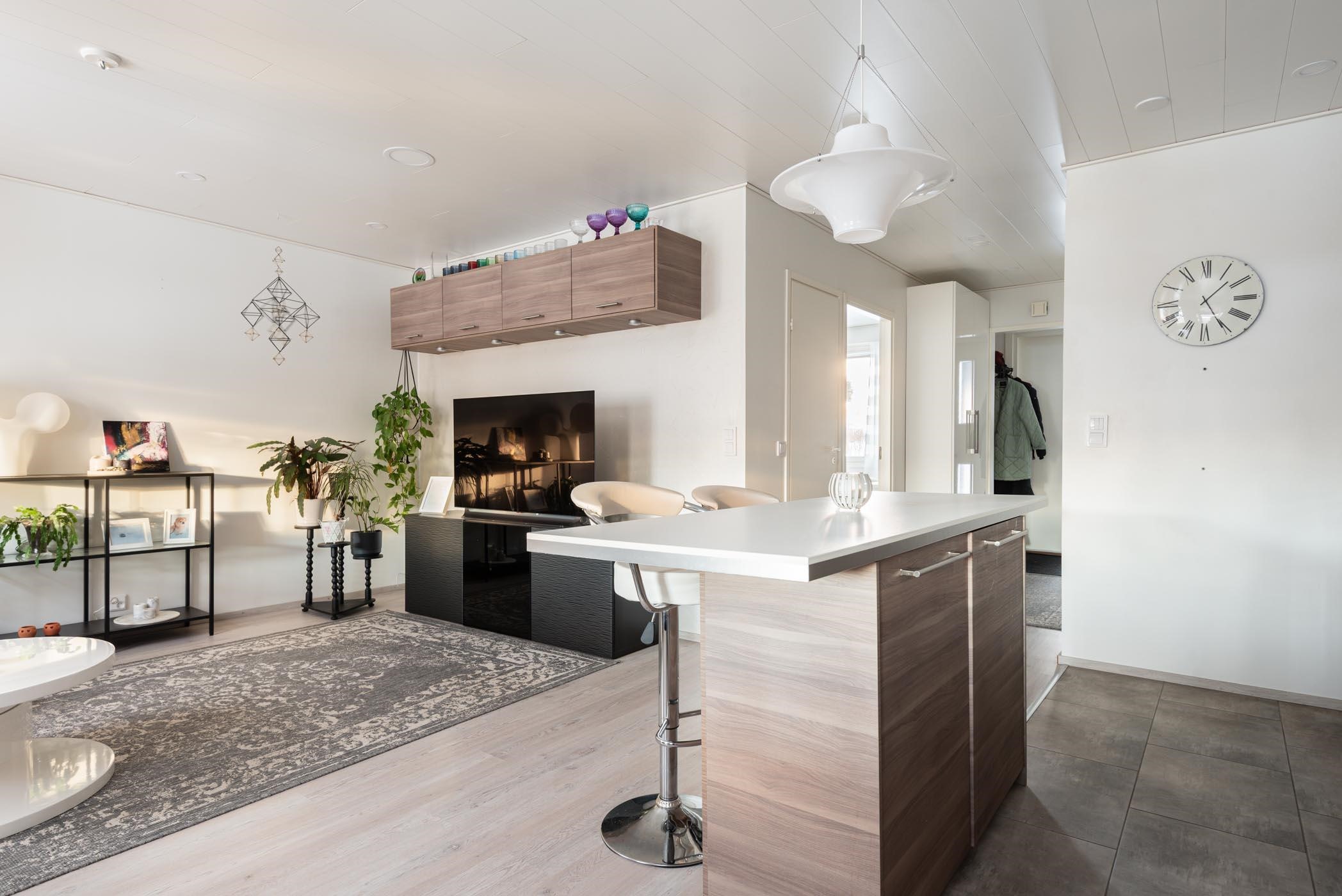 Vuonna 1983 valmistunut koti on kokenut perusteellisen remontin vuonna 2015, jolloin keittiö, kylpyhuone, sauna ja wc on päivitetty nykyaikaisiksi. Keittiö on kodin sydän, jossa saarekkeellinen ratkaisu tarjoaa runsaasti säilytys- ja laskutilaa. Varusteisiin kuuluvat modernit kodinkoneet, kuten kalusteeseen integroidut astianpesukone ja mikroaaltouuni sekä rosterinen liesituuletin ja jääkaappipakastin. Olohuone ja keittiö avautuvat lounaaseen, tuoden runsaasti luonnonvaloa sisään.