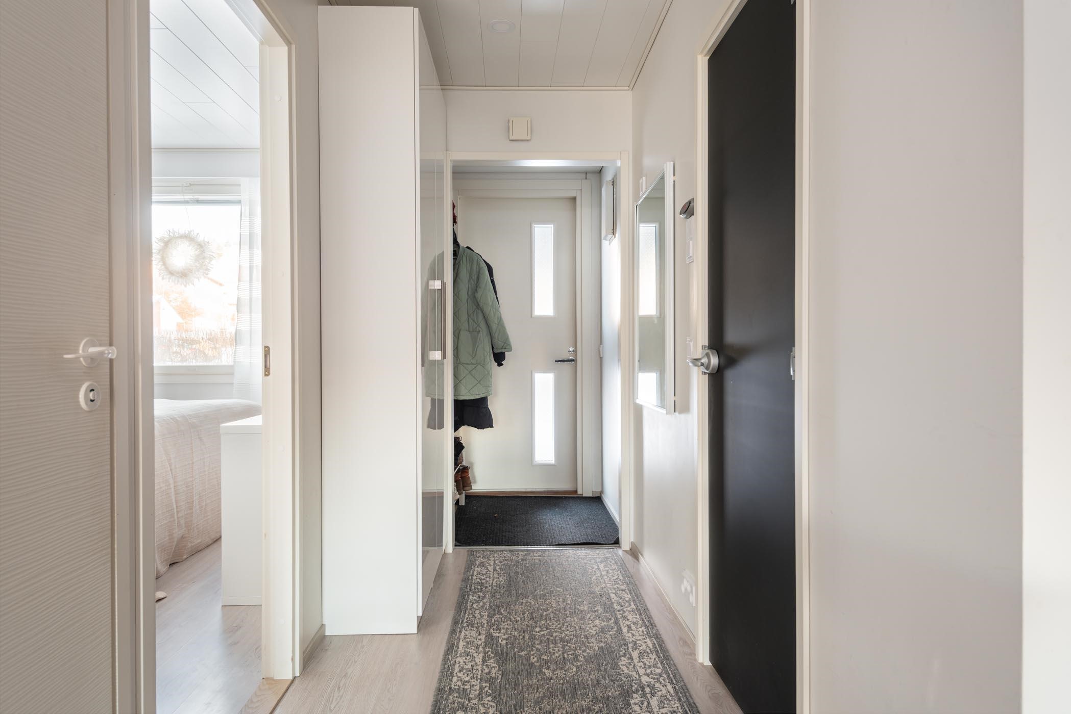 - Tuulikaappi (ilman ovea): laatta, maali/sisustuskiveä. Keittiö: laatta, tapetti. Olohuone: laminaatti, maali/sisustuslaasti ja maali. Makuuhuone 1: laminaatti, maali/ tapetti. Sauna: laatta, panelointi. Kylpyhuone: laatta, laatta ja wc. Eteinen ja vaatehuone: laminaatti, maali.