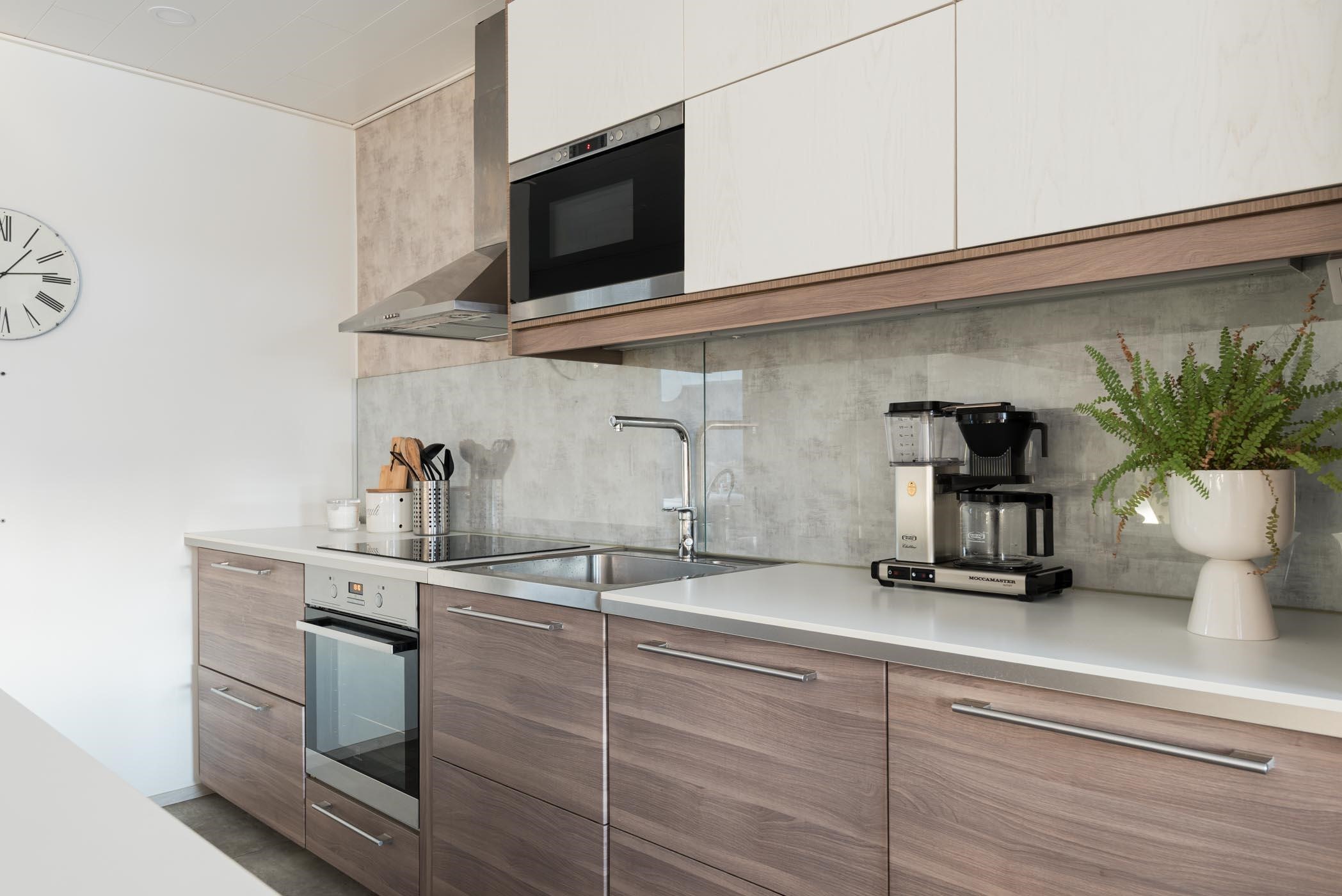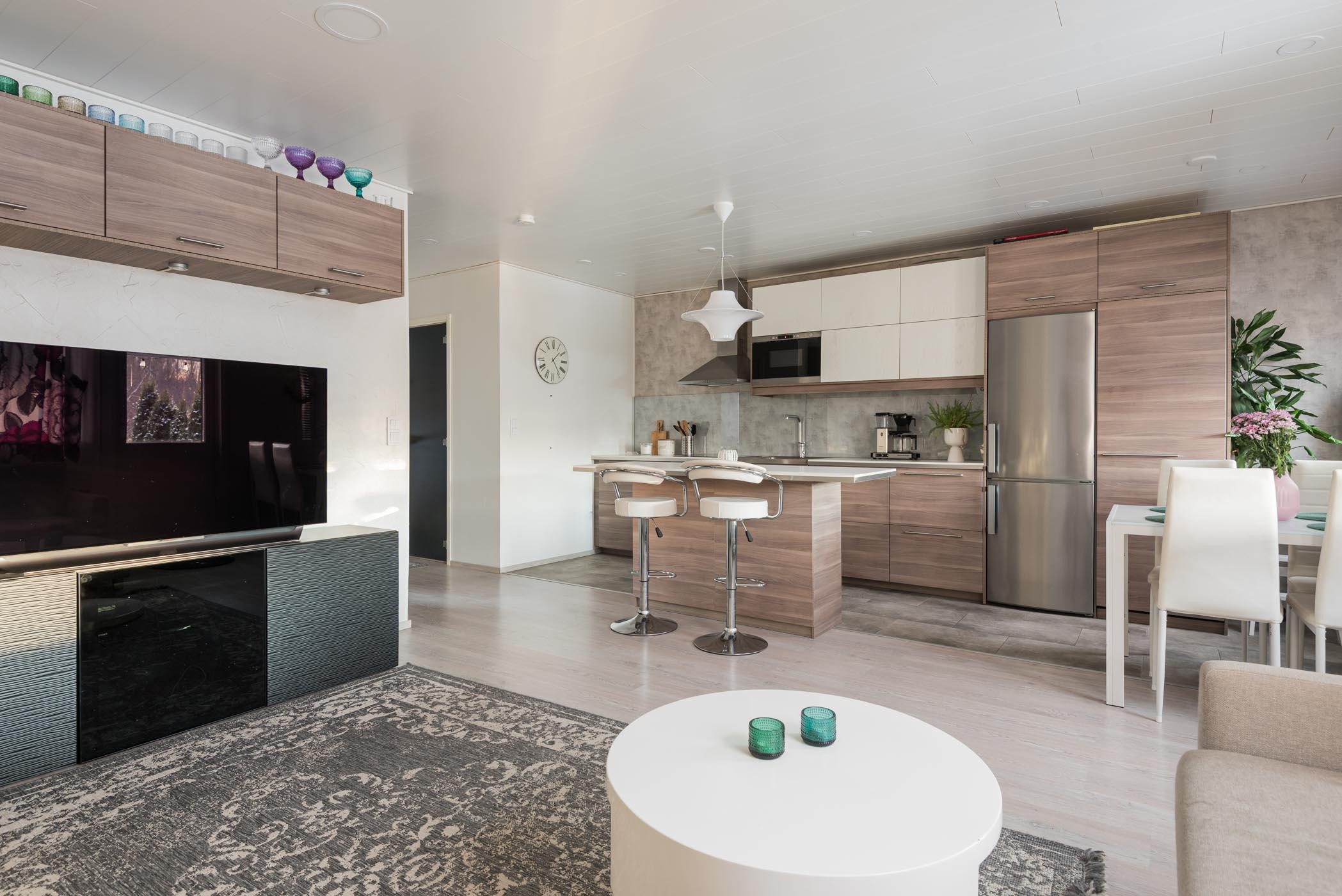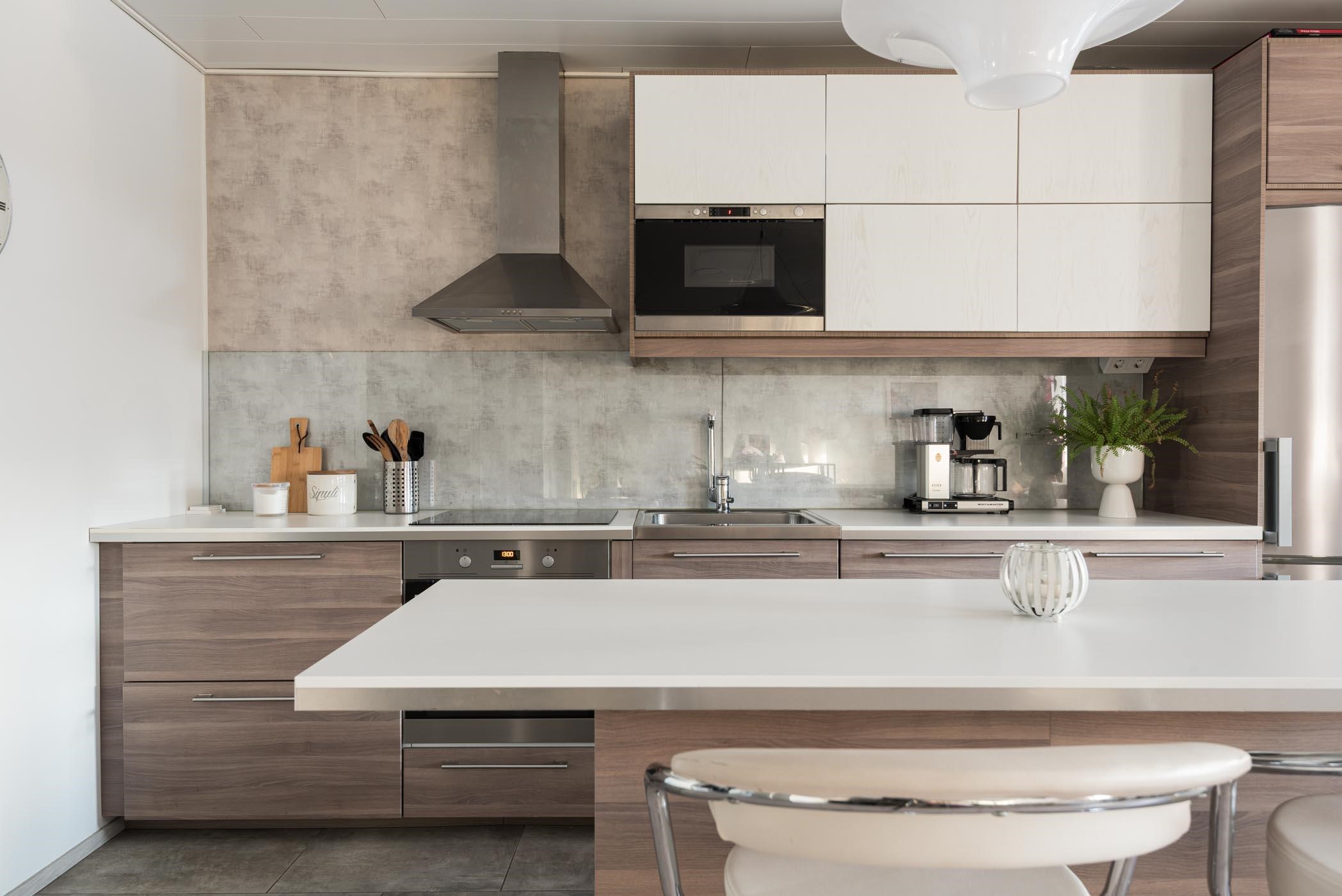 - Vuonna 2015 remontoitu kaunis saarekkeellinen keittiö, jonka varusteisiin kuuluvat jääkaappipakastin, erillisuuni, liesitaso, liesituuletin, kalusteeseen integroitu mikroaaltouuni, kalusteeseen integroitu astianpesukone, kaapistot ja led valaisimet (myös ylhäällä tunnelmavalo). Saarekkeessa mukavasti säilytys- ja laskutilaa.