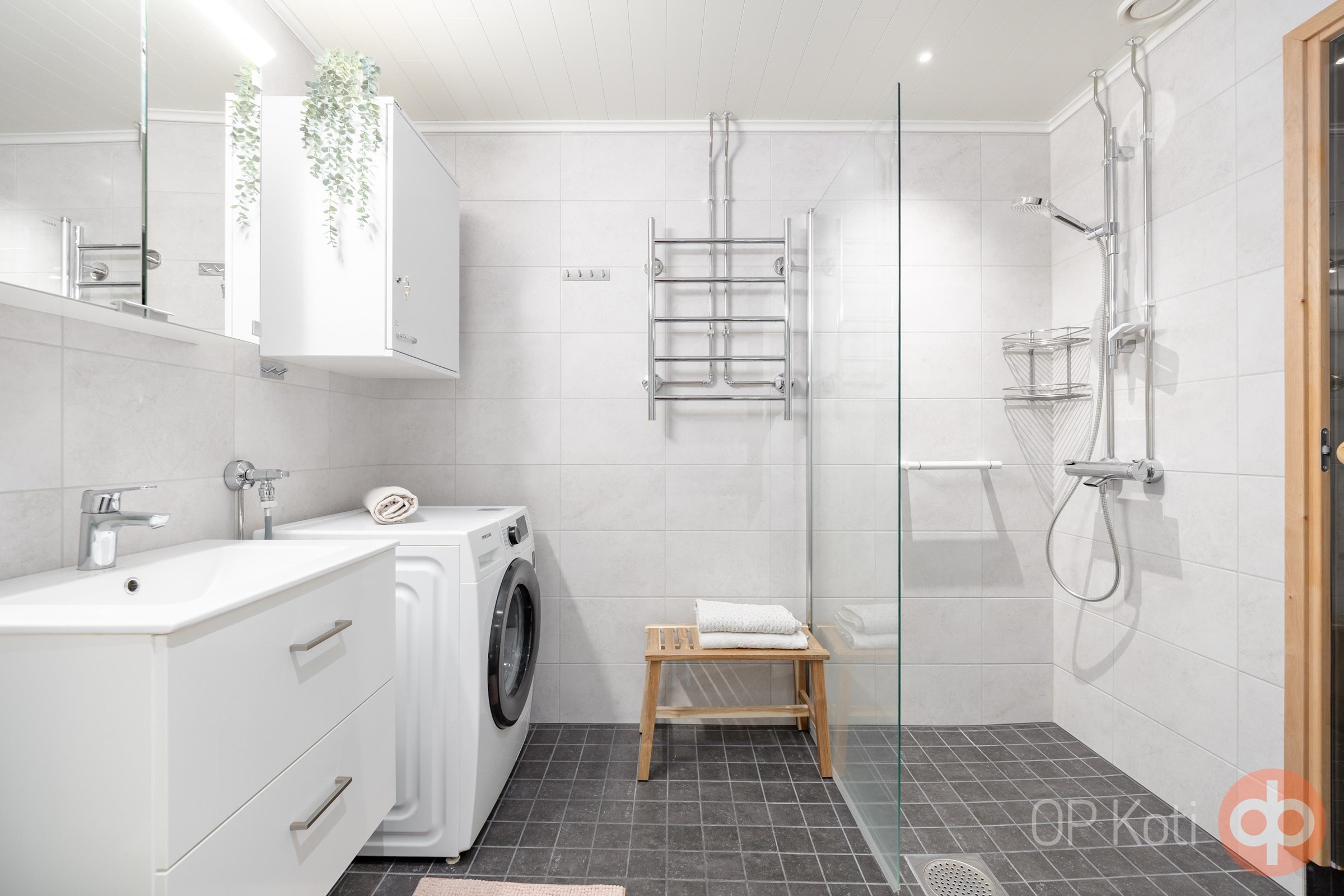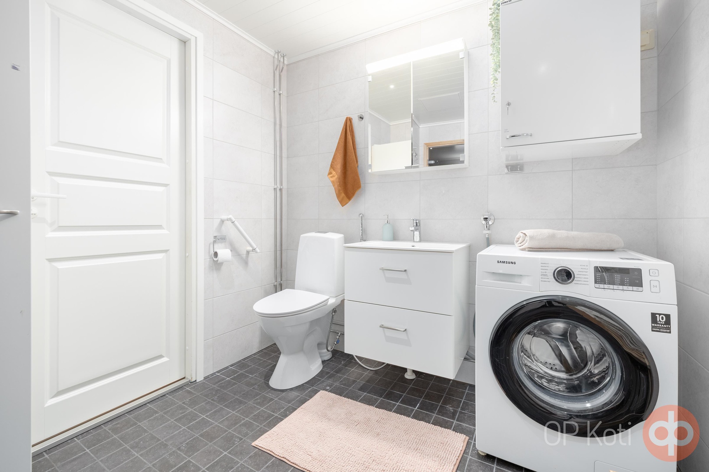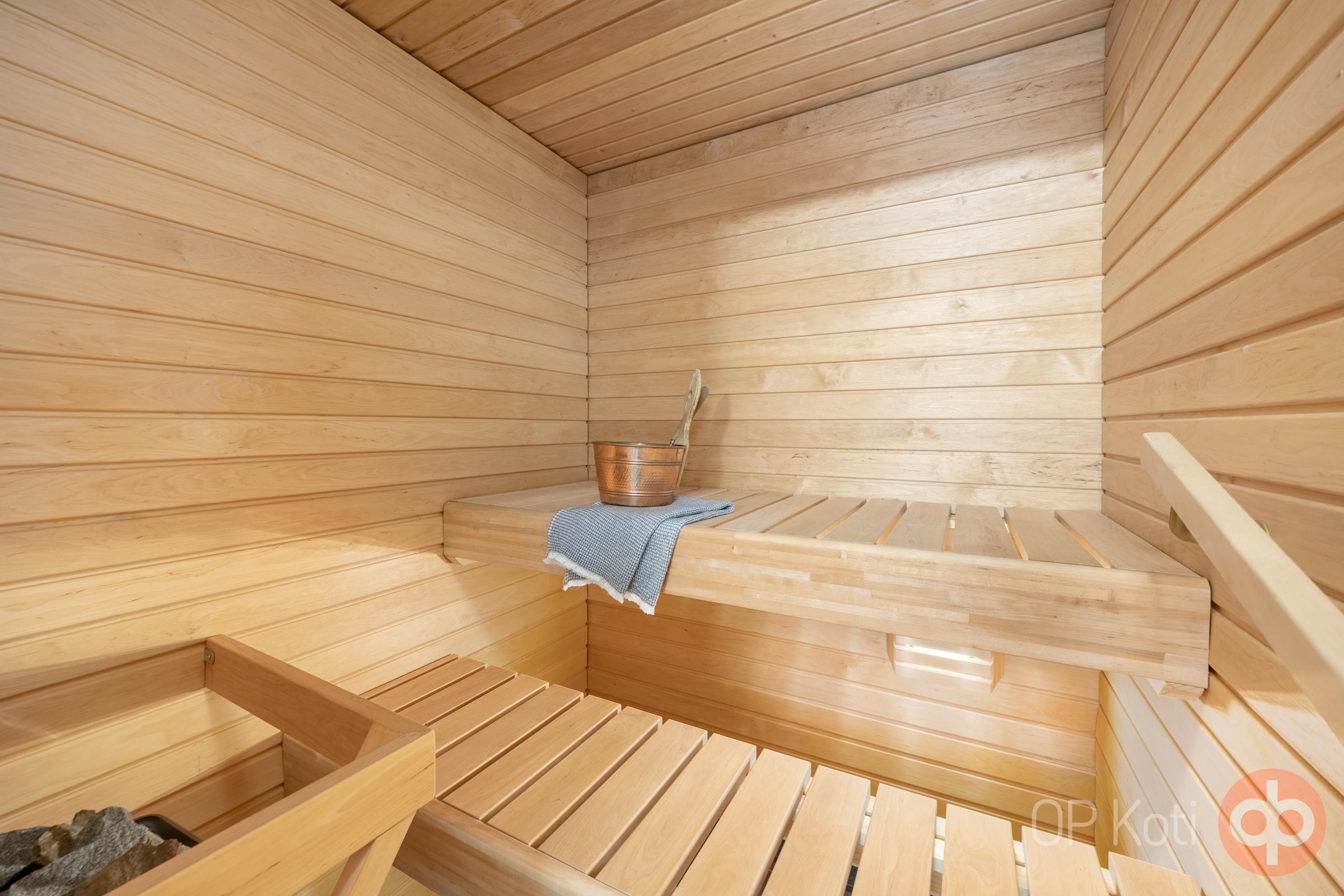 - Sauna, sähkökiuas, kylpyhuone, suihku, suihkuseinä, peilikaappi, kaapit, allaskaappi, pesukoneliitäntä, kiinteät valaisimet. putkiremontin yhteydessä kylpyhuone ja sauna uusittu (laatat, paneelit, kylpyhuoneen kalusteet)