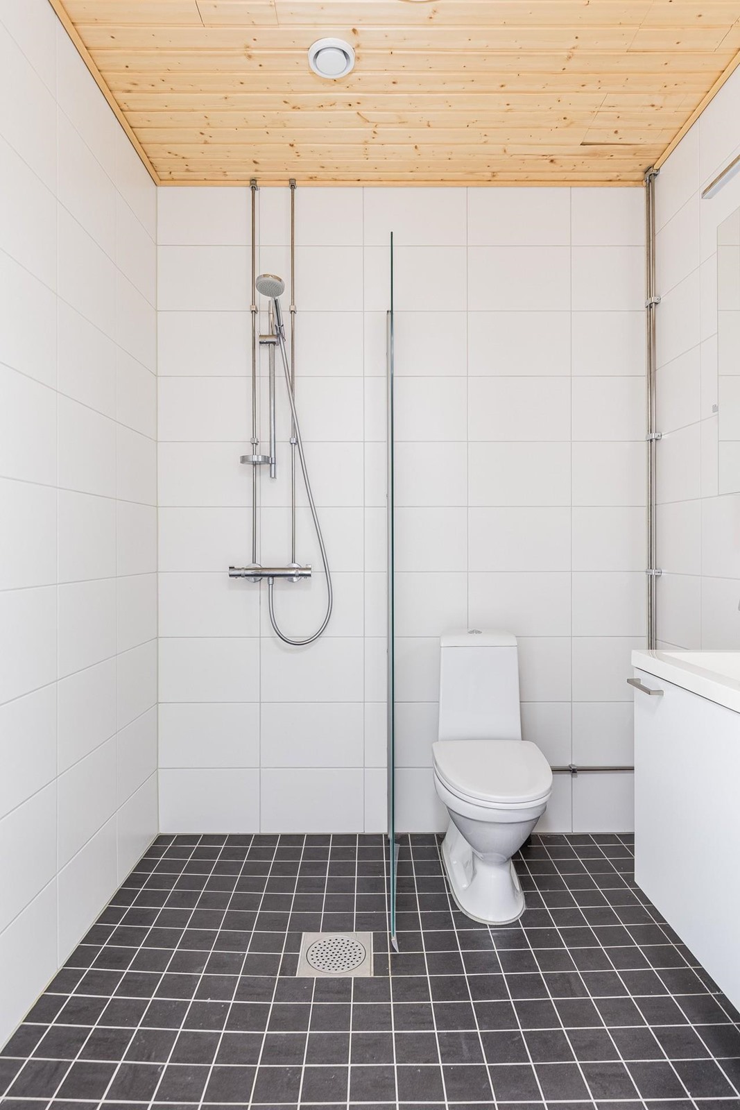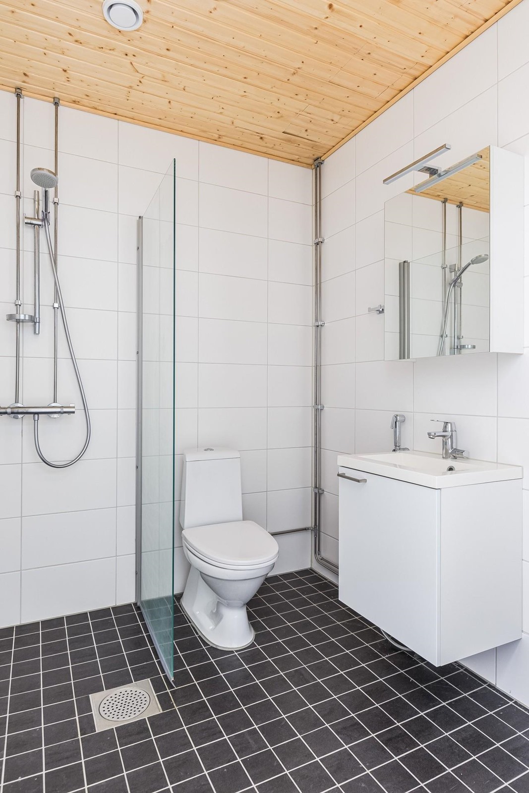 - Kylpyhuone, suihku, suihkuseinä, peilikaappi, allaskaappi, pesukoneliitäntä, lattialämmitys sähköinen mukavuuslämmitys, kiinteät valaisimet.