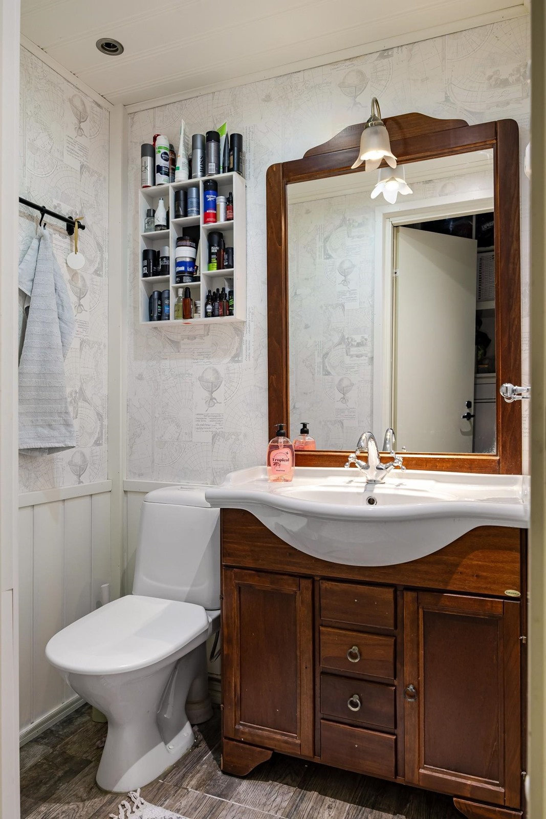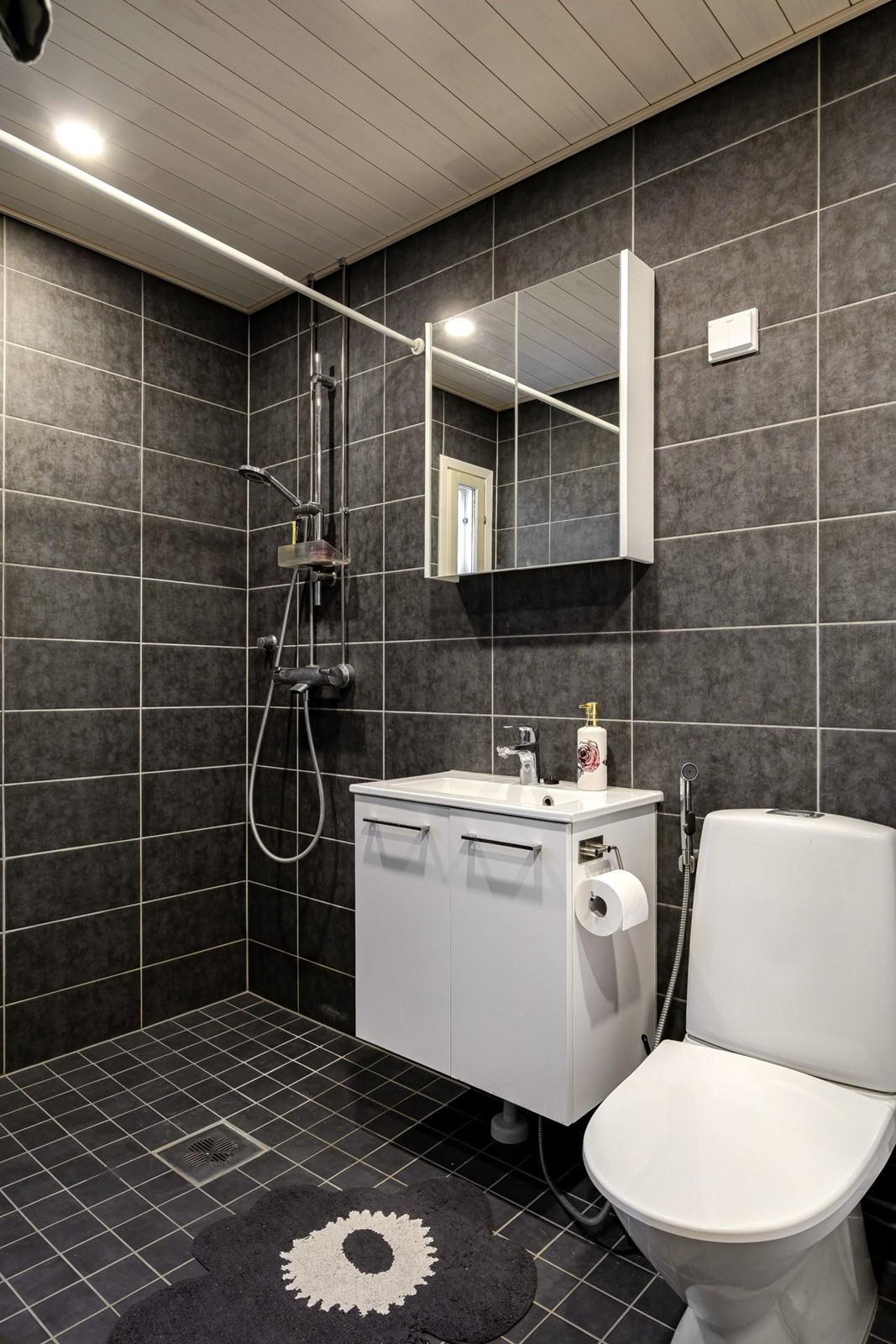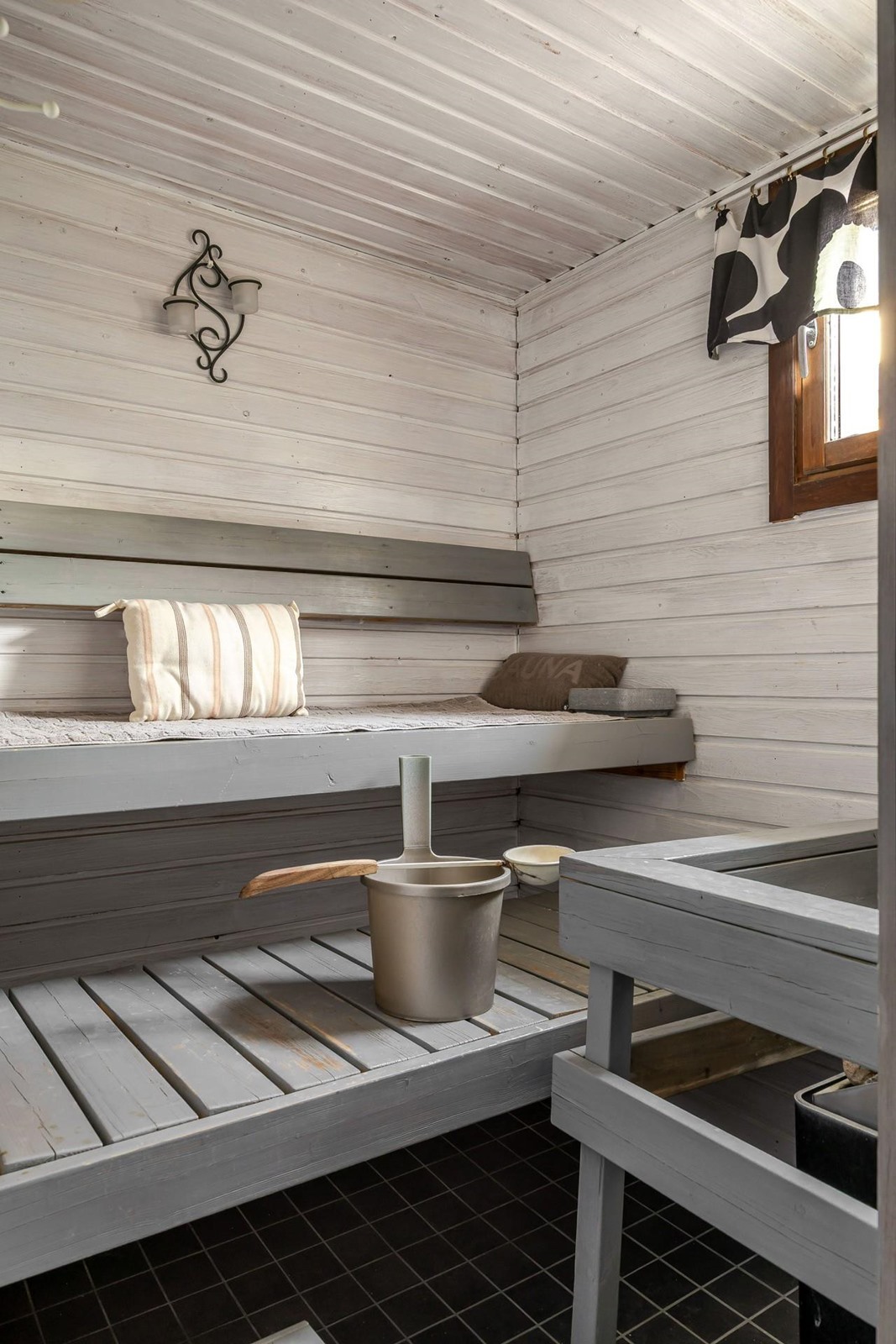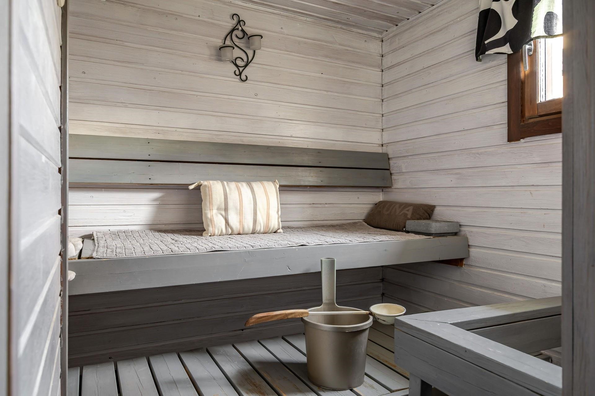 - Sauna, sähkökiuas, kylpyhuone (suihku, wc-istuin, allas, peilikaappi, pesukoneliitäntä, lämminvesivaraaja), erillinen wc (wc-istuin, peili, allas ja allaskaappi), pesukoneliitäntä (alakerrassa apukeittiössä ja yläkerrassa kylpyhuoneessa), lattialämmitys (kylpyhuoneessa), kiinteät valaisimet.