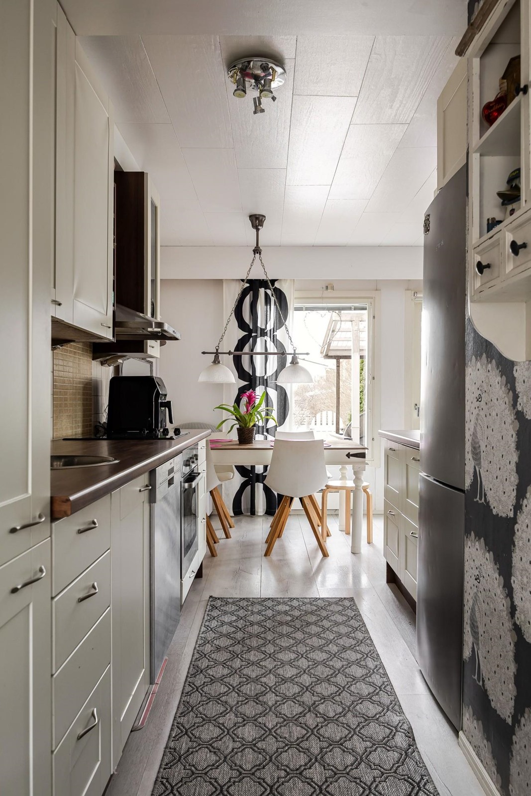 - Jääkaappipakastin, keraaminen liesi ja sähköuuni, liesituuletin, astianpesukone, kaapistot, kiinteät valaisimet.