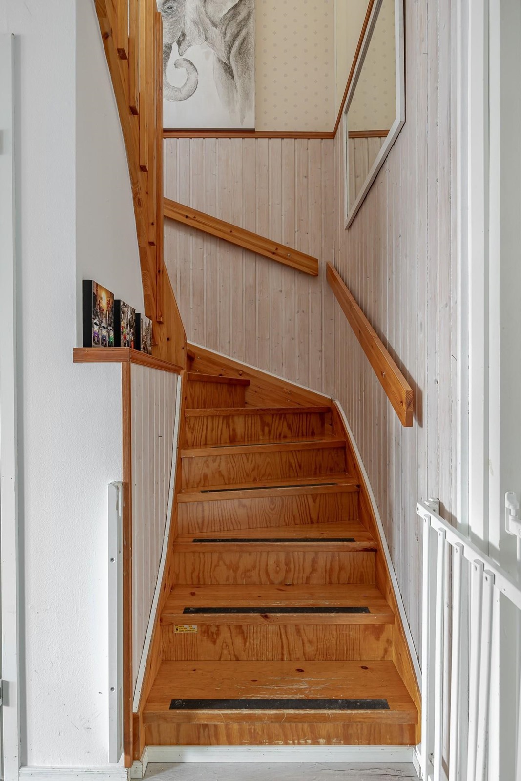 Alakerrassa: lattia laminaattia, seinät maali/tapetti, erililnen wc: lattia laattaa ja seinä tapettia. Yläkerrassa: lattia laminaattia, seinät maali/tapetti, kylpyhuone laattaa, saunan lattia laattaa, seinät paneeli.