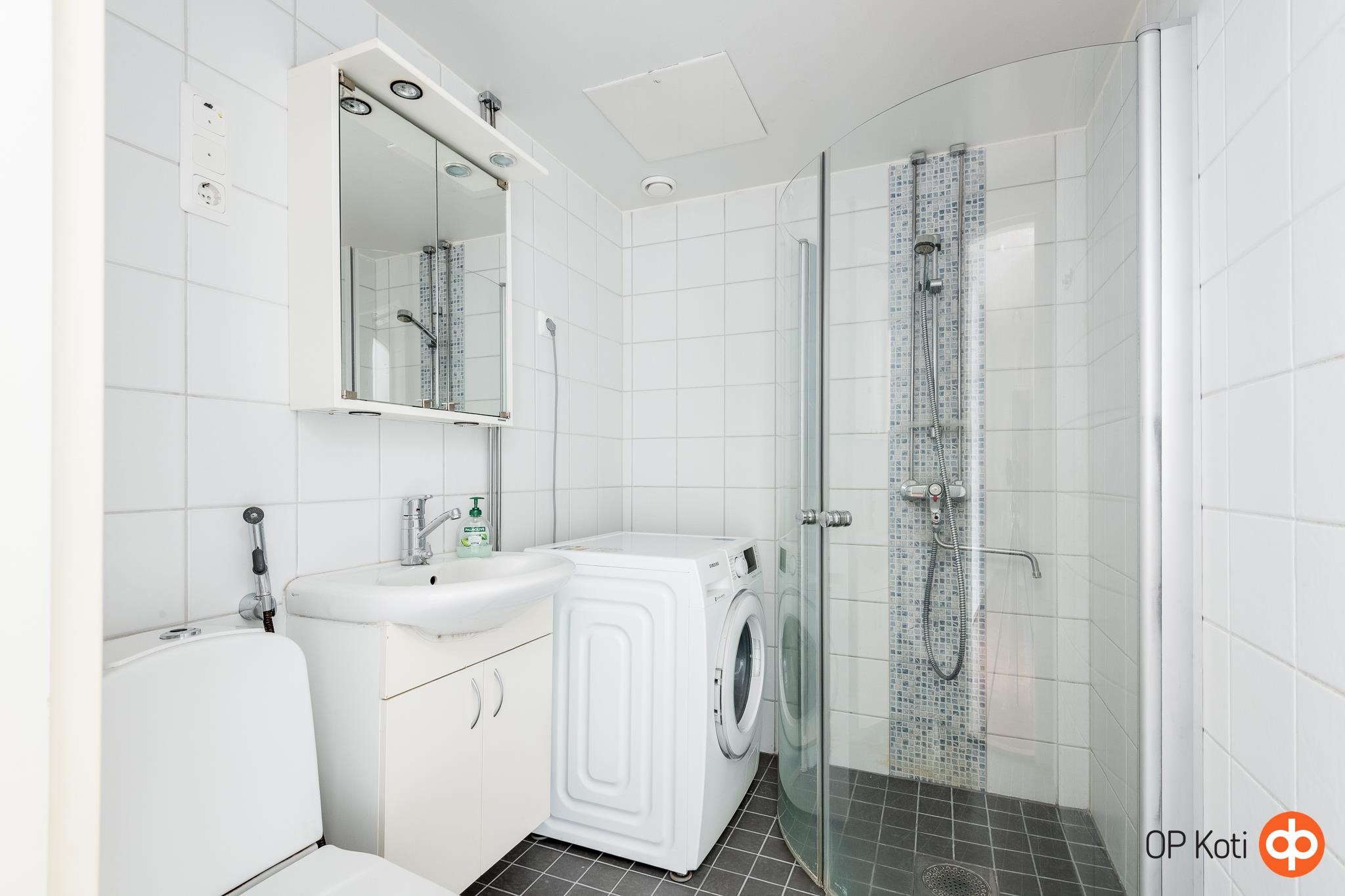 - Suihkuseinä kääntyvät, peilikaappi, allaskaappi, pesukoneliitäntä, lattialämmitys.