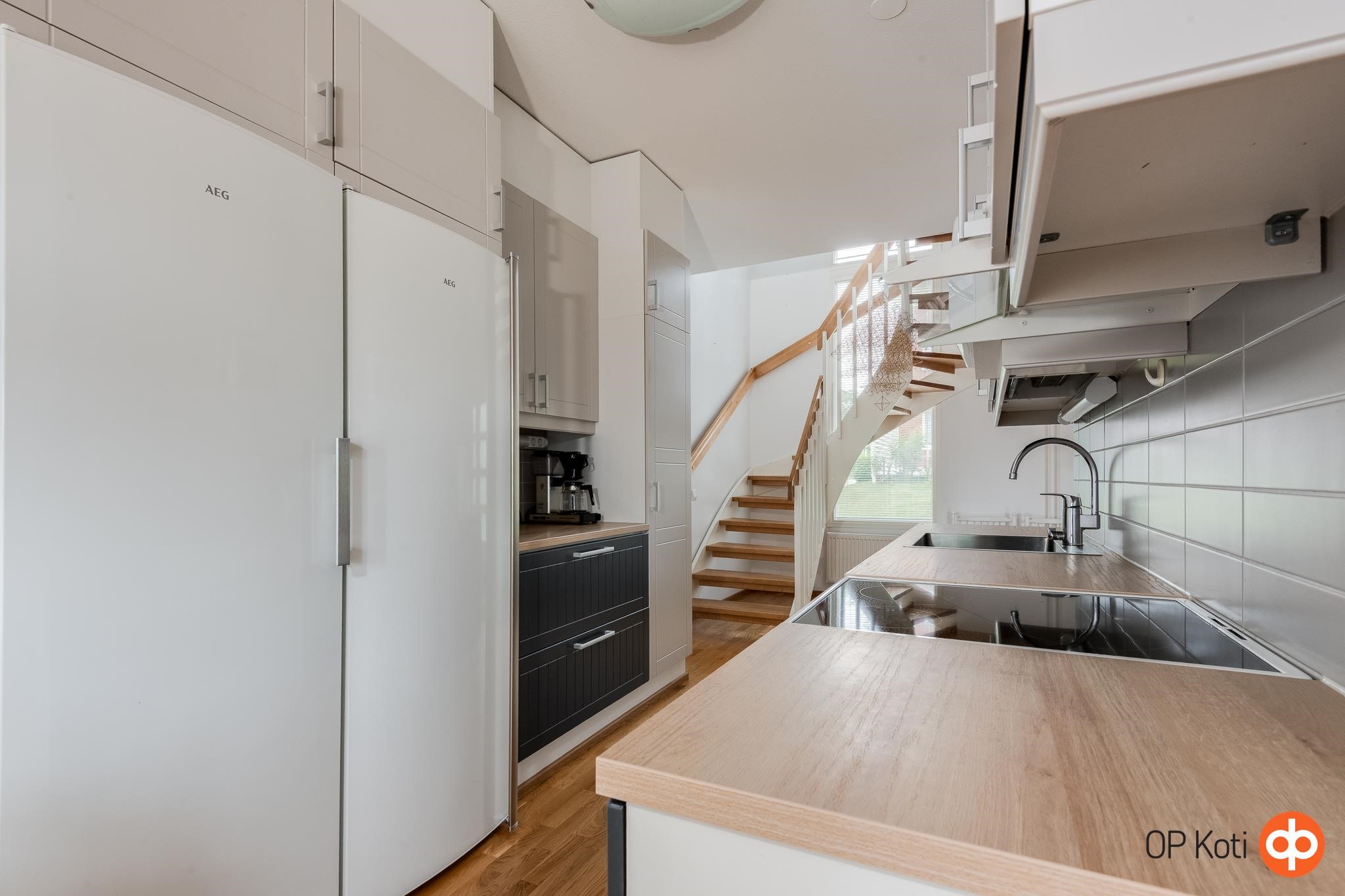 - Jääkaappi, pakastekaappi, keraaminen liesi, liesituuletin, astianpesukone, kaapistot, kiinteät valaisimet.