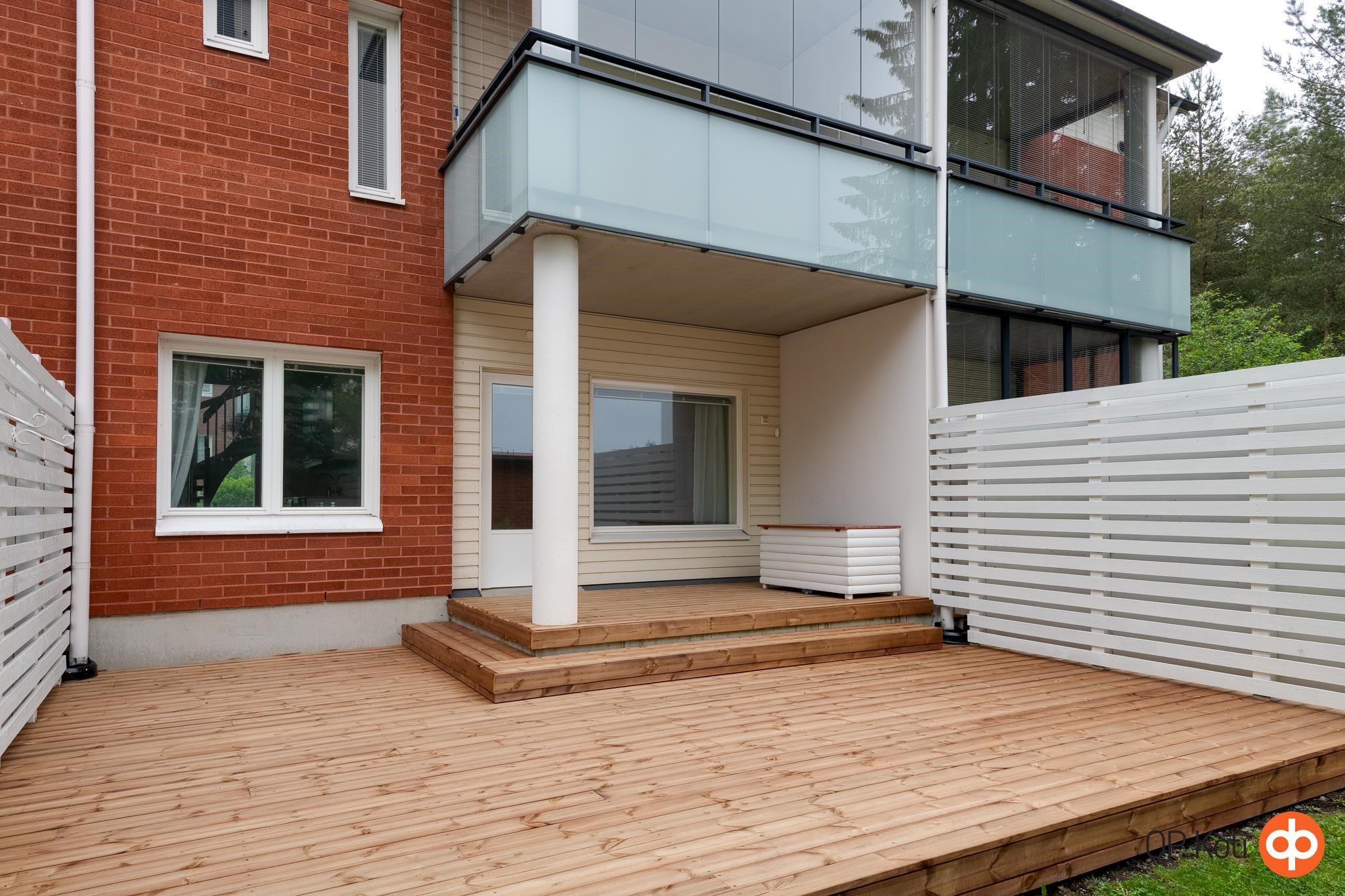 - Yläkerrassa lasitettu parveke länteen. Parvekkeen lisäksi maantasolla tilava terassialue