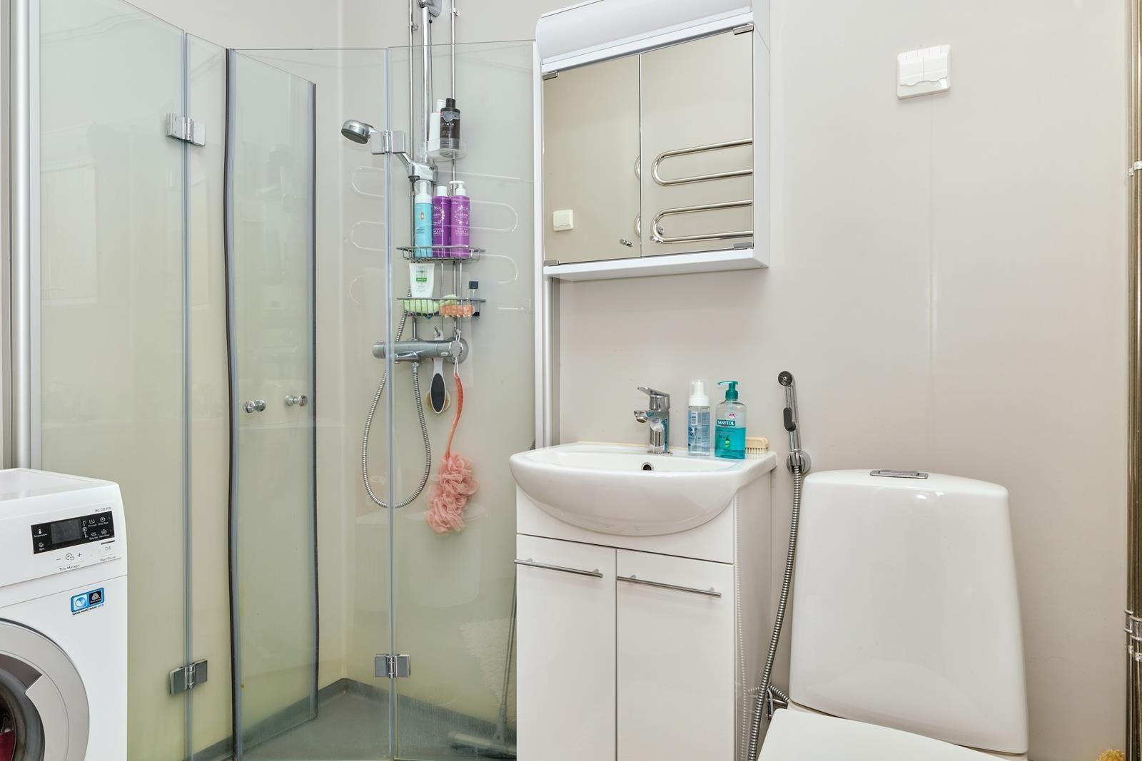 - Kylpyhuone, suihku, suihkuseinä, pesukoneliitäntä, kiinteät valaisimet.