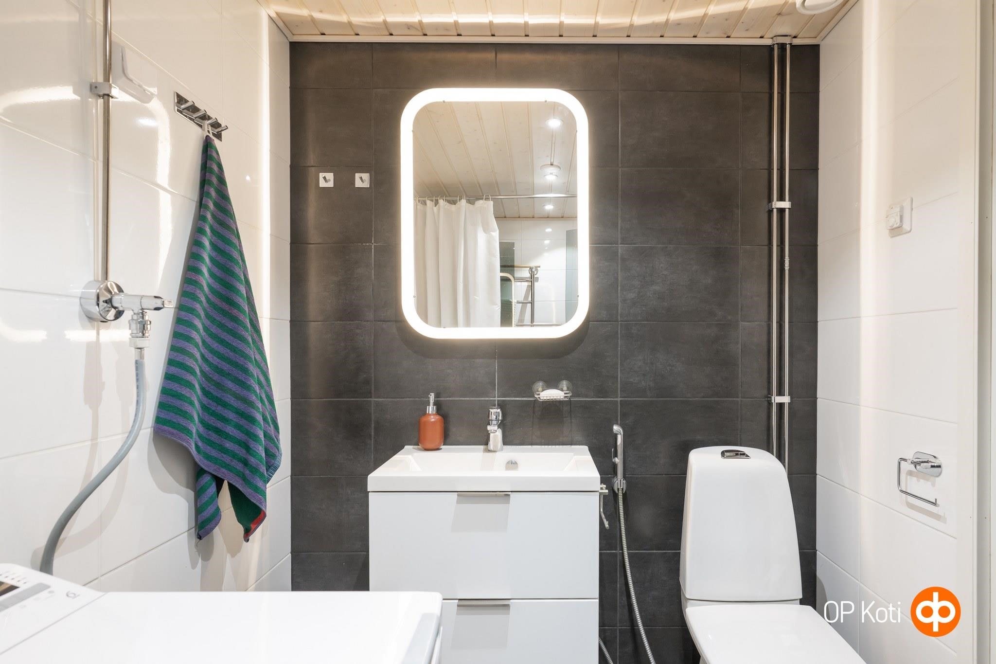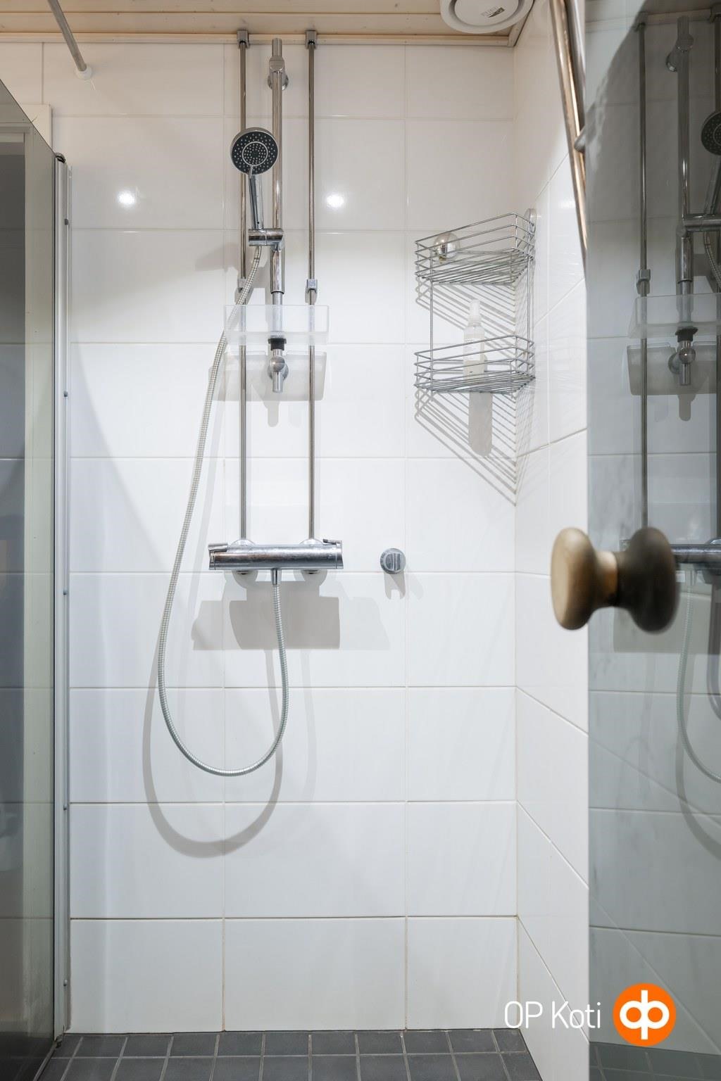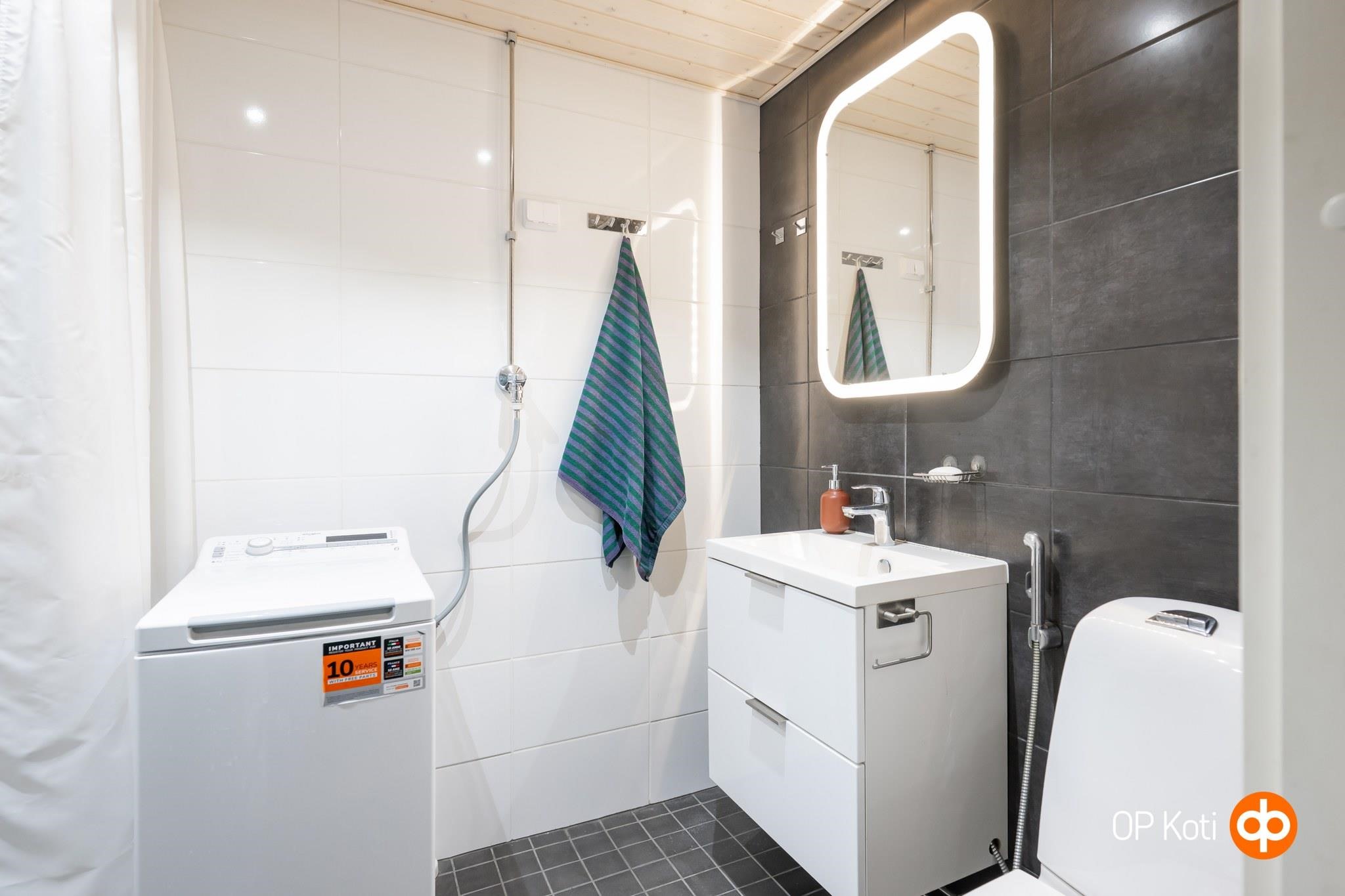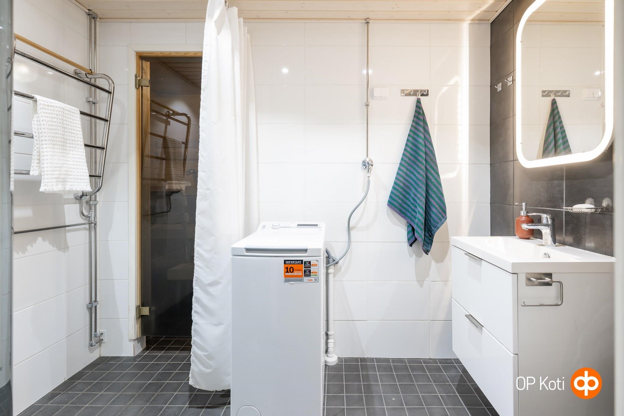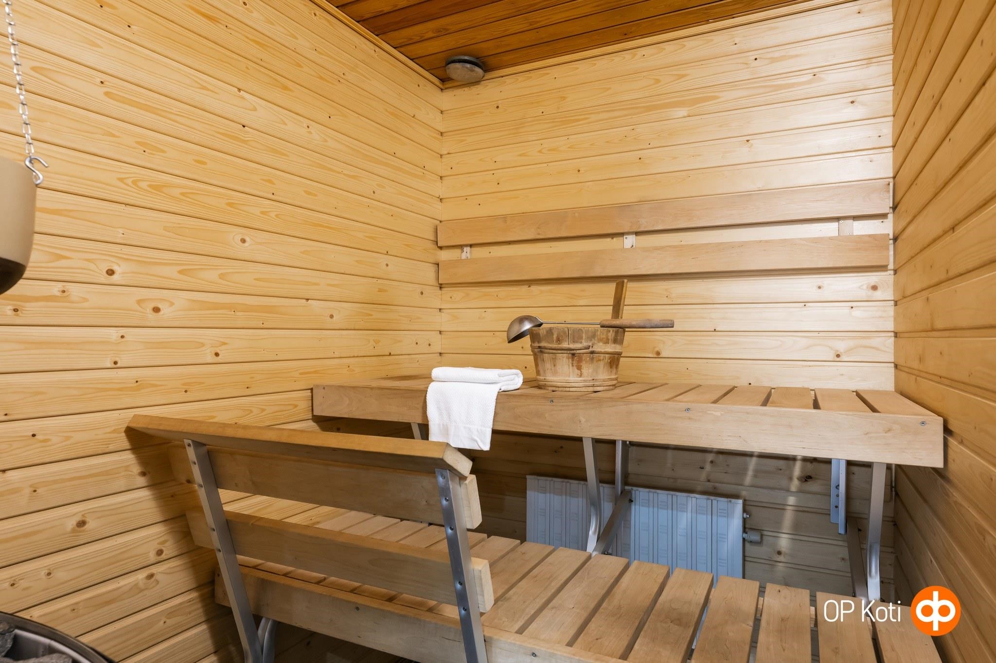 - Sauna, sähkökiuas, kylpyhuone, suihku, suihkuseinä, peilit, allaskaappi, pesukoneliitäntä, lattialämmitys, kiinteät valaisimet.