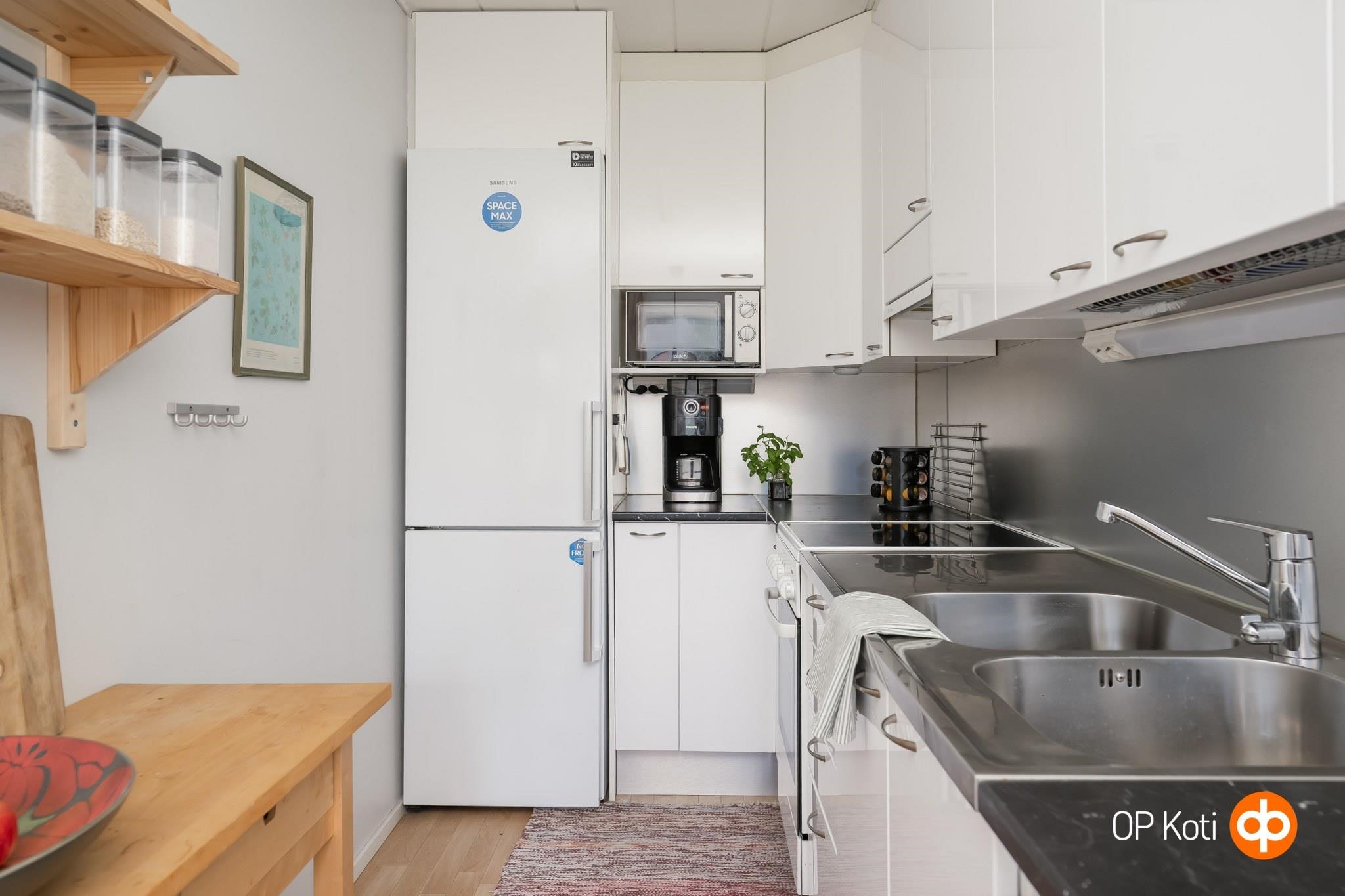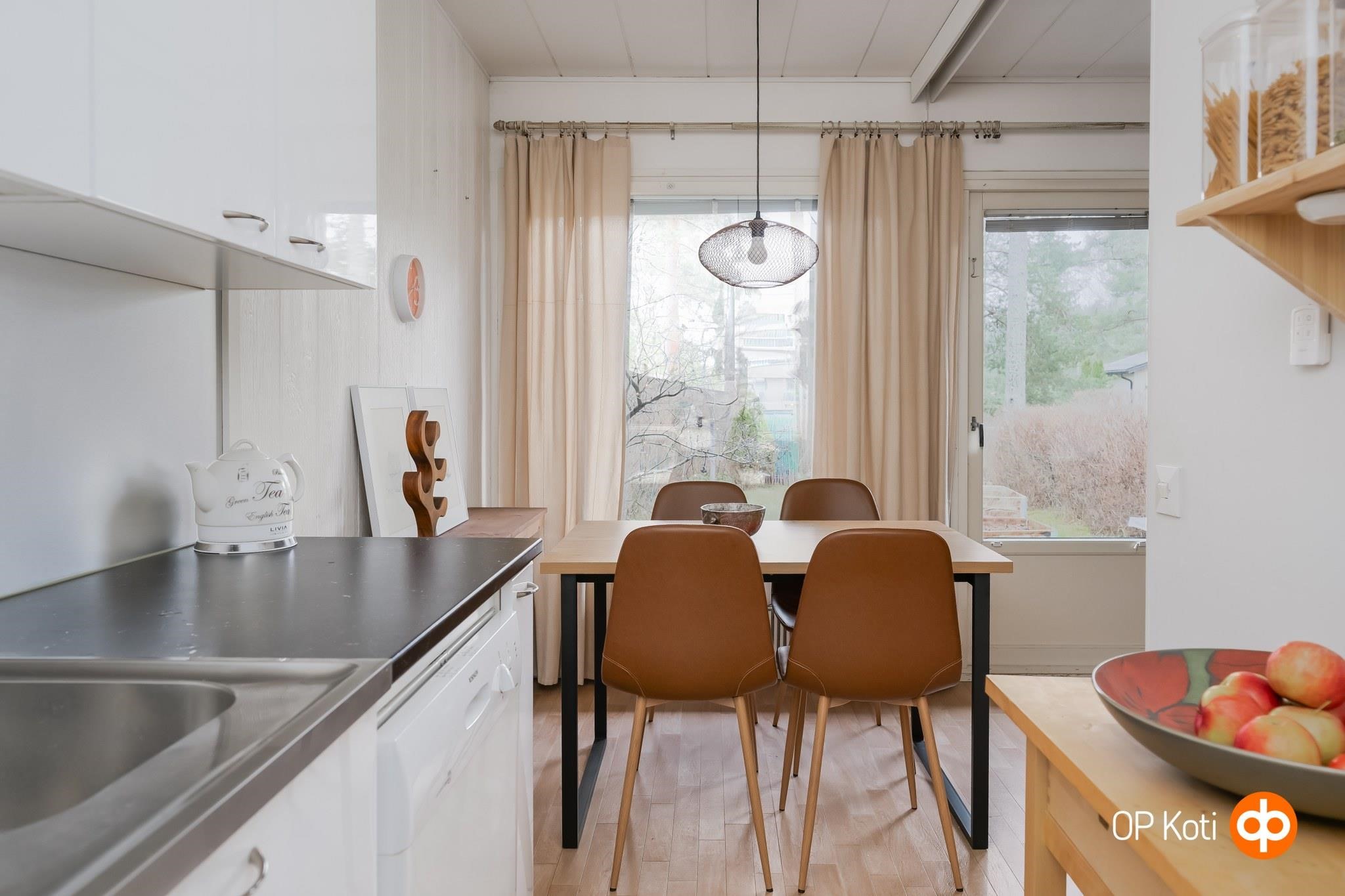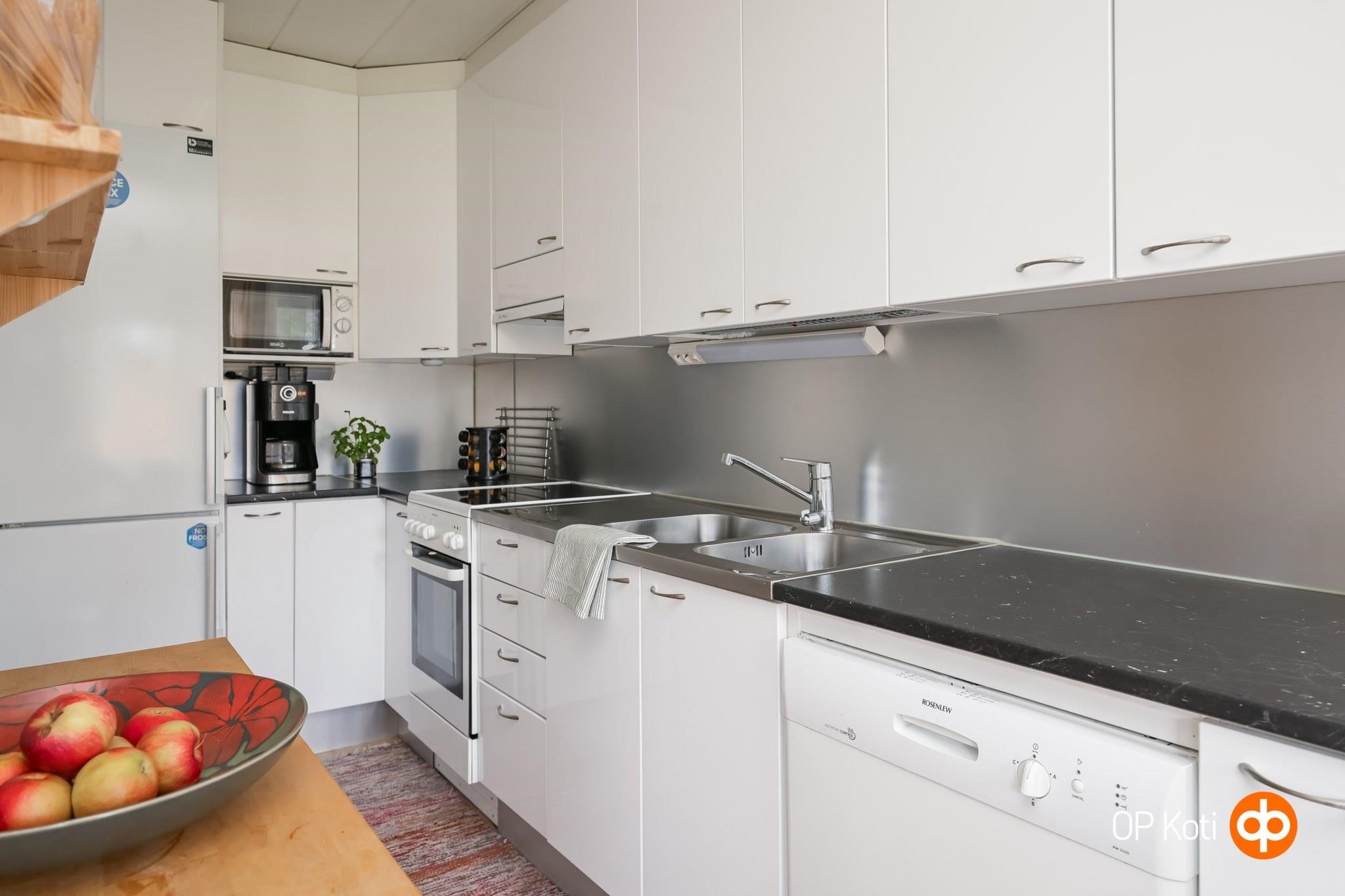 - Jääkaappipakastin, sähköliesi, keraaminen liesi, liesituuletin, astianpesukone, kaapistot, kiinteät valaisimet.