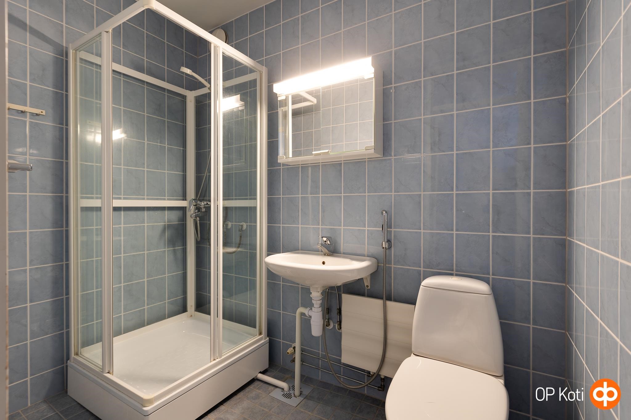 - Kylpyhuone, suihku, suihkukaappi, peilikaappi, pesukoneliitäntä (tulo), kiinteät valaisimet.